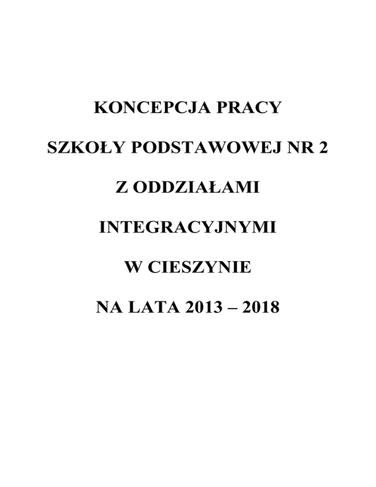 KONCEPCJA PRACY SZKOŁY PODSTAWOWEJ NR 2 Z ODDZIAŁAMI INTEGRACYJNYMI W CIESZYNIE NA LATA 2013 – 2018 MISJA SZKOŁY „KAŻDE DZIECKO UCZĄCE SIĘ W NASZEJ SZKOLE JEST KIMŚ WYJĄTKOWYM I CHCEMY, ABY TAK SIĘ CZUŁO” Nasza Szkoła: jest przyjazna i bezpieczna dla każdego ucznia, wspiera wszechstronny rozwój ucznia w zakresie nauczania i kształcenia umiejętności, pomaga wszystkim uczniom w pełnym rozwoju ich talentów, wspiera rodziców w wychowaniu dzieci, zapewnia jasne i obiektywne kryteria Szkolnego Systemu Oceniania, uwrażliwia na problemy otaczającego świata i drugiego człowieka – ODDZIAŁY INTEGRACYJNE, kształtuje aktywność ruchową i zdrowotną niezbędną w różnych przejawach działalności człowieka – KLASY SPORTOWE, prowadzi szeroki zakres działań lekcyjnych i pozalekcyjnych, dzięki którym uczniowie rozwijają swoje zainteresowania WIZJA ABSOLWENTA Nasz uczeń: zdobywa wiedzę do dalszego kształcenia, jest wrażliwy na dobro, tolerancję i piękno otaczającego świata, jest przywiązany do tradycji regionu, potrafi porozumieć się w języku angielskim, zna podstawy obsługi komputera, rozwija swoje zainteresowania i uzdolnienia na zajęciach pozalekcyjnych GŁÓWNE KIERUNKI PRACY SZKOŁY 1. Kształcenie 2. Wychowanie 3. Opieka i bezpieczeństwo 4. Zarządzanie i organizacja 5. Współpraca ze środowiskiem 6. Współpraca z rodzicami 7. Ekologia i zdrowie 8. Promocja szkoły 9. Nawiązanie do tradycji GŁÓWNE KIERUNKI REALIZACJI ZADAŃ KSZTAŁCENIE 1. Umożliwienie uczniom wszechstronnego rozwoju poprzez dostosowanie programów nauczania do ich potrzeb i możliwości. 2. Systematyczne analizowanie i modyfikowanie programów nauczania. 3. Indywidualizowanie zadań i wymagań wobec uczniów zgodnie z orzeczeniami i opiniami PPP. 4. Zapoznanie rodziców i uczniów z dokumentacją szkoły. 5. Wspieranie uczniów mających trudności w nauce poprzez organizowanie dodatkowych zajęć oraz pomoc pedagoga specjalnego. 6. Promowanie uczniów zdolnych, organizowanie kół zainteresowań, udział w konkursach. 7. Badanie osiągnięć edukacyjnych uczniów, analizowanie wyników sprawdzianów zewnętrznych w celu poprawy jakości kształcenia. Formułowanie i wdrażanie wniosków. 8. Stosowanie różnorodnych, nowatorskich metod i form pracy. Wprowadzanie innowacji oraz programów własnych. 9. Propagowanie zdrowego stylu życia poprzez działania sportowe oraz realizację programów promujących zdrowie. Organizowanie klas sportowych na drugim etapie edukacyjnym. 10. Realizowanie programów edukacyjnych oferowanych przez zewnętrzne instytucje rozwijające aktywność uczniów. 11. Organizowanie i realizacja procesów edukacyjnych poprzez ścisłą współpracę pomiędzy nauczycielami. WYCHOWANIE 1. Opracowanie Szkolnego Programu Wychowawczego i Szkolnego Programu Profilaktyki, a następnie ich realizacja i monitorowanie. 2. Spójnośc klasowych planów wychowawczych z programem szkoły. 3. Tworzenie regulaminów klasowych, kontraktów z uczniami. 4. Rozwijanie samorządności uczniów. 5. Analizowanie podejmowanych działań wychowawczych. 6. Wspomaganie rodziny w wychowywaniu dzieci. 7. Kształtowanie właściwych postaw społecznych, obywatelskich, rozwój kultury osobistej uczniów. 8. Eliminacja przejawów agresji i przemocy czynnej oraz biernej. 9. Współpraca z instytucjami, stowarzyszeniami i organizacjami. 10. Uwrażliwienie na potrzeby uczniów o specjalnych potrzebach edukacyjnych. 11. Udzielanie pomocy psychologiczno – pedagogicznej uczniom. 12. Wspołpraca nauczycieli w obrębie zespołów przedmiotowych i zespołów uczących w danym oddziale. OPIEKA I BEZPIECZEŃSTWO 1. Opieka nad dziećmi z orzeczeniem i opinią Poradni Psychologiczno – Pedagogicznej: dostosowywanie wymagań, metod, oceniania do możliwości uczniów respektowanie wskazań PPP stała współpraca z psychologiem, pedagogiem, logopedą oraz nauczycielami uczącymi daną klasę prowadzenie zajęć dydaktyczno – wyrównawczych 2. Diagnoza i monitoring obowiązku szkolnego: 3. podsumowywanie frekwencji monitorowanie nieobecności oraz spóźnień na lekcje uczniów współpraca z rodzicami i innymi nauczycielami kontrola nad przestrzeganiem regulaminu Organizacja opieki w czasie wolnym świetlica, koła zainteresowań, wyjścia edukacyjne, wycieczki, 4. Monitoring wizyjny i kontrola wejść do szkoły 5. Realizacja działań z zakresu profilaktyki zdrowia. 6. Zapewnienie opieki medycznej: pomoc pielęgniarki przeszkolona kadra badania profilaktyczne fluoryzacja dla każdego ucznia 7. Współpraca ze stowarzyszeniami i organizacjami: spotkania z policją i pogadanki dotyczące karalności nieletnich lekcje oraz dni otwarte szkoły wyjścia na zajęcia i warsztaty sporządzanie opinii do sądu, PPP ZARZĄDZANIE I ORGANIZACJA 1. Pozyskiwanie środków na doskonalenie zawodowe nauczycieli. 2. Zakup pomocy dydaktycznych. 3. Tworzenie klas sportowych. 4. Utworzenie placu zabaw dla klas 1-3. 5. Pozyskiwanie sponsorów na nowe inwestycje. 6. Wzbogacanie księgozbioru biblioteki szkolnej. 7. Wzbogacanie bazy szkoły w nowe meble, wyposażenie, sprzęt. 8. Współpraca z Gimnazjum nr 2 z Oddziałami Integracyjnymi. 9. Zapewnianie uczniom bogatej oferty zajęć pozalekcyjnych. 10. Zapewnienie uczniom bezpiecznego dojścia i dojazdu do szkoły. 11. Współpraca z instytucjami działającymi w środowisku lokalnym. 12. Organizacja nadzoru pedagogicznego i ewaluacji wewnetrznej. WSPÓŁPRACA ZE ŚRODOWISKIEM 1. Udział w obchodach uroczystości państwowych i lokalnych, imprezach kulturalnych i akcjach charytatywnych. 2. Współpraca z Poradnią Psychologiczno – Pedagogiczną, Policją, Sądem, Miejskim Ośrodkiem Pomocy Społecznej, Strażą Miejską, Towarzystwem Przyjaciól Dzieci, parafiami i stowarzyszeniami. 3. Dni otwarte szkoły oraz zajęcia otwarte dla przedszkolaków i ich rodziców. 4. Współpraca z uczelniami pedagogicznymi – udział w konferencjach, prowadzenie prakt