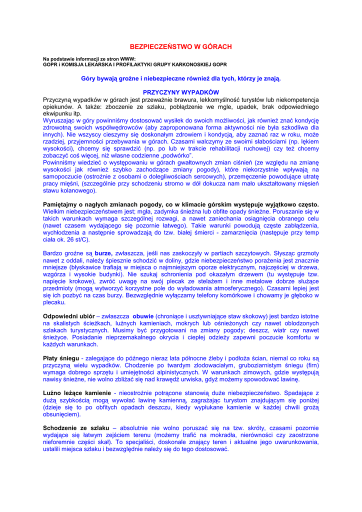 BEZPIECZEŃSTWO W GÓRACH Na podstawie informacji ze stron WWW: GOPR i KOMISJA LEKARSKA I PROFILAKTYKI GRUPY KARKONOSKIEJ GOPR Góry bywają groźne i niebezpieczne również dla tych, którzy je znają. PRZYCZYNY WYPADKÓW Przyczyną wypadków w górach jest przeważnie brawura, lekkomyślność turystów lub niekompetencja opiekunów. A także: zboczenie ze szlaku, pobłądzenie we mgle, upadek, brak odpowiedniego ekwipunku itp. Wyruszając w góry powinniśmy dostosować wysiłek do swoich możliwości, jak również znać kondycję zdrowotną swoich współwędrowców (aby zaproponowana forma aktywności nie była szkodliwa dla innych). Nie wszyscy cieszymy się doskonałym zdrowiem i kondycją, aby zaznać raz w roku, może rzadziej, przyjemności przebywania w górach. Czasami walczymy ze swoimi słabościami (np. lękiem wysokości), chcemy się sprawdzić (np. po lub w trakcie rehabilitacji ruchowej) czy też chcemy zobaczyć coś więcej, niż własne codzienne „podwórko”. Powinniśmy wiedzieć o występowaniu w górach gwałtownych zmian ciśnień (ze względu na zmianę wysokości jak również szybko zachodzące zmiany pogody), które niekorzystnie wpływają na samopoczucie (ostrożnie z osobami o dolegliwościach sercowych), przemęczenie powodujące utratę pracy mięśni, (szczególnie przy schodzeniu stromo w dół dokucza nam mało ukształtowany mięsień stawu kolanowego). Pamiętajmy o nagłych zmianach pogody, co w klimacie górskim występuje wyjątkowo często. Wielkim niebezpieczeństwem jest; mgła, zadymka śnieżna lub obfite opady śnieżne. Poruszanie się w takich warunkach wymaga szczególnej rozwagi, a nawet zaniechania osiągnięcia obranego celu (nawet czasem wydającego się pozornie łatwego). Takie warunki powodują częste zabłądzenia, wychłodzenia a następnie sprowadzają do tzw. białej śmierci - zamarznięcia (następuje przy temp ciała ok. 26 st/C). Bardzo groźne są burze, zwłaszcza, jeśli nas zaskoczyły w partiach szczytowych. Słysząc grzmoty nawet z oddali, należy śpiesznie schodzić w doliny, gdzie niebezpieczeństwo porażenia jest znacznie mniejsze (błyskawice trafiają w miejsca o najmniejszym oporze elektrycznym, najczęściej w drzewa, wzgórza i wysokie budynki). Nie szukaj schronienia pod okazałym drzewem (tu występuje tzw. napięcie krokowe), zwróć uwagę na swój plecak ze stelażem i inne metalowe dobrze służące przedmioty (mogą wytworzyć korzystne pole do wyładowania atmosferycznego). Czasami lepiej jest się ich pozbyć na czas burzy. Bezwzględnie wyłączamy telefony komórkowe i chowamy je głęboko w plecaku. Odpowiedni ubiór – zwłaszcza obuwie (chroniące i usztywniające staw skokowy) jest bardzo istotne na skalistych ścieżkach, luźnych kamieniach, mokrych lub ośnieżonych czy nawet oblodzonych szlakach turystycznych. Musimy być przygotowani na zmiany pogody; deszcz, wiatr czy nawet śnieżyce. Posiadanie nieprzemakalnego okrycia i ciepłej odzieży zapewni poczucie komfortu w każdych warunkach. Płaty śniegu - zalegające do późnego nieraz lata północne żleby i podłoża ścian, niemal co roku są przyczyną wielu wypadków. Chodzenie po twardym zlodowaciałym, gruboziarnistym śniegu (firn) wymaga dobrego sprzętu i umiejętności alpinistycznych. W warunkach zimowych, gdzie występują nawisy śnieżne, nie wolno zbliżać się nad krawędź urwiska, gdyż możemy spowodować lawinę. Luźno leżące kamienie - nieostrożnie potrącone stanowią duże niebezpieczeństwo. Spadające z dużą szybkością mogą wywołać lawinę kamienną, zagrażając turystom znajdującym się poniżej (dzieje się to po obfitych opadach deszczu, kiedy wypłukane kamienie w każdej chwili grożą obsunięciem). Schodzenie ze szlaku – absolutnie nie wolno poruszać się na tzw. skróty, czasami pozornie wydające się łatwym zejściem terenu (możemy trafić na mokradła, nierówności czy zaostrzone nieforemnie części skał). To specjaliści, doskonale znający teren i aktualne jego uwarunkowania, ustalili miejsca szlaku i bezwzględnie należy się do tego dostosować. Podstawowe zasady zachowania się w górskim terenie • • • • • • • • • • Na szlakach wędrujemy z dziećmi i młodzieżą zawsze w tzw. szyku „jeden za drugim”. Na początku i na końcu kolumny idzie osoba dorosła. Początek grupy stanowią osoby najmniej wprawione w pokonywaniu szlaków górskich, a na końcu grupy idą osoby silne i wytrzymałe kondycyjnie. Tempo marszu musi być dostosowane do wieku i kondycji uczestników wycieczki. Co pewien czas należy zarządzić odpoczynek. Na początku wycieczki robimy odpoczynki krótkie i często, a po przebyciu połowy trasy zatrzymujemy się na dłużej w celu spożycia posiłku. Grupy z zasady poruszają się wolniej, niż pojedyncze osoby, a odpoczynek grupy zajmuje często więcej czasu niż przewidujemy. Wyruszając w góry planujemy dokładnie trasę oraz czas pokonywania poszczególnych jej etapów. Jest to jeden z warunków udanej wyprawy w góry i zapewnia bezpieczeństwo jej uczestnikom. Wskazane jest, aby dojście do celu pokonać przed południem. Należy zasięgnąć informacji o terenie w który się udajemy i dokładnie zapoznać z mapą. Wycieczki w góry organizujemy w ciepłe, pogodne dni, zawsze jednak pamiętając o zabraniu ciepłego ubioru na kaprysy górskiej aury. Konieczne jest również dobre okrycie od deszczu. Wszystkie potrzebne rzeczy staramy się nieść w plecaku, który najlepiej nadaje się na górskie wędrówki. W plecaku powinno znaleźć się także (oprócz ubioru): okulary przeciwsłoneczne, latarka, pojemnik z piciem, inne niezbędne drobiazgi. Wycieczki w partie gór powyżej 600m n.p.m. wymagają odpowiedniego ubioru, skutecznie chroniącego przed wiatrem i chłodem, niezbędne jest także odpowiednie obuwie, o grubych, porowatych podeszwach. Wśród opiekunów, jest osoba posiadająca umiejętność udzielan
