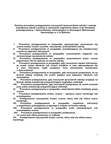 Szkolne procedury postępowania nauczycieli (pracowników szkoły) i metody współpracy szkoły z policją w sytuacjach zagrożenia dzieci oraz młodzieży przestępczością i demoralizacją, obowiązujące w Gimnazjum Mistrzostwa Sportowego nr 2 w Rybniku Procedura postępowania w przypadku agresywnego zachowania się ucznia wobec innych uczniów, nauczycieli, pracowników szkoły. II. Procedura postępowania w przypadku przedłużającej się nieobecności ucznia na zajęciach lekcyjnych. III. Procedura postępowania w przypadku uczniowskich wagarów czy samowolnego opuszczenia szkoły. IV. Procedura postępowania w przypadku przyniesienia przez ucznia papierosów lub ich palenia na terenie szkoły. V. Procedura postępowania w przypadku, gdy nauczyciel uzyska informacje, że uczeń używa alkoholu lub innych środków w celu wprowadzenia się w stan odurzenia, bądź przejawia inne zachowania świadczące o demoralizacji. VI. Procedura postępowania w przypadku, gdy nauczyciel podejrzewa, że na terenie szkoły znajduje się uczeń będący pod wpływem alkoholu lub narkotyków. VII. Procedura postępowania, gdy nauczyciel (pracownik szkoły) znajduje na terenie szkoły substancję przypominająca wyglądem narkotyk. VIII. Procedura postępowania, gdy nauczyciel podejrzewa, że uczeń posiada przy sobie substancję przypominająca narkotyk. IX. Procedura postępowania w przypadku stwierdzenia faktu kradzieży przez ucznia. X. Procedura postępowania wobec ucznia – sprawcy czynu karalnego lub przestępstwa. XI. Postępowanie nauczyciela wobec ucznia, który stał się ofiarą czynu karalnego. XII. Procedura postępowania w przypadku uzyskania informacji o popełnieniu przestępstwa ściganego z urzędu na terenie szkoły. XIII. Procedura postępowania w przypadku prób samobójczych lub samobójstwa ucznia. XIV. Procedura postępowania w przypadku podejrzenia, że uczeń jest ofiarą przemocy w rodzinie XV. Postępowanie nauczyciela wobec ucznia, który stał się ofiarą czynu karalnego. I. 1 I. Procedura postępowania w przypadku agresywnego zachowania się ucznia wobec innych uczniów, nauczycieli, pracowników szkoły. 1. Nauczyciel przerywa agresywne zachowanie ucznia (grupy uczniów). 2. Natychmiast informuje wychowawcę klasy lub pedagoga szkolnego o zdarzeniu. 3. Wychowawca lub pedagog szkolny przeprowadza rozmowę z uczniem/uczniami na temat zdarzenia, sporządza notatkę (opis zdarzenia, osoby uczestniczące, sprawca, poszkodowany). 4. Wychowawca informuje rodziców (opiekunów prawnych) ucznia/uczniów, uczestników zdarzenia o zaistniałej sytuacji (odnotowuje ten fakt w dzienniku). 5. W przypadku powtarzania się sytuacji wychowawca zgłasza ten fakt do pedagoga szkolnego oraz powiadamia dyrektora szkoły o przypadkach szczególnie drastycznych zachowań agresywnych (stwarzających zagrożenie dla zdrowia lub życia). 6. Wychowawca uczniów porozumieniu uczniów dyrektorem szkoły stosuje wobec ucznia/uczniów kary określone w Statucie Szkoły. II. Procedura postępowania w przypadku przedłużającej się nieobecności ucznia na zajęciach lekcyjnych. Działania wychowawcy: 1. Rodzic ma obowiązek poinformować szkołę o przyczynach nieobecności dziecka. 2. Jeżeli przez dwa tygodnie nie ma informacji od rodziców o przyczynach nieobecności dziecka wychowawca ma obowiązek rozpoznać przyczynę nieobecności ucznia w szkole, poprzez nawiązanie kontaktu z rodzicami, opiekunami prawnymi lub uczniem (telefon, wyjście do domu, list polecony z podpisem dyrektora szkoły). 3. Jeżeli nieobecność przedłuża się wychowawca zgłasza sprawę pedagogowi szkolnemu, poprzez wpis do zeszytu rejestru. Działania pedagoga szkolnego: 1. Pedagog przeprowadza rozmowę z rodzicami ucznia zobowiązując ich na piśmie do zapewnienia regularnego uczęszczania dziecka na zajęcia szkolne. 2. Pedagog zobowiązuje ucznia do regularnego uczęszczania na zajęcia szkolne na piśmie. 3. W przypadku niedotrzymania przez ucznia i rodziców pisemnego zobowiązania, pedagog wszczyna proces administracyjno- prawny (sąd rodzinny i nieletnich, wydział edukacji- organ prowadzący szkołę, może zawiadomić dzielnicowego). 2 III. Procedura postępowania w przypadku uczniowskich wagarów czy samowolnego opuszczenia szkoły. 1. Wychowawca na bieżąco powiadamia telefonicznie rodziców (opiekunów prawnych) o nieobecnościach ucznia na lekcjach. 2. Ustala we współpracy z pedagogiem szkolnym przyczynę wagarów i miejsca pobytu ucznia w czasie nieobecności w szkole. 3. Wzywa do szkoły rodziców (opiekunów prawnych) ucznia i przeprowadza rozmowę z rodzicami w obecności ucznia. Zobowiązuje ucznia do zaniechania wagarów lub samowolnego opuszczania szkoły, a rodziców do kontrolowania frekwencji dziecka. Ustala z rodzicami strategię postępowania. Sporządza notatkę z przeprowadzonej rozmowy podpisaną przez rodzica i ucznia (do teczki wychowawcy). 4. W przypadku braku poprawy i częstej nieobecności ucznia spowodowanej wagarami informuje o zdarzeniu pedagoga szkolnego. 5. Pedagog w porozumieniu z dyrektorem szkoły wzywa rodziców na rozmowę celem wyjaśnienia sytuacji i poinformowania rodziców (prawnych opiekunów) ucznia o konsekwencjach wynikających z nie realizacji obowiązku szkolnego przez dziecko. 6. W sytuacji, gdy szkoła wykorzysta wszystkie dostępne jej środki oddziaływań wychowawczych, a ich zastosowanie nie przynosi oczekiwanych rezultatów, dyrektor szkoły powiadamia pisemnie sąd rodzinny lub policję oraz organ prowadzący. IV. Procedura postępowania w przypadku przyniesienia przez ucznia papierosów lub ich palenia na terenie szkoły. 1. Osoba, która zauważy ucznia palącego papierosy na terenie szkoły powinna poinformować wychowawcę lub pedagoga szkolnego. 2. Wychowawca/pedagog szkolny w obecności innej osoby dorosłej ma prawo zażądać , aby uczeń przekazał mu papierosy, pokazał zawartość torby szkolnej oraz kieszeni we własnej odzieży. [Nauc