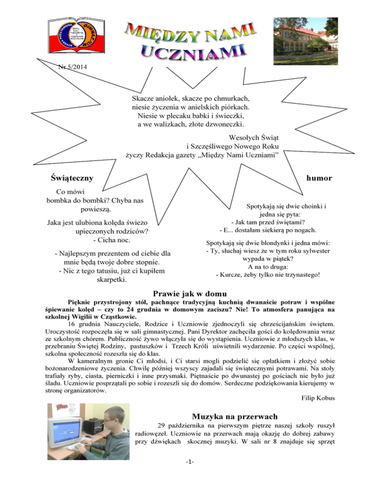 Nr 5/2014 Skacze aniołek, skacze po chmurkach, niesie życzenia w anielskich piórkach. Niesie w plecaku babki i świeczki, a we walizkach, złote dzwoneczki. Wesołych Świąt i Szczęśliwego Nowego Roku życzy Redakcja gazety „Między Nami Uczniami” Świąteczny humor Co mówi bombka do bombki? Chyba nas powieszą. Spotykają się dwie choinki i jedna się pyta: - Jak tam przed świętami? - E... dostałam siekierą po nogach. Jaka jest ulubiona kolęda świeżo upieczonych rodziców? - Cicha noc. Spotykają się dwie blondynki i jedna mówi: - Ty, słuchaj wiesz że w tym roku sylwester wypada w piątek? A na to druga: - Kurcze, żeby tylko nie trzynastego! - Najlepszym prezentem od ciebie dla mnie będą twoje dobre stopnie. - Nic z tego tatusiu, już ci kupiłem skarpetki. Prawie jak w domu Pięknie przystrojony stół, pachnące tradycyjną kuchnią dwanaście potraw i wspólne śpiewanie kolęd – czy to 24 grudnia w domowym zaciszu? Nie! To atmosfera panująca na szkolnej Wigilii w Cząstkowie. 16 grudnia Nauczyciele, Rodzice i Uczniowie zjednoczyli się chrześcijańskim świętem. Uroczystość rozpoczęła się w sali gimnastycznej. Pani Dyrektor zachęciła gości do kolędowania wraz ze szkolnym chórem. Publiczność żywo włączyła się do wystąpienia. Uczniowie z młodszych klas, w przebraniu Świętej Rodziny, pastuszków i Trzech Króli uświetnili wydarzenie. Po części wspólnej, szkolna społeczność rozeszła się do klas. W kameralnym gronie Ci młodsi, i Ci starsi mogli podzielić się opłatkiem i złożyć sobie bożonarodzeniowe życzenia. Chwilę później wszyscy zajadali się świątecznymi potrawami. Na stoły trafiały ryby, ciasta, pierniczki i inne przysmaki. Piętnaście po dwunastej po gościach nie było już śladu. Uczniowie posprzątali po sobie i rozeszli się do domów. Serdeczne podziękowania kierujemy w stronę organizatorów. Filip Kobus Muzyka na przerwach 29 października na pierwszym piętrze naszej szkoły ruszył radiowęzeł. Uczniowie na przerwach mają okazję do dobrej zabawy przy dźwiękach skocznej muzyki. W sali nr 8 znajduje się sprzęt -1- grający i każdy może zadedykować wybrany utwór. Można również przynieść swoją muzykę na płycie CD, DVD. Julia Bielecka, Jolanta Tyszka Wycieczka do Warszawy Gimnazjaliści z naszej szkoły 12 listopada udali się do kina Muranów na film Jana Komasy pt. „Miasto 44”. Wychowankowie z klas: pierwszej, drugiej i trzeciej, pod opieką pań: Karoliny Bartold, Edyty Bieleckiej i Eweliny Mery z uznaniem przyjęli tę produkcję, co swoje potwierdzenie znalazło recenzjach. Jedną z nich publikujemy na łamach dzisiejszego numeru. Zadowoleni gimnazjaliści w drodze powrotnej wstąpili na posiłek do restauracji McDonald’s na warszawskich Młocinach i przed godziną czternastą byli już w domu. Filip Kobus Recenzja filmu „Miasto 44” Film „Miasto 44” został wyreżyserowany przez Jana Komasę i miał swoją premierę 19 września 2014r. Jest to dramat wojenny, nad którym patronat objął Prezydent RP Bronisław Komorowski. Opowiada historię Stefana, który po śmierci ojca opiekuje się matką i młodszym bratem. Ciężki okres okupacji niemieckiej postanawia przeczekać, pracując i na prośbę matki nie angażuje się w konspirację. Jednak Kama, sąsiadka z kamienicy na Woli, wciąga go w szeregi Armii Krajowej. Niedługo potem Stefan poznaje „Biedronkę”, w której się zakochuje, opuszcza dom i razem z przyjaciółmi ze zgrupowania „Radosław” dołącza do powstańców. „Miasto 44” to świetna produkcja, do której kostiumy przygotowała Dorota Roqueplo, a mundury wojskowe Magdalena Rutkiewicz-Luterek. Za scenografię był odpowiedzialny Grzegorz Piątkowski i Marek Warszewski, natomiast dekoracją wnętrz zajmowały się Inga Palacz oraz Kinga Babczyńska. Muzykę skomponował Antoni Komasa-Łazarkiewicz. W rolę głównych bohaterów wcielili się: Józef Pawłowski (Stefan), Zofia Wichłacz („Biedronka”), Anna Próchniak (Kana), Antoni Królikowski („Beksa”), Filip Gurłacz („Rogal”), Michał Mikołajczak (Aleksander), Tomasz Schuchardt („Kobra”) i Monika Kwiatkowska (matka Stefana). „Miasto 44” trafnie oddaje atmosferę panującą podczas Powstania Warszawskiego, pokazuje tamte, pamiętne dni i, zdaniem świadków tych wydarzeń, nie odbiega od prawdy historycznej. To piękna historia o miłości, młodości i walce, zrealizowana z rozmachem scenicznym: do zainscenizowania zniszczonego miasta zużyto 5 tysięcy ton gruzu. Michał Domański Między Nami Uczniami Wydawca: Zespół Szkół Publicznych w Cząstkowie Mazowieckim Cząstków Mazowiecki 55 05-152 Czosnów Telefon kontaktowy: (22) 785-00-11 Zapraszamy do współpracy wszystkich Uczniów naszej szkoły. Propozycje tematów, Wasze materiały, ogłoszenia, listy i informacje można przesyłać na adres e-mail: [email protected] lub przekazywać osobiście do opiekuna redakcji lub redaktora naczelnego. Zespół redakcyjny: Filip Kobus (redaktor naczelny), Julia Bielecka, Jolanta Tyszka, Tomasz Cabaj Opiekun redakcji: Edyta Bielecka -2-