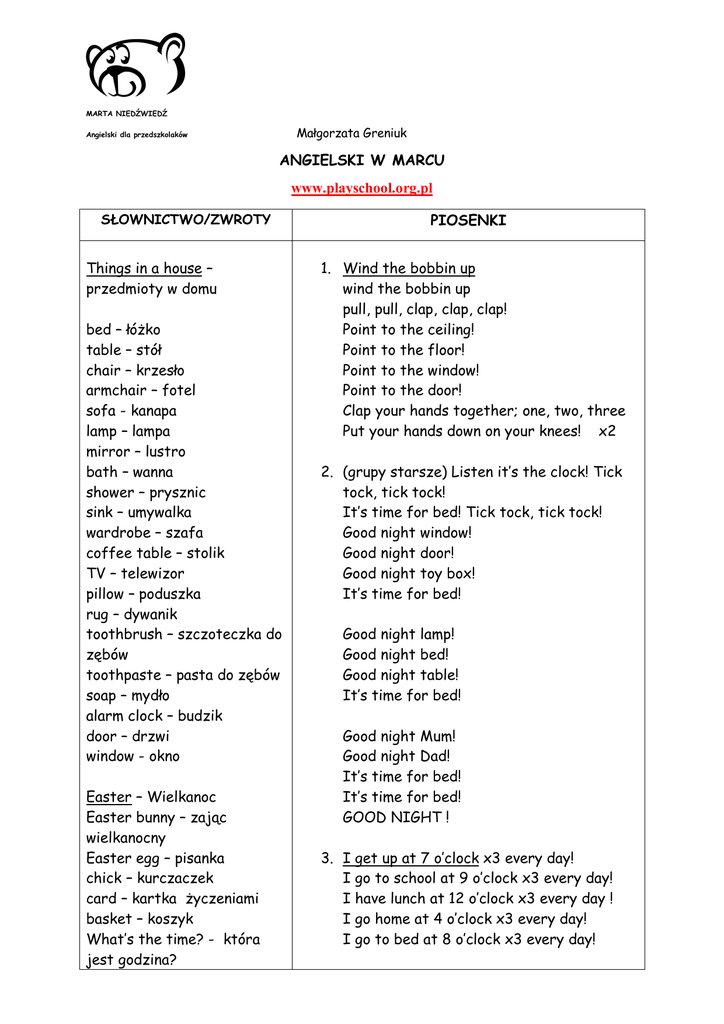 MARTA NIEDŹWIEDŹ Małgorzata Greniuk Angielski dla przedszkolaków ANGIELSKI W MARCU www.playschool.org.pl SŁOWNICTWO/ZWROTY Things in a house – przedmioty w domu bed – łóżko table – stół chair – krzesło armchair – fotel sofa - kanapa lamp – lampa mirror – lustro bath – wanna shower – prysznic sink – umywalka wardrobe – szafa coffee table – stolik TV – telewizor pillow – poduszka rug – dywanik toothbrush – szczoteczka do zębów toothpaste – pasta do zębów soap – mydło alarm clock – budzik door – drzwi window - okno Easter – Wielkanoc Easter bunny – zając wielkanocny Easter egg – pisanka chick – kurczaczek card – kartka życzeniami basket – koszyk What’s the time? - która jest godzina? PIOSENKI 1. Wind the bobbin up wind the bobbin up pull, pull, clap, clap, clap! Point to the ceiling! Point to the floor! Point to the window! Point to the door! Clap your hands together; one, two, three Put your hands down on your knees! x2 2. (grupy starsze) Listen it’s the clock! Tick tock, tick tock! It’s time for bed! Tick tock, tick tock! Good night window! Good night door! Good night toy box! It’s time for bed! Good night lamp! Good night bed! Good night table! It’s time for bed! Good night Mum! Good night Dad! It’s time for bed! It’s time for bed! GOOD NIGHT ! 3. I get up at 7 o’clock x3 every day! I go to school at 9 o’clock x3 every day! I have lunch at 12 o’clock x3 every day ! I go home at 4 o’clock x3 every day! I go to bed at 8 o’clock x3 every day!