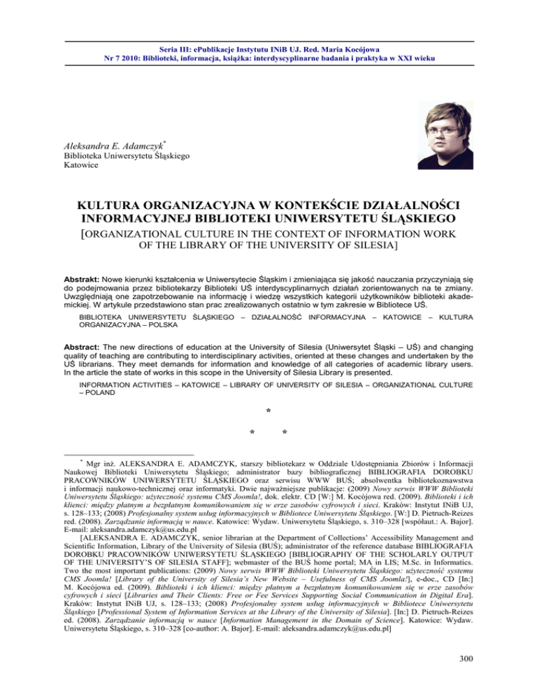 Seria III: ePublikacje Instytutu INiB UJ. Red. Maria Kocójowa Nr 7 2010: Biblioteki, informacja, książka: interdyscyplinarne badania i praktyka w XXI wieku Aleksandra E. Adamczyk* Biblioteka Uniwersytetu Śląskiego Katowice KULTURA ORGANIZACYJNA W KONTEKŚCIE DZIAŁALNOŚCI INFORMACYJNEJ BIBLIOTEKI UNIWERSYTETU ŚLĄSKIEGO [ORGANIZATIONAL CULTURE IN THE CONTEXT OF INFORMATION WORK OF THE LIBRARY OF THE UNIVERSITY OF SILESIA] Abstrakt: Nowe kierunki kształcenia w Uniwersytecie Śląskim i zmieniająca się jakość nauczania przyczyniają się do podejmowania przez bibliotekarzy Biblioteki UŚ interdyscyplinarnych działań zorientowanych na te zmiany. Uwzględniają one zapotrzebowanie na informację i wiedzę wszystkich kategorii użytkowników biblioteki akademickiej. W artykule przedstawiono stan prac zrealizowanych ostatnio w tym zakresie w Bibliotece UŚ. BIBLIOTEKA UNIWERSYTETU ŚLĄSKIEGO – DZIAŁALNOŚĆ INFORMACYJNA – KATOWICE – KULTURA ORGANIZACYJNA – POLSKA Abstract: The new directions of education at the University of Silesia (Uniwersytet Śląski – UŚ) and changing quality of teaching are contributing to interdisciplinary activities, oriented at these changes and undertaken by the UŚ librarians. They meet demands for information and knowledge of all categories of academic library users. In the article the state of works in this scope in the University of Silesia Library is presented. INFORMATION ACTIVITIES – KATOWICE – LIBRARY OF UNIVERSITY OF SILESIA – ORGANIZATIONAL CULTURE – POLAND * * * * Mgr inż. ALEKSANDRA E. ADAMCZYK, starszy bibliotekarz w Oddziale Udostępniania Zbiorów i Informacji Naukowej Biblioteki Uniwersytetu Śląskiego; administrator bazy bibliograficznej BIBLIOGRAFIA DOROBKU PRACOWNIKÓW UNIWERSYTETU ŚLĄSKIEGO oraz serwisu WWW BUŚ; absolwentka bibliotekoznawstwa i informacji naukowo-technicznej oraz informatyki. Dwie najważniejsze publikacje: (2009) Nowy serwis WWW Biblioteki Uniwersytetu Śląskiego: użyteczność systemu CMS Joomla!, dok. elektr. CD [W:] M. Kocójowa red. (2009). Biblioteki i ich klienci: między płatnym a bezpłatnym komunikowaniem się w erze zasobów cyfrowych i sieci. Kraków: Instytut INiB UJ, s. 128–133; (2008) Profesjonalny system usług informacyjnych w Bibliotece Uniwersytetu Śląskiego. [W:] D. Pietruch-Reizes red. (2008). Zarządzanie informacją w nauce. Katowice: Wydaw. Uniwersytetu Śląskiego, s. 310–328 [współaut.: A. Bajor]. E-mail: [email protected] [ALEKSANDRA E. ADAMCZYK, senior librarian at the Department of Collections’ Accessibility Management and Scientific Information, Library of the University of Silesia (BUŚ); administrator of the reference database BIBLIOGRAFIA DOROBKU PRACOWNIKÓW UNIWERSYTETU ŚLĄSKIEGO [BIBLIOGRAPHY OF THE SCHOLARLY OUTPUT OF THE UNIVERSITY’S OF SILESIA STAFF]; webmaster of the BUŚ home portal; MA in LIS; M.Sc. in Informatics. Two the most important publications: (2009) Nowy serwis WWW Biblioteki Uniwersytetu Śląskiego: użyteczność systemu CMS Joomla! [Library of the University of Silesia’s New Website – Usefulness of CMS Joomla!], e-doc., CD [In:] M. Kocójowa ed. (2009). Biblioteki i ich klienci: między płatnym a bezpłatnym komunikowaniem się w erze zasobów cyfrowych i sieci [Libraries and Their Clients: Free or Fee Services Supporting Social Communication in Digital Era]. Kraków: Instytut INiB UJ, s. 128–133; (2008) Profesjonalny system usług informacyjnych w Bibliotece Uniwersytetu Śląskiego [Professional System of Information Services at the Library of the University of Silesia]. [In:] D. Pietruch-Reizes ed. (2008). Zarządzanie informacją w nauce [Information Management in the Domain of Science]. Katowice: Wydaw. Uniwersytetu Śląskiego, s. 310–328 [co-author: A. Bajor]. E-mail: [email protected]] 300 Seria III: ePublikacje Instytutu INiB UJ. Red. Maria Kocójowa Nr 7 2010: Biblioteki, informacja, książka: interdyscyplinarne badania i praktyka w XXI wieku Zmiany społeczno-ekonomiczne zachodzące zarówno na świecie, jak i w naszym kraju nieustannie nadają kierunek zadaniom wypełnianym przez biblioteki naukowe. W Bibliotece Uniwersytetu Śląskiego (BUŚ) podjęto szereg inicjatyw w tym zakresie. Wśród nich znalazły się działania na rzecz podniesienia umiejętności funkcjonowania w społeczeństwie wiedzy, zaadresowane do wszystkich grup użytkowników akademickiej książnicy. Wprowadza się także elementy procesu zarządzania wiedzą opartego na kulturze organizacyjnej [Bajor, Adamczyk 2008, s. 311–327]. KULTURA ORGANIZACYJNA W REALIZACJI PROJEKTÓW Motorem działań o charakterze interdyscyplinarnym stały się nowe kierunki kształcenia w Uniwersytecie Śląskim oraz zmieniająca się jakość nauczania. Znaczący wpływ na realizację nowej koncepcji organizacyjnej mają projekty realizowane w całości przez BUŚ lub współtworzone przez nią. W celu stworzenia nowoczesnego regionalnego centrum informacji naukowej i ekonomicznej realizowany jest – wspólnie z Biblioteką Akademii Ekonomicznej – projekt CINiBA (Centrum Informacji Naukowej i Biblioteka Akademicka). Przedsięwzięcie to ma na celu doprowadzenie do uruchomienia nowoczesnej biblioteki naukowej, która spełniać będzie standardy XXI wieku, dotyczące: udostępniania informacji niezbędnej do realizacji programów studiów obu uczelni, poprawy jakości nauczania przez zwiększenie potencjału badawczego oraz zwiększenia dostępności literatury naukowej w regionie [Pawelec, Witek, Smyłła, Zięba 2009, dok. elektr.]. Kierownikiem projektu jest prof. Dariusz Pawelec – Dyrektor BUŚ, biurem projektu CINiBA kieruje Joanna Czakon (BUŚ), sprawami inwestycyjnymi zajmuje się Stefan Mucha (Dział Rozwoju i Modernizacji Infrastruktury Uczelnianej UŚ), funkcję rzecznika projektu pełni Jadwiga Witek (BUŚ). 20 lipca 2006 r. na mocy porozumienia pomiędzy Biblioteką Śląską a Uniwersytetem Śląskim została utworzona „Śląska