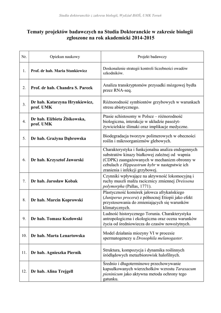 Studia doktoranckie z zakresu biologii, Wydział BiOŚ, UMK Toruń Tematy projektów badawczych na Studia Doktoranckie w zakresie biologii zgłoszone na rok akademicki 2014-2015 Nr. Opiekun naukowy Projekt badawczy 1. Prof. dr hab. Maria Stankiewicz Doskonalenie strategii kontroli liczebności owadów szkodników. 2. Prof. dr hab. Chandra S. Pareek Analiza transkryptomów przysadki mózgowej bydła przez RNA-seq. 3. Dr hab. Katarzyna Hrynkiewicz, prof. UMK Różnorodność symbiontów grzybowych w warunkach stresu abiotycznego. 4. Dr hab. Elżbieta Żbikowska, prof. UMK Ptasie schistosomy w Polsce – różnorodność biologiczna, interakcje w układzie pasożytżywicielskie ślimaki oraz implikacje medyczne. 5. Dr hab. Grażyna Dąbrowska Biodegradacja tworzyw polimerowych w obecności roślin i mikroorganizmów glebowych. Charakterystyka i funkcjonalna analiza endogennych substratów kinazy białkowej zależnej od wapnia (CDPK) zaangażowanych w mechanizm obronny w cebulach z Hippeastrum hybr w następstwie ich zranienia i infekcji grzybowej. Czynniki wpływające na aktywność lokomocyjną i ruchy muszli małża racicznicy zmiennej Dreissena polymorpha (Pallas, 1771). Plastyczność komórek jałowca afrykańskiego (Juniperus procera) z północnej Etiopii jako efekt przystosowania do zmieniających się warunków klimatycznych. Ludność historycznego Torunia. Charakterystyka antropologiczna i ekologiczna oraz ocena warunków życia od średniowiecza do czasów nowożytnych. 6. Dr hab. Krzysztof Jaworski 7. Dr hab. Jarosław Kobak 8. Dr hab. Marcin Koprowski 9. Dr hab. Tomasz Kozłowski 10. Dr hab. Marta Lenartowska Model działania miozyny VI w procesie spermatogenezy u Drosophila melanogaster. 11. Dr hab. Agnieszka Piernik Struktura, kompozycja i dynamika roślinnych śródlądowych metazbiorowisk halofilnych. Dr hab. Alina Trejgell Średnio i długoterminowe przechowywanie kapsułkowanych wierzchołków wzrostu Taraxacum pieninicum jako aktywna metoda ochrony tego gatunku. 12. 13. Dr hab. Jacek Kęsy Udział mikro RNA w szlaku transdukcji sygnału auksyn w kontroli rozwoju organów generatywnych łubinu żółtego. 14. Dr hab. Maciej Walczak Występowanie, liczebność i właściwości mikroorganizmów zasiedlających wody głębinowe.