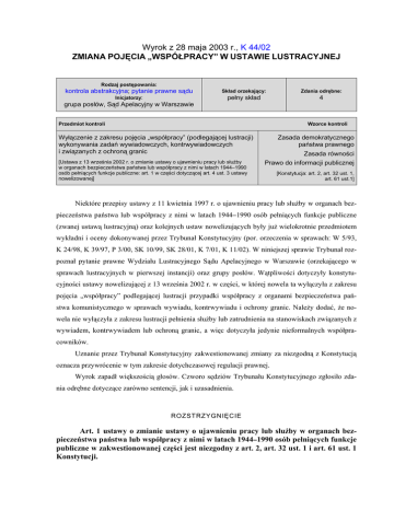 Wyrok z 28 maja 2003 r., K 44/02 ZMIANA POJĘCIA „WSPÓŁPRACY” W USTAWIE LUSTRACYJNEJ Rodzaj postępowania: kontrola abstrakcyjna; pytanie prawne sądu Inicjatorzy: grupa posłów, Sąd Apelacyjny w Warszawie Skład orzekający: Zdania odrębne: pełny skład 4 Przedmiot kontroli Wzorce kontroli Wyłączenie z zakresu pojęcia „współpracy” (podlegającej lustracji) wykonywania zadań wywiadowczych, kontrwywiadowczych i związanych z ochroną granic [Ustawa z 13 września 2002 r. o zmianie ustawy o ujawnieniu pracy lub służby w organach bezpieczeństwa państwa lub współpracy z nimi w latach 1944–1990 osób pełniących funkcje publiczne: art. 1 w części dotyczącej art. 4 ust. 3 ustawy nowelizowanej] Zasada demokratycznego państwa prawnego Zasada równości Prawo do informacji publicznej [Konstytucja: art. 2, art. 32 ust. 1, art. 61 ust.1] Niektóre przepisy ustawy z 11 kwietnia 1997 r. o ujawnieniu pracy lub służby w organach bezpieczeństwa państwa lub współpracy z nimi w latach 1944–1990 osób pełniących funkcje publiczne (zwanej ustawą lustracyjną) oraz kolejnych ustaw nowelizujących były już wielokrotnie przedmiotem wykładni i oceny dokonywanej przez Trybunał Konstytucyjny (por. orzeczenia w sprawach: W 5/93, K 24/98, K 39/97, P 3/00, SK 10/99, SK 28/01, K 7/01, K 11/02). W niniejszej sprawie Trybunał rozpoznał pytanie prawne Wydziału Lustracyjnego Sądu Apelacyjnego w Warszawie (orzekającego w sprawach lustracyjnych w pierwszej instancji) oraz grupy posłów. Wątpliwości dotyczyły konstytucyjności ustawy nowelizującej z 13 września 2002 r. w części, w której nowela ta wyłączyła z zakresu pojęcia „współpracy” podlegającej lustracji przypadki współpracy z organami bezpieczeństwa państwa komunistycznego w sprawach wywiadu, kontrwywiadu i ochrony granic. Należy dodać, że nowela nie wyłączyła z zakresu lustracji pełnienia służby lub zatrudnienia na stanowiskach związanych z wywiadem, kontrwywiadem lub ochroną granic, a więc dotyczyła jedynie nieformalnych współpracowników. Uznanie przez Trybunał Konstytucyjny zakwestionowanej zmiany za niezgodną z Konstytucją oznacza przywrócenie w tym zakresie dotychczasowej regulacji prawnej. Wyrok zapadł większością głosów. Czworo sędziów Trybunału Konstytucyjnego zgłosiło zdania odrębne dotyczące zarówno sentencji, jak i uzasadnienia. ROZSTRZYGNIĘCIE Art. 1 ustawy o zmianie ustawy o ujawnieniu pracy lub służby w organach bezpieczeństwa państwa lub współpracy z nimi w latach 1944–1990 osób pełniących funkcje publiczne w zakwestionowanej części jest niezgodny z art. 2, art. 32 ust. 1 i art. 61 ust. 1 Konstytucji. 2 GŁÓWNE TEZY UZASADNIENIA 1. Zasada ciągłości Państwa Polskiego nie oznacza ciągłości aksjologicznych podstaw państwowości i systemu prawnego obowiązujących przed i po politycznym przełomie 1989 roku. Konstytucyjnym wyrazem braku takiej ciągłości była uchwalona 29 grudnia 1989 r. nowelizacja Konstytucji, znosząca wszelkie odniesienia obowiązującego prawa i funkcjonujących na jego gruncie instytucji państwowych do wartości, na których oparty był system konstytucyjny istniejący w Polsce w latach 1944–1989. 2. Procedura lustracji, przewidziana w ustawie z dnia 11 kwietnia 1997 r. o ujawnieniu pracy lub służby w organach bezpieczeństwa państwa lub współpracy z nimi w latach 1944– 1990 osób pełniących funkcje publiczne, jest mechanizmem badania prawdziwości oświadczeń o istnieniu określonych związków i zależności osób piastujących lub też kandydujących do zajmowania stanowisk publicznych, z którymi związana jest szczególna odpowiedzialność. Z woli ustawodawcy oceniany nagannie i obłożony sankcją jest nie fakt współpracy z organami bezpieczeństwa w latach 1944–1989, lecz zatajenie takiej współpracy w składanym obowiązkowo oświadczeniu lustracyjnym. Celem tego unormowania jest doprowadzenie do stanu, w którym najważniejsze funkcje publiczne pełnione będą przez osoby prawdomówne, a przez to godne zaufania. 3. Z wyrażonej w art. 2 Konstytucji zasady demokratycznego państwa prawa wynika wymóg jasności i określoności przepisów prawnych, tak aby adresat normy prawnej wiedział, które zachowania i z jakich powodów mają znaczenie prawne. Wymaganie to ma szczególną wagę w kontekście lustracji, ponieważ błędne przekonanie o prawdziwości oświadczenia lustracyjnego może narażać osobę lustrowaną na określone sankcje. 4. Zaskarżona regulacja, wprowadzająca swego rodzaju kontratyp „współpracy” – wyłączenie z zakresu tego pojęcia wykonywania „zadań wywiadowczych”, „zadań kontrwywiadowczych” i „zadań dla ochrony granic” – nie odpowiada powyższemu wymaganiu. Z dokumentacji prac legislacyjnych wynika, że z jednej strony chodziło o to, aby formalna współpraca z wywiadem lub kontrwywiadem nie była podstawą automatycznego uniknięcia lustracji, z drugiej strony o to, aby uniknęli lustracji wszyscy tajni współpracownicy jakichkolwiek komórek organów bezpieczeństwa, o ile przekazywane informacje uznają oni za należące do zadań wywiadowczych, kontrwywiadowczych i dla ochrony granic. Taka konstrukcja musi prowadzić do zasadniczej niepewności oceny własnych zachowań, dokonywanej przez każdego współpracownika organów bezpieczeństwa, a w konsekwencji wiąże się z ryzykiem, iż ocena ta będzie potem odmiennie kwalifikowana przez Rzecznika Interesu Publicznego i Sąd lustracyjny. 5. Istotą zasady równości (art. 32 ust. 1 Konstytucji) jest to, że wszyscy adresaci norm prawnych charakteryzujący się daną cechą relewantną winni być traktowani według jednakowej miary, bez zróżnicowań zarówno dyskryminujących, jak i faworyzujących. Zasada równości nie wyklucza różnego traktowania podmiotów różniących się między sobą. Zróżnicowanie traktowania poszczególnych grup podmiotów musi być jed