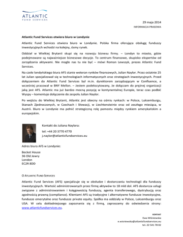 29 maja 2014 INFORMACJA PRASOWA Atlantic Fund Services otwiera biuro w Londynie Atlantic Fund Services otwiera biuro w Londynie. Polska firma oferująca obsługę funduszy inwestycyjnych wchodzi na kolejny, ósmy rynek. Oddział w Wielkiej Brytanii skupi się na rozwoju biznesu firmy. – Londyn to miasto, gdzie podejmowane są najważniejsze biznesowe decyzje. To centrum finansowe, skupisko ekspertów od zarządzania aktywami. Nie mogło nas tu nie być – mówi Roman Lewszyk, prezes Atlantic Fund Services. Na czele londyńskiego biura AFS stanie weteran rynków finansowych, Julian Naylor. Przez ostatnie 25 lat Julian specjalizował się w technologiach informatycznych oraz strategiach inwestycyjnych. Przed dołączeniem do Atlantic Fund Services był m.in. dyrektorem zarządzającym w Confluence, a wcześniej pracował w BNY Mellon. – Jestem podekscytowany, że dołączam do prężnej organizacji jaką jest AFS. Atlantic ma już bardzo mocną pozycję w kontynentalnej Europie, teraz czas podbić Wyspy – komentuje dołączenie do zespołu Julian Naylor. Po wejściu do Wielkiej Brytanii, Atlantic jest obecny na ośmiu rynkach: w Polsce, Luksemburgu, Stanach Zjednoczonych, w Czechach i Słowacji, w Liechtensteinie oraz od zeszłego miesiąca, w Austrii. Biuro w Londynie ma pełnić strategiczną rolę pomostu między rynkiem amerykańskim a europejskim. Kontakt do Juliana Naylora: tel: +44 20 3770 4770 [email protected] Adres biura AFS w Londynie: Becket House 36 Old Jewry London EC2R 8DD O ATLANTIC FUND SERVICES Atlantic Fund Services (AFS) specjalizuje się w obsłudze i dostarczaniu technologii dla funduszy inwestycyjnych. Wartość administrowanych przez firmę aktywów to 18 mld dol. AFS dostarcza usługi związane z administrowaniem i księgowością funduszy, agenta transferowego, dystrybucją oraz zgodnością prawną (compliance). Klientami AFS są tradycyjne i alternatywne fundusze inwestycyjne, fundusze emerytalne oraz fundusze private equity. Spółka ma oddziały w Polsce, Luksemburgu oraz USA. W celu dokładniejszego zapoznania się z firmą, zapraszamy do odwiedzenia strony: www.atlanticfundservices.eu. KONTAKT Ewa Wiśniewska [email protected] tel. 22 541 78 02