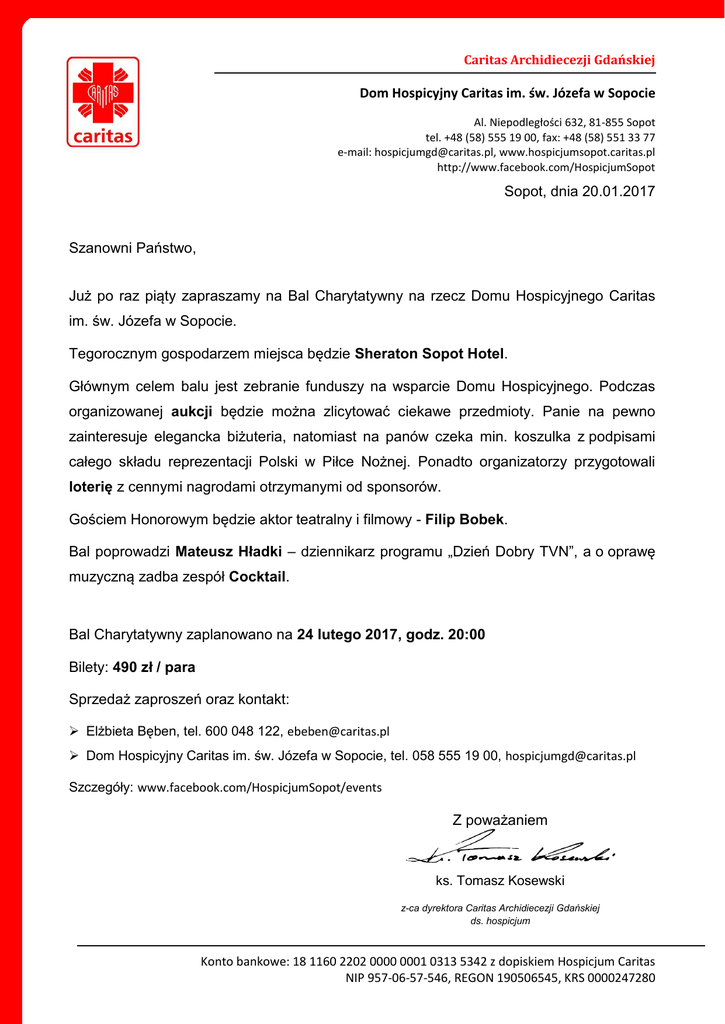 Caritas Archidiecezji Gdańskiej Dom Hospicyjny Caritas im. św. Józefa w Sopocie Al. Niepodległości 632, 81-855 Sopot tel. +48 (58) 555 19 00, fax: +48 (58) 551 33 77 e-mail: [email protected], www.hospicjumsopot.caritas.pl http://www.facebook.com/HospicjumSopot Sopot, dnia 20.01.2017 Szanowni Państwo, Już po raz piąty zapraszamy na Bal Charytatywny na rzecz Domu Hospicyjnego Caritas im. św. Józefa w Sopocie. Tegorocznym gospodarzem miejsca będzie Sheraton Sopot Hotel. Głównym celem balu jest zebranie funduszy na wsparcie Domu Hospicyjnego. Podczas organizowanej aukcji będzie można zlicytować ciekawe przedmioty. Panie na pewno zainteresuje elegancka biżuteria, natomiast na panów czeka min. koszulka z podpisami całego składu reprezentacji Polski w Piłce Nożnej. Ponadto organizatorzy przygotowali loterię z cennymi nagrodami otrzymanymi od sponsorów. Gościem Honorowym będzie aktor teatralny i filmowy - Filip Bobek. Bal poprowadzi Mateusz Hładki – dziennikarz programu „Dzień Dobry TVN”, a o oprawę muzyczną zadba zespół Cocktail. Bal Charytatywny zaplanowano na 24 lutego 2017, godz. 20:00 Bilety: 490 zł / para Sprzedaż zaproszeń oraz kontakt: Elżbieta Bęben, tel. 600 048 122, [email protected] Dom Hospicyjny Caritas im. św. Józefa w Sopocie, tel. 058 555 19 00, [email protected] Szczegóły: www.facebook.com/HospicjumSopot/events Z poważaniem ks. Tomasz Kosewski z-ca dyrektora Caritas Archidiecezji Gdańskiej ds. hospicjum Konto bankowe: 18 1160 2202 0000 0001 0313 5342 z dopiskiem Hospicjum Caritas NIP 957-06-57-546, REGON 190506545, KRS 0000247280