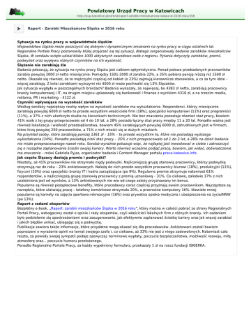 Powiatowy Urząd Pracy w Katowicach http://pup.katowice.pl/strona/raport-zarobki-mieszkancow-slaska-w-2016-roku/358 Raport - Zarobki Mieszkańców Śląska w 2016 roku Sytuacja na rynku pracy w województwie śląskim Województwo śląskie może poszczycić się dobrymi i dynamicznymi zmianami na rynku pracy w ciągu ostatnich lat. Regionalne Portale Pracy postanowiły bliżej przyjrzeć się tej sytuacji, dlatego zorganizowały badanie zarobków mieszkańców Śląska. W sondażu wzięło udział blisko 1000 aktywnych zawodowo osób z regionu. Pytania dotyczyły zarobków, premii, podwyżek oraz wypływu różnych czynników na ich wysokość. Ślężanie nie zarabiają źle Badania pokazują, że sytuacja na rynku pracy Śląska jest całkiem optymistyczna. Ponad połowa przebadanych pracowników zarabia powyżej 2000 zł netto miesięcznie. Pomiędzy 1501-2000 zł zarabia 22%, a 25% pobiera pensję niższą niż 1500 zł netto. Okazało się również, że to mężczyźni częściej od kobiet (o 23%) zajmują kierownicze stanowiska, a co za tym idzie – więcej zarabiają. Z kolei zarobkami wyższymi niż 4000 zł może pochwalić się 13% Ślęzaków. Jak sytuacja wygląda w poszczególnych branżach? Badania wykazały, że najwięcej, bo 4383 zł netto, zarabiają pracownicy branży komputerowej i IT, na drugim miejscu uplasowały się bankowość i finanse z wynikiem 4316 zł, a na trzecim media, reklama, PR i marketing – 4122 zł. Czynniki wpływające na wysokość zarobków Według sondaży największy realny wpływ na wysokość zarobków ma wykształcenie. Respondenci, którzy miesięcznie zarabiają powyżej 6000 zł netto to przede wszystkim właściciele firm (18%), specjaliści komputerowi (11%) oraz programiści (11%), a 37% z nich ukończyło studia na kierunkach technicznych. Nie bez znaczenia pozostaje również staż pracy, bowiem 41% osób z tej grupy przepracowało od 4 do 10 lat, a 28% posiada łączny staż pracy między 11 a 20 lat. Ponadto ważna jest również lokalizacja i wielkość przedsiębiorstwa, bowiem 45% zarabiających powyżej 6000 zł, zatrudnionych jest w firmach, które liczą powyżej 250 pracowników, a 71% z nich mieści się w dużych miastach. Na przykład osoby, które zarabiają poniżej 1361 zł – 15% – to przede wszystkim te, które nie posiadają wyższego wykształcenia (34%). Ponadto posiadają niski staż pracy – 35% z nich przepracowało od 1 do 3 lat, a 28% na dzień badania nie miało przepracowanego nawet roku. Sondaż wyraźnie pokazuje więc, że najlepiej jest inwestować w siebie i zatroszczyć się o rozsądne zaplanowanie ścieżki swojej kariery. Warto również wcześnie podjąć pracę, bowiem, jak widać, doświadczenie ma znaczenie – mówi Gabriela Pyjas, organizator badania i Content Manager portalu praca-katowice.info. Jak często Ślązacy dostają premie i podwyżki? Niestety, aż 41% pracowników nie otrzymało nigdy podwyżki. Najliczniejszą grupę stanowią pracownicy, którzy podwyżkę otrzymują raz do roku – 23% ankietowanych. Należą do nich przede wszystkim pracownicy biurowi (18%), produkcyjni (11%), fizyczni (10%) oraz specjaliści branży IT i kadra zarządzająca (po 9%). Regularne premie otrzymuje natomiast 61% respondentów, a najliczniejszą grupę stanowią pracownicy z premią uznaniową – 31%. Co ciekawe, zaledwie 17% z nich uzależniona jest od wyników, a 13% ankietowanych nie wie od czego zależy przyznawany im bonus. Popularne są również pozapłacowe benefity, które pracodawcy coraz częściej przyznają swoim pracownikom. Najczęstsze są narzędzia, które ułatwiają pracę – telefony komórkowe otrzymało 20%, a przenośne komputery 16%. Niewiele mniej popularne są karnety na zajęcia sportowo-rekreacyjne (16%) oraz prywatna opieka medyczna i ubezpieczenia na życie/NNW (po 13%). Raport z radami ekspertów Bezpłatny e-book, „Raport: zarobki mieszkańców Śląska w 2016 roku”, który można w całości pobrać ze strony Regionalnych Portali Pracy, wzbogacony został o opinie i rady ekspertów, czyli właścicieli lokalnych firm z różnych branży. Ich zadaniem było podzielenie się spostrzeżeniami oraz zasugerowanie, jak efektywnie zaplanować ścieżkę kariery oraz jak więcej zarabiać i jakich błędów unikać, ubiegając się o podwyżkę. Publikacja zawiera także informacje, które przydatne mogą okazać się dla pracodawców. Ankietowani zostali bowiem poproszeni o wyrażenie opinii na temat swojego szefa i, co ciekawe, aż 33% nie jest z niego zadowolonych. Natomiast cała reszta, za powody swojej sympatii podaje zazwyczaj: terminowe wypłaty, poczucie bezpieczeństwa, możliwość rozwoju, miłą atmosferę oraz... poczucie humoru przełożonego. Ponadto Regionalne Portale Pracy, za każdy wypełniony formularz, przekazały 1 zł na rzecz fundacji ISKIERKA.