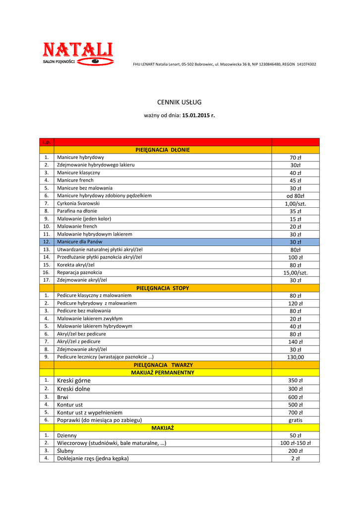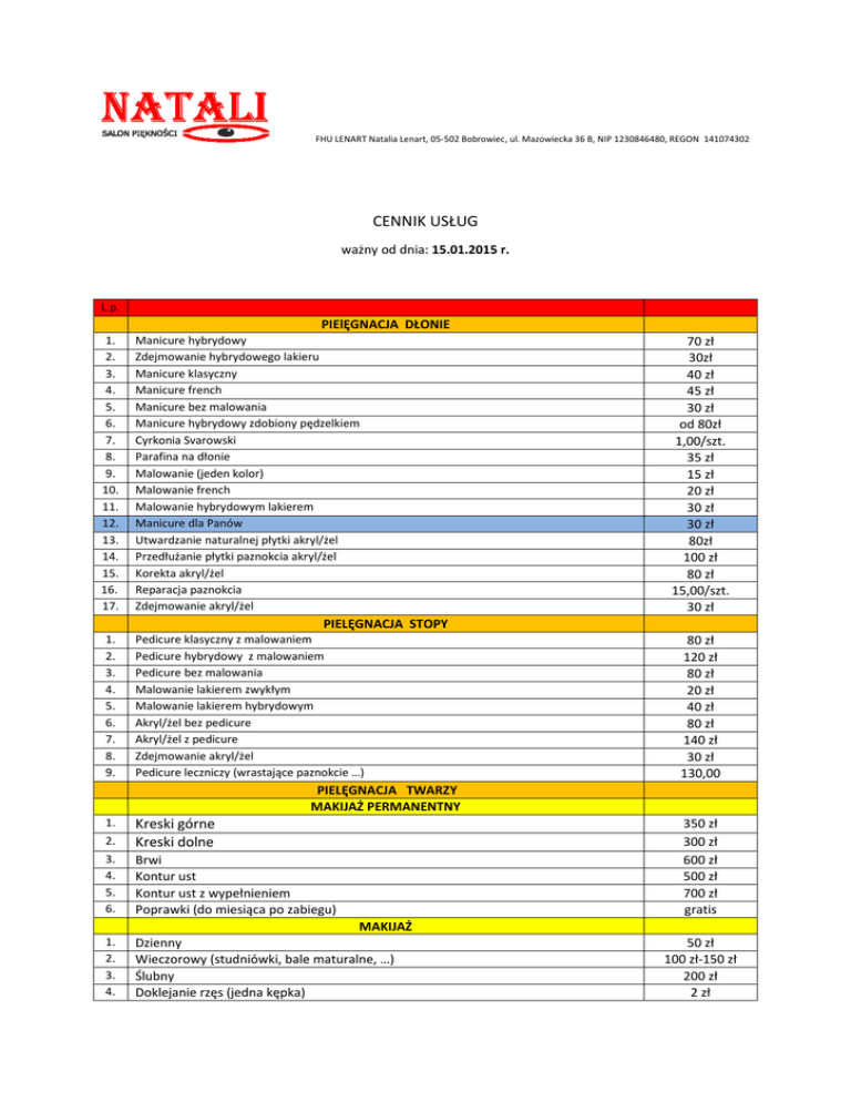FHU LENART Natalia Lenart, 05-502 502 Bobrowiec, ul. Mazowiecka 36 B, NIP 1230846480, REGON 141074302 CENNIK USŁUG ważny od dnia: 15.01.2015 r. L.p. PIElĘGNACJA DŁONIE 1. 2. 3. 4. 5. 6. 7. 8. 9. 10. 11. 12. 13. 14. 15. 16. 17. Manicure hybrydowy Zdejmowanie hybrydowego lakieru Manicure klasyczny Manicure french Manicure bez malowania Manicure hybrydowy zdobiony pędzelkiem Cyrkonia Svarowski Parafina na dłonie Malowanie (jeden kolor) Malowanie french Malowanie hybrydowym lakierem Manicure dla Panów Utwardzanie naturalnej płytki akryl/żel Przedłużanie płytki paznokcia akryl/żel Korekta akryl/żel Reparacja paznokcia Zdejmowanie akryl/żel 1. 2. 3. 4. 5. 6. 7. 8. 9. Pedicure klasyczny z malowaniem Pedicure hybrydowy z malowaniem Pedicure bez malowania Malowanie lakierem zwykłym Malowanie lakierem hybrydowym Akryl/żel bez pedicure Akryl/żel z pedicure Zdejmowanie akryl/żel Pedicure leczniczy (wrastające paznokcie …) 70 zł 30zł 40 zł 45 zł 30 zł od 80zł 1,00/szt. 35 zł 15 zł 20 zł 30 zł 30 zł 80zł 100 zł 80 zł 15,00/szt. 30 zł PIELĘGNACJA STOPY 80 zł 120 zł 80 zł 20 zł 40 zł 80 zł 140 zł 30 zł 130,00 PIELĘGNACJA TWARZY MAKIJAŻ PERMANENTNY 1. 2. Kreski górne Kreski dolne 3. 4. 5. 6. Brwi Kontur ust Kontur ust z wypełnieniem Poprawki (do miesiąca po zabiegu) 350 zł 300 zł 600 zł 500 zł 700 zł gratis MAKIJAŻ 1. 2. 3. 4. Dzienny Wieczorowy (studniówki, bale maturalne, …) Ślubny Doklejanie rzęs (jedna kępka) 50 zł 100 zł-150 zł 200 zł 2 zł 1. 2. 3. 4. 5. 6. 7. 8. 9. 1. 2. 3. 4. 5. RZĘSY Przedłużanie metodą 1:1 Uzupełnianie metodą 1:1 Zdejmowanie Permanentne tuszowanie Zdejmowanie (permanentnie tuszowanych rzęs) Trwała ondulacja rzęs z farbowaniem Farbowanie brwi (z regulacją) Farbowanie rzęs Regulacja brwi + farba do brwi i rzęs DEPILACJA WOSKIEM Twarz Łydki Uda Ręce Pachy 150 zł 100 zł 30 zł 100 zł 30 zł 80 zł 25 zł 20 zł 35 zł 20 zł 40 zł 70 zł 40 zł 40 zł