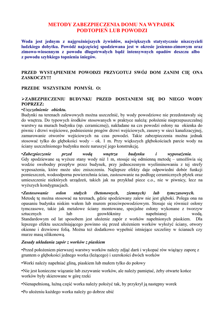 METODY ZABEZPIECZENIA DOMU NA WYPADEK PODTOPIEŃ LUB POWODZI Woda jest jednym z najgroźniejszych żywiołów, największych statystycznie niszczycieli ludzkiego dobytku. Powódź najczęściej spodziewana jest w okresie jesienno-zimowym oraz zimowo-wiosennym z powodu długotrwałych bądź intensywnych opadów deszczu albo z powodu szybkiego topnienia śniegów. PRZED WYSTĄPIENIEM POWODZI PRZYGOTUJ SWÓJ DOM ZANIM CIĘ ONA ZASKOCZY!!! PRZEDE WSZYSTKIM POMYŚL O: ➢ZABEZPIECZENIU BUDYNKU PRZED DOSTANIEM SIĘ DO NIEGO WODY POPRZEZ: •Uszczelnienie obiektu. Budynki na terenach zalewowych można uszczelnić, by wody powodziowe nie przedostawały się do wnętrza. Do typowych środków stosowanych w praktyce należą: położenie nieprzepuszczalnej warstwy na murach budynku (np. ceramicznej), nakładane na czs powodzi osłony na okienka do piwnic i drzwi wejściowe, podniesienie progów drzwi wejściowych, zasuwy w sieci kanalizacyjnej, zamurowanie otworów wejściowych na czas powodzi. Takie zabezpieczenia można jednak stosować tylko do głębokości wody – ok. 1 m. Przy większych głębokościach parcie wody na ściany uszczelnionego budynku może naruszyć jego konstrukcję. •Zabezpieczenie przed wodą wnętrza budynku i wyposażenia. Gdy spodziewane są wyższe stany wody niż 1 m, stosuje się odmienną metodę – umożliwia się wodzie swobodny przepływ przez budynek, przy jednoczesnym wyeliminowaniu z tej strefy wyposażenia, które może ulec zniszczeniu. Najlepsze efekty daje odpowiedni dobór funkcji pomieszczeń, wodoodporna powierzchnia ścian, zastosowanie na podłogę ceramicznych płytek oraz umieszczenie niektórych urządzeń, takich jak na przykład piece c.o., nie w piwnicy, lecz na wyższych kondygnacjach. •Zastosowanie osłon stałych (betonowych, ziemnych) lub tymczasowych. Metodę tę można stosować na terenach, gdzie spodziewany zalew nie jest głęboki. Polega ona na opasaniu budynku niskim wałem lub murem przeciwpowodziowym. Stosuje się również osłony tymczasowe, takie jak metalowe ściany montowane, specjalne osłony wykonane z tworzyw sztucznych lub geowłókniny napełnianej wodą. Standardowym od lat sposobem jest ułożenie zapór z worków napełnionych piaskiem. Dla lepszego efektu uszczelniającego powinno się przed ułożeniem worków wyłożyć ściany, otwory okienne i drzwiowe folią. Można też dodatkowo wypełnić istniejące szczeliny w ścianach czy murze masą silikonową. Zasady układania zapór z worków z piaskiem •Przed położeniem pierwszej warstwy worków należy zdjąć darń i wykopać rów wiążący zaporę z gruntem o głębokości jednego worka (leżącego) i szerokości dwóch worków •Worki należy napełniać gliną, piaskiem lub mułem tylko do połowy •Nie jest konieczne wiązanie lub zszywanie worków, ale należy pamiętać, żeby otwarte końce worków były skierowane w górę rzeki •Nienapełnioną, luźną część worka należy położyć tak, by przykrył ją następny worek •Po ułożeniu każdego worka należy go dobrze ubić •Układając następną warstwę, należy zmienić kierunek układania worków, np. jeśli w dolnej warstwie worki układane były dłuższymi bokami wzdłuż osi zapory, to w następnej warstwie dłuższe boki worków powinny być do niej prostopadłe ➢ZABEZPIECZENIU INSTALACJI WEWNĘTRZNYCH: Należy wyłączyć zasilanie prądu w domu głównym wyłącznikiem. jeśli pomieszczenia gdzie jest wyłącznik są już zalane lub choćby zawilgocone nie należy do nich wchodzić pod żadnym pozorem. Można wtedy wyłączyć prąd stojąc na suchej, drewnianej platformie (np. na stole) przy pomocy suchego drewnianego kija. Należy wyłączyć wszystkie urzadzenia gazowe, takie jak piecyk kuchenny czy łazienkowy. Potem należy wyłączyć główny zawór na rurze doprowadzającej gaz do domu. Jeśli to możliwe należy zdemontować wszystkie urządzenia na prąd i gaz i przenieść je na wyższe kondygnacje. W piwnicy lub w przyziemiu, gdzie często jest pralnia lub łazienka należy zabezpieczyć wyloty kanalizacji. Jeśli nie ma zainstalowanych zasuw lub zaworów zwrotnych nleży na wylotach kanalizacji (muszla klozetowa, kratki ściekowe, inne) zrobić korki z drewna lub choćby z worków plastikowych i unieruchomić je workami z piaskiem lub innym ciężarem. To rozwiązanie chroni przed zalaniem przez cofające się w sieci kanalizacyjnej ścieki ➢PRZY BUDOWIE, ROZBUDOWIE LUB REMONCIE DOMU ZLOKALIZOWANEGO NA TERENIE ZALEWOWYM WARTO POMYŚLEĆ O KILKU ROZWIAZANIACH MOGĄCYCH ZMINIMALIZOWAĆ STRATY PODCZAS POWODZI I PODTOPIEŃ: •Stosowanie materiałów budowlanych odpornych na działanie wody. Rozbudowa, modernizacja lub remont budynku znajdującego się na terenach zalewowych jest dobrą okazją do zastosowania materiałów budowlanych i wykończeniowych, które w przyszłości zmniejszą straty powodziowe. Do materiałów odpornych na wodę należą: beton, szkło, metal, ceramika. Materiały nieodporne na wodę to, między innymi, gips i drewno. Nie jest to zapewne często stosowana metoda, tym bardziej że gminy nie prowadzą doradztwa w tym zakresie. Jednak z kontaktów z mieszkańcami terenów zagrożonych wynika, że część nich stara się wymienić podłogi drewniane na ceramiczne. •Podniesienie budynku. Polega ono na podniesieniu poziomu mieszkalnego budynku do poziomu bezpiecznego. Przestrzeń pod budynkiem przeznaczana jest wtedy na cele gospodarcze, tak że przepływająca woda nie powoduje większych strat i naruszenia konstrukcji. Stosowanie tej metody na terenie Polski jest utrudnione ze względu na dość ciężkie budownictwo, a w konsekwencji wysokie koszty przedsięwzięcia. Są jednak pojedyncze przykłady zastosowania tej metody. Częściej zdarza się natomiast, żew budynkach parterowych dobudowuje się piętro dla zwiększenia bezpieczeństwa mieszkańców i dobytku.