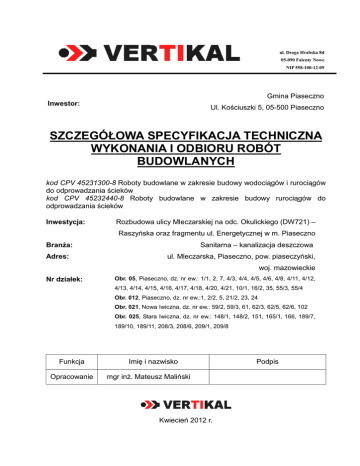 VERTIKALBłażej Binienda ul. Droga Hrabska 8d 05-090 Falenty Nowe NIP 558-100-12-09 Gmina Piaseczno Inwestor: Ul. Kościuszki 5, 05-500 Piaseczno SZCZEGÓŁOWA SPECYFIKACJA TECHNICZNA WYKONANIA I ODBIORU ROBÓT BUDOWLANYCH kod CPV 45231300-8 Roboty budowlane w zakresie budowy wodociągów i rurociągów do odprowadzania ścieków kod CPV 45232440-8 Roboty budowlane w zakresie budowy rurociągów do odprowadzania ścieków Inwestycja: Rozbudowa ulicy Mleczarskiej na odc. Okulickiego (DW721) – Raszyńska oraz fragmentu ul. Energetycznej w m. Piaseczno Branża: Adres: Sanitarna – kanalizacja deszczowa ul. Mleczarska, Piaseczno, pow. piaseczyński, woj. mazowieckie Nr działek: Obr. 05, Piaseczno, dz. nr ew.: 1/1, 2, 7, 4/3, 4/4, 4/5, 4/6, 4/8, 4/11, 4/12, 4/13, 4/14, 4/15, 4/16, 4/17, 4/18, 4/20, 4/21, 10/1, 16/2, 35, 55/3, 55/4 Obr. 012, Piaseczno, dz. nr ew.:1, 2/2, 5, 21/2, 23, 24 Obr. 021, Nowa Iwiczna, dz. nr ew.: 59/2, 59/3, 61, 62/3, 62/5, 62/6, 102 Obr. 025, Stara Iwiczna, dz. nr ew.: 148/1, 148/2, 151, 165/1, 166, 189/7, 189/10, 189/11, 208/3, 208/6, 209/1, 209/8 Funkcja Opracowanie Imię i nazwisko mgr inż. Mateusz Maliński Kwiecień 2012 r. Podpis 1. WSTĘP 1.1. Przedmiot Specyfikacji Technicznej (ST) Przedmiotem niniejszej Szczegółowej Specyfikacji Technicznej są wymagania dotyczące wykonania i odbioru robót dla budowy odwodnienia i kanalizacji deszczowej w ul. Mleczarskiej w Piasecznie. Budowa odwodnienia i kanalizacji deszczowej związana jest z przebudową istniejącego układu drogowego (wg branży drogowej). 1.2. Zakres stosowania ST Specyfikacja Techniczna będzie stosowana jako dokument przetargowy i kontraktowy przy zlecaniu i realizacji robót wymienionych wyżej. Ustalenia zawarte w niniejszej specyfikacji obejmują czynności umożliwiające i mające na celu wykonanie wszystkich robót przewidzianych w projekcie. Obejmują prace związane z dostawą materiałów i wykonawstwem, a także roboty tymczasowe oraz prace towarzyszące. 1.3. Zakres robót objętych ST Roboty obejmują budowę kanalizacji deszczowej dla ul. Mleczarskiej w Piasecznie. W zakres kanalizacji deszczowej wchodzą: • • • Rury kielichowe PVC SN12 lite średnicy 500x16,5mm z uszczelką Rury kielichowe PVC SN12 lite średnicy 400x12,6mm z uszczelką Rury PVC SN12 lite średnicy 315x10mm z uszczelką, łączone poprzez złączki dwukielichowe • Rury PVC SN12 lite średnicy 200x6,6mm z uszczelką, łączone poprzez złączki dwukielichowe • Rury CC-GRP DN600 PN01 SN10000 z łącznikiem FFWC-A • Studnie kanalizacyjne włazowe średnicy 1,2 m – żelbetowa, (właz żeliwny D400 zamykany na zatrzask, krąg żelbetowy, krąg denny z wbudowaną kinetą, pierścień odciążający, pokrywa żelbetowa, pierścień dystansowy, stopnie złazowe żeliwne) • Studnie kanalizacyjne włazowe średnicy 1,5 m – żelbetowa, (właz żeliwny D400 zamykany na zatrzask, krąg żelbetowy, krąg denny z wbudowaną kinetą, pierścień odciążający, pokrywa żelbetowa, pierścień dystansowy, stopnie złazowe żeliwne) • Przejścia szczelne do studni żelbetowych i betonowych dla rur PVC 200mm • Przejścia szczelne do studni żelbetowych i betonowych dla rur PVC 315mm • Przejścia szczelne do studni żelbetowych i betonowych dla rur PVC 400mm • Przejścia szczelne do studni żelbetowych i betonowych dla rur PVC 500mm • Przejścia szczelne do studni żelbetowych i betonowych dla DN600 • Włączenia do studni poprzez kaskadę: - 3 x kolano 45 st. PVC 200mm - 1 x trójnik równoprzelotowy 45 st. PVC 200/200mm • Wpusty deszczowe uliczne: typowy betonowy Ø500mm z osadnikiem, płytą pokrywową, pierścieniem odciążającym i rusztem uchylnym 420x620mm (C250) • Skrzynka odwodnienia liniowego szer.20cm dł.0,5m -skrzynka odpływowa śr.200 -ścianka czołowa x2 -ruszt żeliwny 0,5m • Rewizjje: - studzienka kontrolna PVC200 SN12 z rurą wznoszącą z płytką odciążającą i pokrywą żeliwną - korek PVC200 SN12 • Włączenia do kanału śr.600mm poprzez przyłącze siodłowe śr.200mm • Włączenia do kanału śr.400mm poprzez przyłącze siodłowe śr.200mm • Włączenia trójnikowe: - trójnik redukcyjny 45st. PVC315/200 SN12 - kolanko 45st. PVC200 SN12 • Regulator przepływu 50l/s • Podbudowa z betonu C20/25 gr. 15 cm pod studnie, wpusty, odw. liniowe 1.4. Charakterystyka zadania Ustalenia zawarte w niniejszej specyfikacji dotyczą zasad prowadzenia robót związanych z wykonaniem kanalizacji deszczowej i obejmują wszystkie roboty związane z realizacją zadania: - wytyczenie geodezyjnie, Strona 2 - zabezpieczenie terenu budowy z czasową organizacją ruchu drogowego - wykonanie i umocnienie wykopów liniowych, - wykonanie wykopu obiektowego z umocnieniem przy studniach rewizyjnych, - odwodnienie na czas montażu rurociągów w przypadku wystąpienia wysokiego poziomu wód gruntowych względnie opadowych, - wykonanie podsypki, obsypki i zasypki, - ułożenie kanałów, - próbę szczelności kanałów rurowych, - zasypanie wykopów z zagęszczeniem, - wykonanie studzienek rewizyjnych z gotowych elementów betonowych i żelbetowych, - wykonanie studzienek wpustów ulicznych z gotowych elementów betonowych i żelbetowych, - wykonanie systemowych odwodnień liniowych i punktowych z gotowych elementów, - wykonanie dwuwarstwowej powłoki izolacyjnej powierzchni betonowych i żelbetowych, - wykonanie wprowadzenia rury do studni projektowanych i istniejących, od wpustów, oraz skrzynek zbiorczoosadnikowych systemowych odwodnień liniowych punktowych, -wykonanie połączeń przykanalików z kolektorem za pomocą trójników lub przyłączy siodłowych, - regulacja wysokościowa istniejącej infrastruktury podziemnej (w przypadku gdy nie zostało to ujęte w branży drogowej) - inwentaryzacja geodezyjna, - dokumentacja powykonawcza wg zaleceń Inwestora. 1.5. Określenia podstawowe w ST Określenia podstawowe użyte w ST są zgodne z określeniami przyjętymi w zeszycie nr