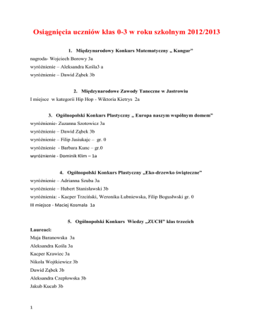 Osiągnięcia uczniów klas 0-3 w roku szkolnym 2012/2013 1. Międzynarodowy Konkurs Matematyczny „ Kangur” nagroda- Wojciech Borowy 3a wyróżnienie – Aleksandra Kośla3 a wyróżnienie – Dawid Ząbek 3b 2. Międzynarodowe Zawody Taneczne w Jastrowiu I miejsce w kategorii Hip Hop - Wiktoria Kietrys 2a 3. Ogólnopolski Konkurs Plastyczny „ Europa naszym wspólnym domem” wyróżnienie- Zuzanna Szotowicz 3a wyróżnienie – Dawid Ząbek 3b wyróżnienie – Filip Jasiukajc – gr. 0 wyróżnienie - Barbara Kunc – gr.0 wyróżnienie - Dominik Klim – 1a 4. Ogólnopolski Konkurs Plastyczny „Eko-drzewko świąteczne” wyróżnienie – Adrianna Szuba 3a wyróżnienie – Hubert Stanisławski 3b wyróżnienia: - Kacper Trzciński, Weronika Łubniewska, Filip Bogusłwski gr. 0 III miejsce - Maciej Kosmala 1a 5. Ogólnopolski Konkurs Wiedzy „ZUCH” klas trzecich Laureaci: Maja Baranowska 3a Aleksandra Kośla 3a Kacper Krawiec 3a Nikola Wojtkiewicz 3b Dawid Ząbek 3b Aleksandra Czepłowska 3b Jakub Kucab 3b 1 6. Ogólnopolski Konkurs Matematyczny „Alfik” – I miejsce w województwie, XII w Polsce - Marcel Łukojko 2a 7. I Ogólnopolski Konkurs na lalkę szmaciankę Nagroda Dyrektora Pałacu Młodzieży w Koszalinie – Patrycja Wojcieszek 1b 8. Ogólnopolski konkurs plastyczny „4 pory roku”. wyróżnienie: Mateusz Kaniewski 9. Ogólnopolski konkurs plastyczny „Ulubiona postać z utworów Jana Brzechwy” nagroda – Amelia Soszyńska – gr.0 10. Międzyszkolny Konkurs „Olimpiada Maluch” III miejsce- Wojciech Borowy 3a 11. Miejski Konkurs Plastyczny „Legendy Gracjana Bojara- Fijałkowskiego” I nagroda- Martyna Kozanecka, Aleksandra Kośla, Wojciech Borowy, 3a II nagroda- Kacper Krawiec, Zuzanna Szotowicz 3a nagroda – Hubert Stanisławski 3b nagroda – Dawid Ząbek 3b nagroda główna - Hubert Michalski 2a I nagroda - Marta Bednarek 2a II nagroda - Iga Jednoralska 2a nagroda – Wiktor Musyt – gr.0 II miejsce Milla Łazowska, – gr.0 wyróżnienie -Wiktor Kamiński – gr.0 III miejsce Maciej Kosmala – 1a 12. Rejonowy Konkurs Plastyczny „Dar krwi-darem życia” I miejsce- Adrianna Szuba 3a 2 13. Powiatowy Konkurs plastyczny „Barwy jesieni” II miejsce – Martyna Kozanecka 3a wyróżnienie- Julia Dylewska 3a II miejsce - Kacper Stanisławski 1b wyróżnienie - Michał Częścik 1b 14. IX Międzyszkolny Konkurs „Cudze chwalicie , swego nie znacie” w kategorii : test wiedzy o Polsce II miejsce – Aleksandra Kośla 3a wyróżnienie Zosia Walenciak – 2a w kategorii : praca plastyczna Nagroda Muzeum w Koszalinie Aleksandra Kośla 3a Nadia Oterska – 2a 15. Rejonowy Konkurs Plastyczny PCK „ Sport to zdrowie” I miejsce – Aleksandra Kośla 3a 16. Międzyszkolny Konkurs Plastyczny „Mój ulubiony bohater spektaklu dla dzieci” I miejsce – Zuzanna Szotowicz 3a II miejsce- Maja Baranowska 3a 17. Rejonowy Konkurs Ortograficzny klas III wyróżnienie- Aleksandra Kośla 3a 18. Międzyszkolny Turniej przyrodniczo – ekologiczny o Puchar Dyrektora ZS nr 13 (13 osobowy zespół) - 2a I miejsce - grupa sportowa: Marta Bednarek Zuzia Domańska, Wiktoria Kietrys, Marcel Łukojko, Angelika Milewicz, Zuzia Piórkowska, Kuba Urban - grupa teoretyczna: Nina Kuchta, Franek Michalski - grupa rewia mody: Julia Staniaszek, Zosia Walenciak - grupa artystyczno – plastyczna: Iga Jednoralska, Nadia Oterska 3 19. VII Międzyszkolny Konkurs Wiedzy „Europejski Przekładaniec”: - 2a II miejsce - Julia Staniaszek – test, III miejsce - Zuzia Kin –test, II miejsce - Nadia Oterska – praca plastyczna. 20. X Międzyszkolny Konkurs Fotografii Dziecięcej – wyróżnienie Zosia Walenciak 2a 21. XLII Konkurs Malarstwa Ściennego Dzieci i Młodzieży pod Mostami Koszalina III miejsce - Nadia Oterska 2a 22. Międzyprzedszkolny konkurs plastyczny. „Anioły, aniołki, aniołeczki”. III miejsce – Weronika Łubniewska.- gr.0 wyróżnienie Barbara Kunc - gr.0 23. Miejskim konkursie plastycznym „ Mój śmieszny portret”. II miejsce – Magdalena Łyszyk – gr.0 24. Powiatowy konkurs plastyczny „Ilustrujemy bajki pana Perrault”. nagroda – Klaudia świderska – gr.0 25. Międzyprzedszkolny konkurs – „Sześciolatki na strat. I miejsce – gr. 0 SP4 26. Miejski konkurs plastyczny pt. "Moja kartka świąteczna" – I miejsce Wiktor Kamiński – gr.0 27. Powiatowy konkurs plastyczny pn. "Ilustrujemy bajki Pana Perrault" – wyróżnienie Justyna Stokowiecka – gr.0 28. Międzyszkolny konkurs „Kwadrant” II miejsce - zespół z klas 3a i 3b 4 29. Międzyszkolny Konkurs Plastycznym „Miś pluszowy” I miejsce Justin Marzec - 1a 30. Wojewódzki Konkurs Plastyczny „Polska-wspólnym domem wielu narodów” pod honorowym patronatem Wojewody Zachodniopomorskiego wyróżnienie Dominik Klim 1a Osiągnięcia uczniów klas 4-6 w roku szkolnym 2012/2013 1. Konkurs z Języka Polskiego z Elementami Historii dla uczniów Szkół Podstawowych województwa zachodniopomorskiego – etap wojewódzki Grzegorz Majcher VIb – laureat, Magdalena Słupska VIa- finalista, Mateusz Kajdan VIa- finalista. 2. Konkurs Matematyczny z Elementami Przyrody dla uczniów Szkół Podstawowych województwa zachodniopomorskiego – etap wojewódzki: Aleksandra Kaszubowska VIa – finalista. 3. Małe Olimpiady: a) z matematyki: Aleksandra Kaszubowska VIa – I miejsce, b) z muzyki: Grzegorz Majcher VIb – I miejsce, c) z języka polskiego: Grzegorz Majcher VIb – II miejsce, Magdalena Słupska VIa – III miejsce, d) z informatyki: Kamil Chochołowski Via – II miejsce, e) z plastyki: Grzegorz Majcher VIb – II miejsce. 4. Międzyszkolny Konkurs Recytatorski - poezja patriotyczna: Grzegorz Majcher VIb - II miejsce wśród klas VI, Martyna Wierzyoska Vb - III miejsce wśród klas V. 5. Międzyszkolny Festiwal Piosenki Patriotycznej "Wyśpiewad Polskę" Magdalena Słupska VIa - III miejsce 5 6. Konkurs MUZYKORAMA: Magdalena Słupska VIa – laureatka 7. Miejski konkurs „His