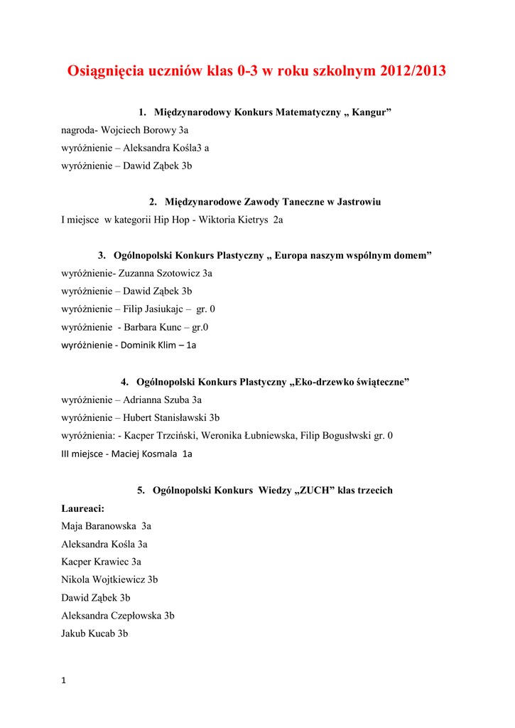 Osiągnięcia uczniów klas 0-3 w roku szkolnym 2012/2013