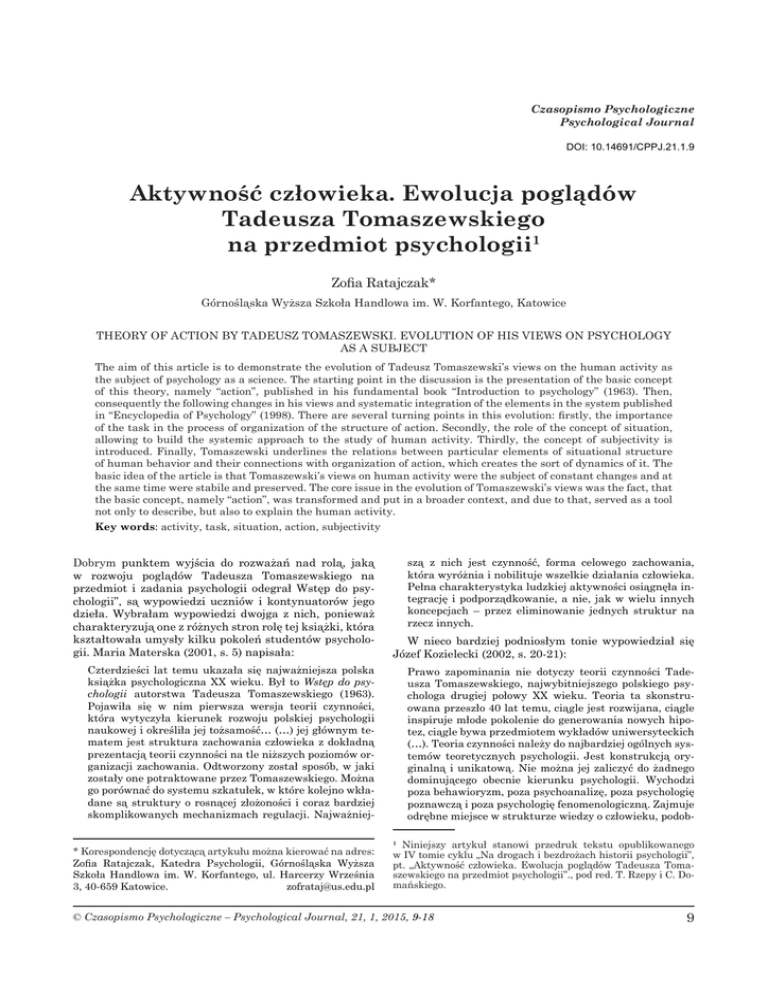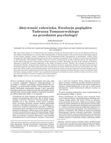 Czasopismo Psychologiczne Aktywność człowieka. Ewolucja poglądów Tadeusza Tomaszewskiego ... Psychological Journal DOI: 10.14691/CPPJ.21.1.9 Aktywność człowieka. Ewolucja poglądów Tadeusza Tomaszewskiego na przedmiot psychologii1 Zofia Ratajczak* Górnośląska Wyższa Szkoła Handlowa im. W. Korfantego, Katowice THEORY OF ACTION BY TADEUSZ TOMASZEWSKI. EVOLUTION OF HIS VIEWS ON PSYCHOLOGY AS A SUBJECT The aim of this article is to demonstrate the evolution of Tadeusz Tomaszewski’s views on the human activity as the subject of psychology as a science. The starting point in the discussion is the presentation of the basic concept of this theory, namely “action”, published in his fundamental book “Introduction to psychology” (1963). Then, consequently the following changes in his views and systematic integration of the elements in the system published in “Encyclopedia of Psychology” (1998). There are several turning points in this evolution: firstly, the importance of the task in the process of organization of the structure of action. Secondly, the role of the concept of situation, allowing to build the systemic approach to the study of human activity. Thirdly, the concept of subjectivity is introduced. Finally, Tomaszewski underlines the relations between particular elements of situational structure of human behavior and their connections with organization of action, which creates the sort of dynamics of it. The basic idea of the article is that Tomaszewski’s views on human activity were the subject of constant changes and at the same time were stabile and preserved. The core issue in the evolution of Tomaszewski’s views was the fact, that the basic concept, namely “action”, was transformed and put in a broader context, and due to that, served as a tool not only to describe, but also to explain the human activity. Key words: activity, task, situation, action, subjectivity Dobrym punktem wyjścia do rozważań nad rolą, jaką w rozwoju poglądów Tadeusza Tomaszewskiego na przedmiot i zadania psychologii odegrał Wstęp do psychologii”, są wypowiedzi uczniów i kontynuatorów jego dzieła. Wybrałam wypowiedzi dwojga z nich, ponieważ charakteryzują one z różnych stron rolę tej książki, która kształtowała umysły kilku pokoleń studentów psychologii. Maria Materska (2001, s. 5) napisała: W nieco bardziej podniosłym tonie wypowiedział się Józef Kozielecki (2002, s. 20-21): Czterdzieści lat temu ukazała się najważniejsza polska książka psychologiczna XX wieku. Był to Wstęp do psychologii autorstwa Tadeusza Tomaszewskiego (1963). Pojawiła się w nim pierwsza wersja teorii czynności, która wytyczyła kierunek rozwoju polskiej psychologii naukowej i określiła jej tożsamość… (…) jej głównym tematem jest struktura zachowania człowieka z dokładną prezentacją teorii czynności na tle niższych poziomów organizacji zachowania. Odtworzony został sposób, w jaki zostały one potraktowane przez Tomaszewskiego. Można go porównać do systemu szkatułek, w które kolejno wkładane są struktury o rosnącej złożoności i coraz bardziej skomplikowanych mechanizmach regulacji. Najważniej- Prawo zapominania nie dotyczy teorii czynności Tadeusza Tomaszewskiego, najwybitniejszego polskiego psychologa drugiej połowy XX wieku. Teoria ta skonstruowana przeszło 40 lat temu, ciągle jest rozwijana, ciągle inspiruje młode pokolenie do generowania nowych hipotez, ciągle bywa przedmiotem wykładów uniwersyteckich (…). Teoria czynności należy do najbardziej ogólnych systemów teoretycznych psychologii. Jest konstrukcją oryginalną i unikatową. Nie można jej zaliczyć do żadnego dominującego obecnie kierunku psychologii. Wychodzi poza behawioryzm, poza psychoanalizę, poza psychologię poznawczą i poza psychologię fenomenologiczną. Zajmuje odrębne miejsce w strukturze wiedzy o człowieku, podob- * Korespondencję dotyczącą artykułu można kierować na adres: Zofia Ratajczak, Katedra Psychologii, Górnośląska Wyższa Szkoła Handlowa im. W. Korfantego, ul. Harcerzy Września 3, 40-659 Katowice. [email protected] 1 Niniejszy artykuł stanowi przedruk tekstu opublikowanego w IV tomie cyklu „Na drogach i bezdrożach historii psychologii”, pt. „Aktywność człowieka. Ewolucja poglądów Tadeusza Tomaszewskiego na przedmiot psychologii”., pod red. T. Rzepy i C. Domańskiego. szą z nich jest czynność, forma celowego zachowania, która wyróżnia i nobilituje wszelkie działania człowieka. Pełna charakterystyka ludzkiej aktywności osiągnęła integrację i podporządkowanie, a nie, jak w wielu innych koncepcjach – przez eliminowanie jednych struktur na rzecz innych. © Czasopismo Psychologiczne – Psychological Journal, 21, 1, 2015, 9-18 9 Zofia Ratajczak nie jak psychologia topologiczna Kurta Lewina, czy funkcjonalizm probabilistyczny Egona Brunswika. Takie systemy osobne z trudem zyskują rozgłos międzynarodowy, rzadziej są cytowane przez zwolenników dominujących kierunków psychologicznych, którzy uprawiają „normalną naukę”. Może dlatego teoria czynności – tak popularna w naszym zakątku Europy, nie zdobyła należnego jej uznania w świecie. Powyższa wypowiedź zawiera interesującą propozycję dyskusji naukoznawczej, dotyczącej rozprzestrzeniania się teorii naukowych (dyfuzja innowacji) oraz pytanie: jeśli dana teoria nie jest poddana regułom międzynarodowej weryfikacji i polityki wydawniczej światowych instytucji, to czy mamy do czynienia ze zjawiskiem „hamowania” rozwoju nauki? Moim celem nie jest jednak rozstrzyganie tego typu wątpliwości, choć zdaję sobie sprawę z ich wagi. Moim celem jest odpowiedź na pytanie, na czym polegała ewolucja poglądów Tadeusza Tomaszewskiego na przedmiot psychologii, zapoczątkowana wykładem zawartym we „Wstępie do psychologii”. Pod koniec życia Tadeusz Tomaszewski tak postrzegał czas poświęcony swojej pracy nad „Wst