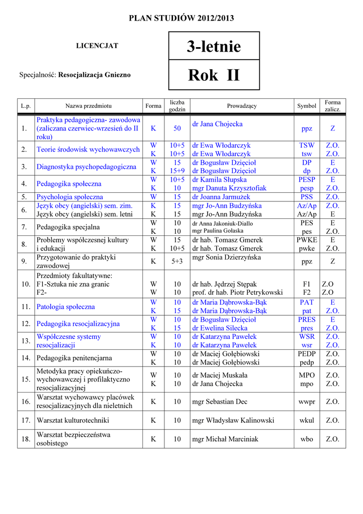 PLAN STUDIÓW 2012/2013 3-letnie LICENCJAT Rok II Specjalność: Resocjalizacja Gniezno L.p. Nazwa przedmiotu Forma liczba godzin 1. Praktyka pedagogiczna- zawodowa (zaliczana czerwiec-wrzesień do II roku) K 50 2. Teorie środowisk wychowawczych 3. Diagnostyka psychopedagogiczna 4. Pedagogika społeczna 5. Psychologia społeczna Język obcy (angielski) sem. zim. Język obcy (angielski) sem. letni W K W K W K W K K W K W K 10+5 10+5 15 15+9 10+5 10 15 15 15 10 10 15 10+5 K 5+3 W W W K W K W K W K 10 10 10 15 10 15 10 10 10 10 dr hab. Jędrzej Stępak prof. dr hab. Piotr Petrykowski dr Maria Dąbrowska-Bąk dr Maria Dąbrowska-Bąk dr Bogusław Dzięcioł dr Ewelina Silecka dr Katarzyna Pawełek dr Katarzyna Pawełek dr Maciej Gołębiowski dr Maciej Gołębiowski F1 Z.O F2 Z.O PAT E pat Z.O. PRES E pres Z.O. WSR Z.O. wsr Z.O. PEDP Z.O. pedp Z.O. W K 10 10 dr Maciej Muskała dr Jana Chojecka MPO mpo Z.O. Z.O. K 10 mgr Sebastian Dec wwpr Z.O. 17. Warsztat kulturotechniki K 10 mgr Władysław Kalinowski wkul Z.O. Warsztat bezpieczeństwa osobistego K 10 mgr Michał Marciniak wbo Z.O. 6. 7. Pedagogika specjalna Problemy współczesnej kultury i edukacji Przygotowanie do praktyki 9. zawodowej Przedmioty fakultatywne: 10. F1-Sztuka nie zna granic F28. 11. Patologia społeczna 12. Pedagogika resocjalizacyjna 13. Współczesne systemy resocjalizacji 14. Pedagogika penitencjarna Metodyka pracy opiekuńczo15. wychowawczej i profilaktyczno resocjalizacyjnej Warsztat wychowawcy placówek 16. resocjalizacyjnych dla nieletnich 18. Prowadzący dr Jana Chojecka dr Ewa Włodarczyk dr Ewa Włodarczyk dr Bogusław Dzięcioł dr Bogusław Dzięcioł dr Kamila Słupska mgr Danuta Krzysztofiak dr Joanna Jarmużek mgr Jo-Ann Budzyńska mgr Jo-Ann Budzyńska dr Anna Jakoniuk-Diallo mgr Paulina Gołaska dr hab. Tomasz Gmerek dr hab. Tomasz Gmerek mgr Sonia Dzierzyńska Symbol Forma zalicz. ppz Z TSW tsw DP dp PESP pesp PSS Az/Ap Az/Ap PES pes PWKE pwke Z.O. Z.O. E Z.O. E Z.O. Z.O. Z.O. E E Z.O. E Z.O. ppz Z
