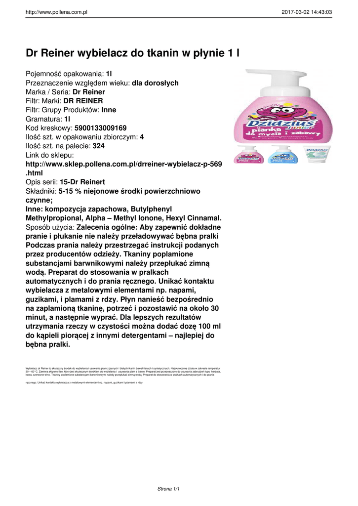 http://www.pollena.com.pl 2017-03-02 14:43:03 Dr Reiner wybielacz do tkanin w płynie 1 l Pojemność opakowania: 1l Przeznaczenie względem wieku: dla dorosłych Marka / Seria: Dr Reiner Filtr: Marki: DR REINER Filtr: Grupy Produktów: Inne Gramatura: 1l Kod kreskowy: 5900133009169 Ilość szt. w opakowaniu zbiorczym: 4 Ilość szt. na palecie: 324 Link do sklepu: http://www.sklep.pollena.com.pl/drreiner-wybielacz-p-569 .html Opis serii: 15-Dr Reinert Składniki: 5-15 % niejonowe środki powierzchniowo czynne; Inne: kompozycja zapachowa, Butylphenyl Methylpropional, Alpha – Methyl Ionone, Hexyl Cinnamal. Sposób użycia: Zalecenia ogólne: Aby zapewnić dokładne pranie i płukanie nie należy przeładowywać bębna pralki Podczas prania należy przestrzegać instrukcji podanych przez producentów odzieży. Tkaniny poplamione substancjami barwnikowymi należy przepłukać zimną wodą. Preparat do stosowania w pralkach automatycznych i do prania ręcznego. Unikać kontaktu wybielacza z metalowymi elementami np. napami, guzikami, i plamami z rdzy. Płyn nanieść bezpośrednio na zaplamioną tkaninę, potrzeć i pozostawić na około 30 minut, a następnie wyprać. Dla lepszych rezultatów utrzymania rzeczy w czystości można dodać dozę 100 ml do kąpieli piorącej z innymi detergentami – najlepiej do bębna pralki. Wybielacz dr Reiner to skuteczny środek do wybielania i usuwania plam z jasnych i białych tkanin bawełnianych i syntetycznych. Najskuteczniej działa w zakresie temperatur 30 – 60°C. Zawiera aktywny tlen, który jest skutecznym środkiem do wybielania i usuwania plam z tkanin. Preparat jest przeznaczony do usuwania zabrudzeń typu herbata, kawa, czerwone wino. Tkaniny poplamione substancjami barwnikowymi należy przepłukać zimną wodą. Preparat do stosowania w pralkach automatycznych i do prania ręcznego. Unikać kontaktu wybielacza z metalowymi elementami np. napami, guzikami i plamami z rdzy. Strona 1/1