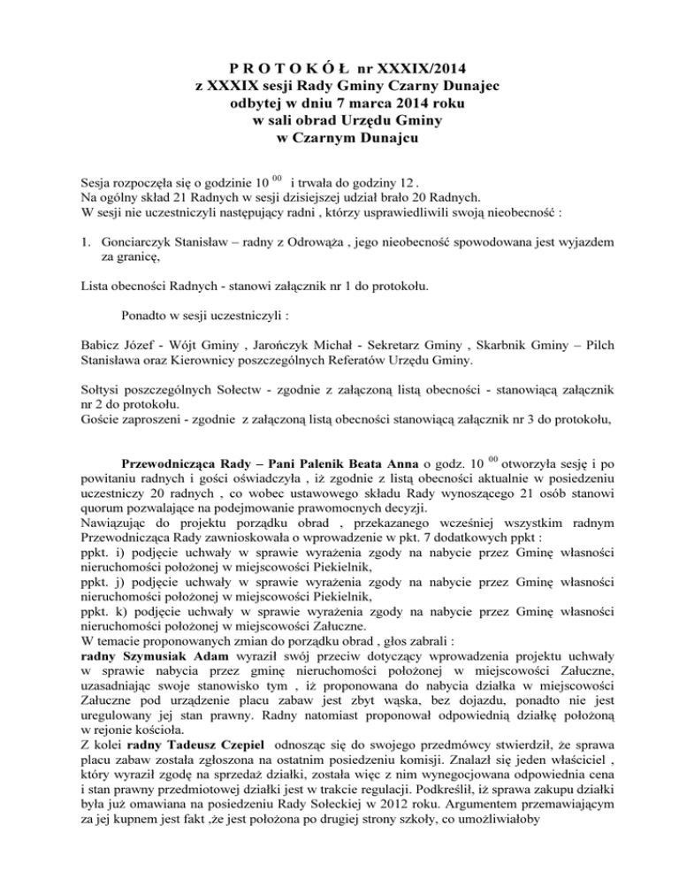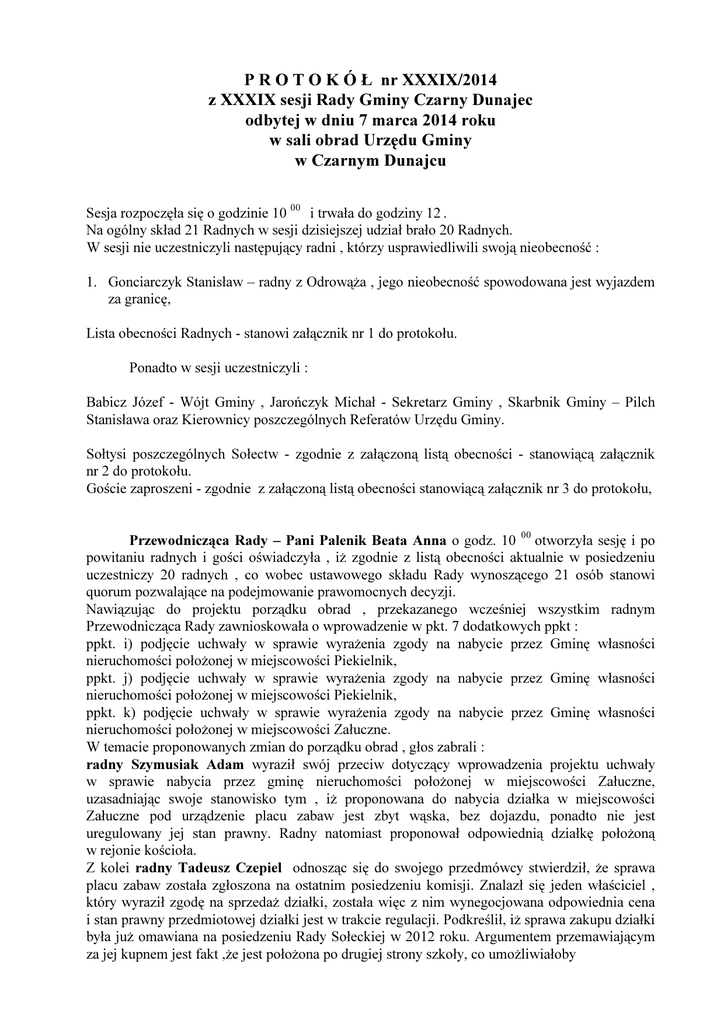 P R O T O K Ó Ł nr XXXIX/2014 z XXXIX sesji Rady Gminy Czarny Dunajec odbytej w dniu 7 marca 2014 roku w sali obrad Urzędu Gminy w Czarnym Dunajcu Sesja rozpoczęła się o godzinie 10 00 i trwała do godziny 12 . Na ogólny skład 21 Radnych w sesji dzisiejszej udział brało 20 Radnych. W sesji nie uczestniczyli następujący radni , którzy usprawiedliwili swoją nieobecność : 1. Gonciarczyk Stanisław – radny z Odrowąża , jego nieobecność spowodowana jest wyjazdem za granicę, Lista obecności Radnych - stanowi załącznik nr 1 do protokołu. Ponadto w sesji uczestniczyli : Babicz Józef - Wójt Gminy , Jarończyk Michał - Sekretarz Gminy , Skarbnik Gminy – Pilch Stanisława oraz Kierownicy poszczególnych Referatów Urzędu Gminy. Sołtysi poszczególnych Sołectw - zgodnie z załączoną listą obecności - stanowiącą załącznik nr 2 do protokołu. Goście zaproszeni - zgodnie z załączoną listą obecności stanowiącą załącznik nr 3 do protokołu, Przewodnicząca Rady – Pani Palenik Beata Anna o godz. 10 00 otworzyła sesję i po powitaniu radnych i gości oświadczyła , iż zgodnie z listą obecności aktualnie w posiedzeniu uczestniczy 20 radnych , co wobec ustawowego składu Rady wynoszącego 21 osób stanowi quorum pozwalające na podejmowanie prawomocnych decyzji. Nawiązując do projektu porządku obrad , przekazanego wcześniej wszystkim radnym Przewodnicząca Rady zawnioskowała o wprowadzenie w pkt. 7 dodatkowych ppkt : ppkt. i) podjęcie uchwały w sprawie wyrażenia zgody na nabycie przez Gminę własności nieruchomości położonej w miejscowości Piekielnik, ppkt. j) podjęcie uchwały w sprawie wyrażenia zgody na nabycie przez Gminę własności nieruchomości położonej w miejscowości Piekielnik, ppkt. k) podjęcie uchwały w sprawie wyrażenia zgody na nabycie przez Gminę własności nieruchomości położonej w miejscowości Załuczne. W temacie proponowanych zmian do porządku obrad , głos zabrali : radny Szymusiak Adam wyraził swój przeciw dotyczący wprowadzenia projektu uchwały w sprawie nabycia przez gminę nieruchomości położonej w miejscowości Załuczne, uzasadniając swoje stanowisko tym , iż proponowana do nabycia działka w miejscowości Załuczne pod urządzenie placu zabaw jest zbyt wąska, bez dojazdu, ponadto nie jest uregulowany jej stan prawny. Radny natomiast proponował odpowiednią działkę położoną w rejonie kościoła. Z kolei radny Tadeusz Czepiel odnosząc się do swojego przedmówcy stwierdził, że sprawa placu zabaw została zgłoszona na ostatnim posiedzeniu komisji. Znalazł się jeden właściciel , który wyraził zgodę na sprzedaż działki, została więc z nim wynegocjowana odpowiednia cena i stan prawny przedmiotowej działki jest w trakcie regulacji. Podkreślił, iż sprawa zakupu działki była już omawiana na posiedzeniu Rady Sołeckiej w 2012 roku. Argumentem przemawiającym za jej kupnem jest fakt ,że jest położona po drugiej strony szkoły, co umożliwiałoby 2 przeprowadzanie dzieci z zerówek. Ponadto Gmina poczyniła pewne nakłady finansowe, wokół działki jest wykonany chodnik, na części placu jest wyłożone podłoże żwirowe i na pewno jest miejsce na postawienie lampy. W sprawie proponowanej działki przez radnego Szymusiaka położonej koło kościoła toczy się obecnie spór dotyczący stanu prawnego. Ostatecznie Przewodnicząca Rady zaproponowała , aby przedkładaną uchwałę wprowadzić do porządku obrad, natomiast do dyskusji Rada wróci w momencie jej podejmowania. Kolejno zostały poddane pod jawne głosowanie : • dwa projekty uchwały w sprawie nabycia przez gminę nieruchomości położonych w miejscowości Piekielnik - Uchwały zostały wprowadzone do projektu porządku obrad , przy 18 głosach „za”. • Uchwała dotycząca nabycia przez gminę nieruchomości położonej w Załucznem, wprowadzona została do porządku obrad , przy 17 głosach „za”, 1 głosie „przeciw” i 2 głosach „wstrzymujących”. Przed głosowaniem na salę obrad przybył radny A. Ligas. Następnie projekt porządku obrad z dokonanymi poprawkami został poddany pod jawne głosowanie , w wyniku którego został przyjęty jednogłośnie , przy 20 głosach „za” w następującym brzmieniu: 1. 2. 3. 4. 5. 6. Otwarcie sesji i stwierdzenie prawomocności obrad. Przyjęcie porządku obrad. Przyjęcie protokołu z XXXVIII sesji Rady. Informacja o pracy Wójta Gminy w okresie między sesjami. Interpelacje Radnych. Informacja o działalności Gminnego Ośrodka Pomocy Społecznej w Czarnym Dunajcu w 2013 roku. 7. Podjęcie uchwał w sprawie : a) zmiany budżetu gminy na 2014 rok, oraz zmiany Uchwały Budżetowej Gminy Czarny Dunajec na rok 2014 , Nr XXXVIII/347/2014 Rady Gminy Czarny Dunajec z dnia 24 stycznia 2014 roku, b) zmiany Wieloletniej Prognozy Finansowej Gminy Czarny Dunajec na lata 2014 – 2025, c) udzielenia w 2014 roku pomocy finansowej na rzecz powiatu Nowotarskiego, d) wyrażenia zgody na wyodrębnienie w budżecie gminy środków stanowiących fundusz sołecki w 2015 roku. e) planu pracy Komisji Rewizyjnej, f) planu pracy stałych komisji Rady Gminy, g) zmiany Uchwały Rady Gminy Czarny Dunajec Nr VIII/80/2011 z dnia 22 czerwca 2011 roku, h) nabycia na własność Gminy nieruchomości gruntowej. i) wyrażenia zgody na nabycie przez Gminę własności nieruchomości położonej w miejscowości Piekielnik. j) wyrażenia zgody na nabycie przez Gminę własności nieruchomości położonej w miejscowości Piekielnik, k) wyrażenia zgody na nabycie przez Gminę własności nieruchomości położonej w miejscowości Załuczne, 8. Odpowiedzi na Interpelacje Radnych. 9. Wolne wnioski i zapytania. 10. Zakończenie obrad sesji. 3 Ad. pkt. 3. Z protokołem z XXXVIII sesji Rady Gminy zapoznał się radny Tylka Jan, stwierdził , że protokół w pełni odzwierciedla przebieg obrad sesji i zawnioskował o jego przyjęcie bez czytania. Wobec faktu , iż nikt z Radnych 