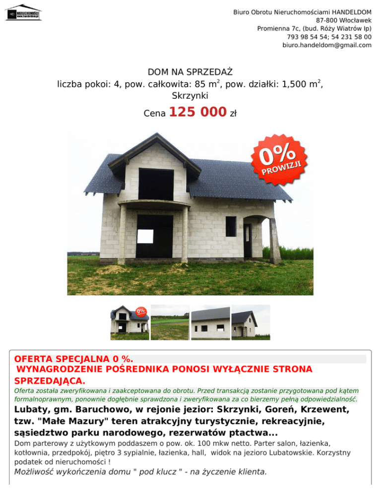 Biuro Obrotu Nieruchomościami HANDELDOM 87-800 Włocławek Promienna 7c, (bud. Róży Wiatrów Ip) 793 98 54 54; 54 231 58 00 [email protected] DOM NA SPRZEDAŻ liczba pokoi: 4, pow. całkowita: 85 m2, pow. działki: 1,500 m2, Skrzynki Cena 125 000 zł OFERTA SPECJALNA 0 %. WYNAGRODZENIE POŚREDNIKA PONOSI WYŁĄCZNIE STRONA SPRZEDAJĄCA. Oferta została zweryfikowana i zaakceptowana do obrotu. Przed transakcją zostanie przygotowana pod kątem formalnoprawnym, ponownie dogłębnie sprawdzona i zweryfikowana za co bierzemy pełną odpowiedzialność. Lubaty, gm. Baruchowo, w rejonie jezior: Skrzynki, Goreń, Krzewent, tzw. "Małe Mazury" teren atrakcyjny turystycznie, rekreacyjnie, sąsiedztwo parku narodowego, rezerwatów ptactwa... Dom parterowy z użytkowym poddaszem o pow. ok. 100 mkw netto. Parter salon, łazienka, kotłownia, przedpokój, piętro 3 sypialnie, łazienka, hall, widok na jezioro Lubatowskie. Korzystny podatek od nieruchomości ! Możliwość wykończenia domu " pod klucz " - na życzenie klienta. Biuro Obrotu Nieruchomościami HANDELDOM 87-800 Włocławek Promienna 7c, (bud. Róży Wiatrów Ip) 793 98 54 54; 54 231 58 00 [email protected] Więcej zdjęć, podgląd projektu, film do oferty bezpośrednio na stronie www.handeldom.pl Link do projektu: http://pracownia-projekty.dom.pl/dp_grabie_srednie.htm?gclid=CjkKEQjw5e-cBRDysazatpTm5b8BEiQAWxTHh 6Ss50oqP0QSGL6NieaEynu812c5qHKBdalHDPMFs17w_wcB Prezentacja: Mirosław Roszczyniała tel. 793 98 54 54 NIE RYZYKUJ, KUPUJ Z PROFESJONALISTĄ Pośrednik, ubezpieczony i odpowiedzialny za realizację transakcji, Mirosław Roszczyniała, licencja nr 6643 (link). Organizując transakcję przez nasze biuro masz pewność, że będzie prowadzona przez właściwą i doświadczoną osobę, zostanie dokonana prawidłowo i bezpiecznie bez najmniejszych problemów, doradzamy i wyjaśniamy wszelkie wątpliwości klientów. W ramach transakcji pomagamy w uzyskaniu kredytu hipotecznego na zakup nieruchomości nawet na 100 % wartości, ograniczając zaangażowanie klienta do absolutnego minimum. Współpracujemy w tej dziedzinie z wieloma bankami. Wszelkie informacje o ofercie są zamieszczane na podstawie oświadczenia zbywcy. Sugeruje się ich osobistą weryfikację. Symbol HDM-DS-830 Typ nieruchomości DOM Rodzaj transakcji SPRZEDAŻ Status AKTUALNA Rodzaj rynku WTÓRNY Cena 125 000 PLN Stara cena 130 000 PLN Cena za m2 1 470,59 PLN Cena negocjowana TAK Kraj POLSKA Województwo kujawsko-pomorskie Powiat włocławski Gmina Baruchowo Miejscowość Skrzynki Pow. całkowita 85,00 m2 Pow. działki 1 500,00 m2 Kształt działki PROSTOKĄT Forma własności działki WŁASNOŚĆ Typ domu WOLNOSTOJĄCY Rodzaj budynku DOM Biuro Obrotu Nieruchomościami HANDELDOM 87-800 Włocławek Promienna 7c, (bud. Róży Wiatrów Ip) 793 98 54 54; 54 231 58 00 [email protected] Rok budowy 2013 Standard SUROWY OTWARTY Konstrukcja budynku GAZOBETON Liczba łazienek 2 Liczba WC 2 Droga dojazdowa GRUNTOWA Liczba pokoi 4 Dostępne sieci woda, energia Forma własności PEŁNA WŁASNOŚĆ Źródło wody WODA MIEJSKA Pokrycie dachu PAPA Kształt dachu DWUSPADOWY Poddasze UŻYTKOWE Mirosław Roszczyniała 793 98 54 54 [email protected] Więcej ofert na stronie www.handeldom.pl