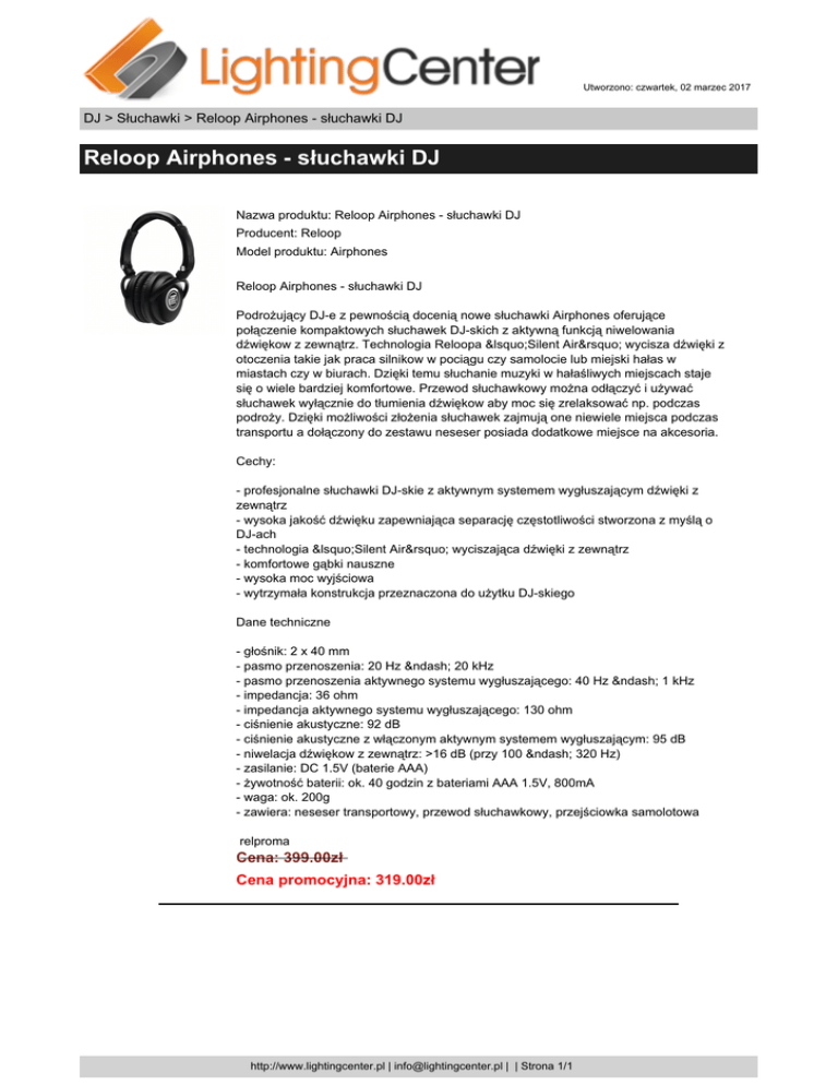 Utworzono: czwartek, 02 marzec 2017 DJ > Słuchawki > Reloop Airphones - słuchawki DJ Reloop Airphones - słuchawki DJ Nazwa produktu: Reloop Airphones - słuchawki DJ Producent: Reloop Model produktu: Airphones Reloop Airphones - słuchawki DJ Podrożujący DJ-e z pewnością docenią nowe słuchawki Airphones oferujące połączenie kompaktowych słuchawek DJ-skich z aktywną funkcją niwelowania dźwiękow z zewnątrz. Technologia Reloopa ‘Silent Air’ wycisza dźwięki z otoczenia takie jak praca silnikow w pociągu czy samolocie lub miejski hałas w miastach czy w biurach. Dzięki temu słuchanie muzyki w hałaśliwych miejscach staje się o wiele bardziej komfortowe. Przewod słuchawkowy można odłączyć i używać słuchawek wyłącznie do tłumienia dźwiękow aby moc się zrelaksować np. podczas podroży. Dzięki możliwości złożenia słuchawek zajmują one niewiele miejsca podczas transportu a dołączony do zestawu neseser posiada dodatkowe miejsce na akcesoria. Cechy: - profesjonalne słuchawki DJ-skie z aktywnym systemem wygłuszającym dźwięki z zewnątrz - wysoka jakość dźwięku zapewniająca separację częstotliwości stworzona z myślą o DJ-ach - technologia ‘Silent Air’ wyciszająca dźwięki z zewnątrz - komfortowe gąbki nauszne - wysoka moc wyjściowa - wytrzymała konstrukcja przeznaczona do użytku DJ-skiego Dane techniczne - głośnik: 2 x 40 mm - pasmo przenoszenia: 20 Hz – 20 kHz - pasmo przenoszenia aktywnego systemu wygłuszającego: 40 Hz – 1 kHz - impedancja: 36 ohm - impedancja aktywnego systemu wygłuszającego: 130 ohm - ciśnienie akustyczne: 92 dB - ciśnienie akustyczne z włączonym aktywnym systemem wygłuszającym: 95 dB - niwelacja dźwiękow z zewnątrz: >16 dB (przy 100 – 320 Hz) - zasilanie: DC 1.5V (baterie AAA) - żywotność baterii: ok. 40 godzin z bateriami AAA 1.5V, 800mA - waga: ok. 200g - zawiera: neseser transportowy, przewod słuchawkowy, przejściowka samolotowa relproma Cena: 399.00zł Cena promocyjna: 319.00zł http://www.lightingcenter.pl | [email protected] | | Strona 1/1