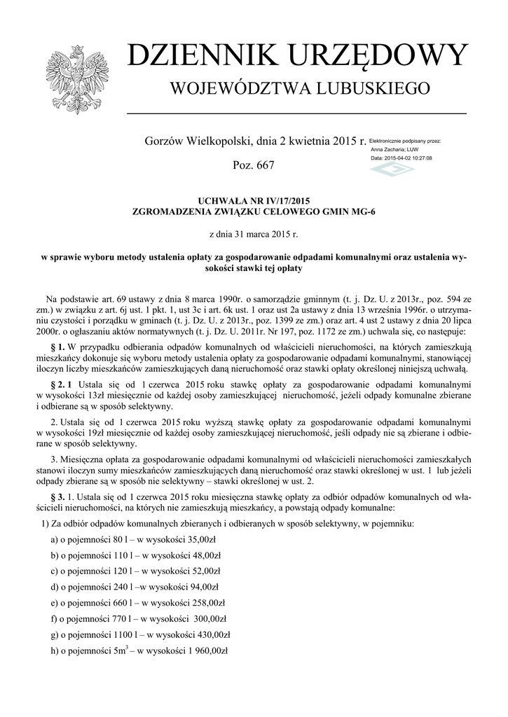 DZIENNIK URZĘDOWY WOJEWÓDZTWA LUBUSKIEGO Gorzów Wielkopolski, dnia 2 kwietnia 2015 r. Elektronicznie podpisany przez: Anna Zacharia; LUW Poz. 667 Data: 2015-04-02 10:27:08 UCHWAŁA NR IV/17/2015 ZGROMADZENIA ZWIĄZKU CELOWEGO GMIN MG-6 z dnia 31 marca 2015 r. w sprawie wyboru metody ustalenia opłaty za gospodarowanie odpadami komunalnymi oraz ustalenia wysokości stawki tej opłaty Na podstawie art. 69 ustawy z dnia 8 marca 1990r. o samorządzie gminnym (t. j. Dz. U. z 2013r., poz. 594 ze zm.) w związku z art. 6j ust. 1 pkt. 1, ust 3c i art. 6k ust. 1 oraz ust 2a ustawy z dnia 13 września 1996r. o utrzymaniu czystości i porządku w gminach (t. j. Dz. U. z 2013r., poz. 1399 ze zm.) oraz art. 4 ust 2 ustawy z dnia 20 lipca 2000r. o ogłaszaniu aktów normatywnych (t. j. Dz. U. 2011r. Nr 197, poz. 1172 ze zm.) uchwala się, co następuje: § 1. W przypadku odbierania odpadów komunalnych od właścicieli nieruchomości, na których zamieszkują mieszkańcy dokonuje się wyboru metody ustalenia opłaty za gospodarowanie odpadami komunalnymi, stanowiącej iloczyn liczby mieszkańców zamieszkujących daną nieruchomość oraz stawki opłaty określonej niniejszą uchwałą. § 2. 1 Ustala się od 1 czerwca 2015 roku stawkę opłaty za gospodarowanie odpadami komunalnymi w wysokości 13zł miesięcznie od każdej osoby zamieszkującej nieruchomość, jeżeli odpady komunalne zbierane i odbierane są w sposób selektywny. 2. Ustala się od 1 czerwca 2015 roku wyższą stawkę opłaty za gospodarowanie odpadami komunalnymi w wysokości 19zł miesięcznie od każdej osoby zamieszkującej nieruchomość, jeśli odpady nie są zbierane i odbierane w sposób selektywny. 3. Miesięczna opłata za gospodarowanie odpadami komunalnymi od właścicieli nieruchomości zamieszkałych stanowi iloczyn sumy mieszkańców zamieszkujących daną nieruchomość oraz stawki określonej w ust. 1 lub jeżeli odpady zbierane są w sposób nie selektywny – stawki określonej w ust. 2. § 3. 1. Ustala się od 1 czerwca 2015 roku miesięczna stawkę opłaty za odbiór odpadów komunalnych od właścicieli nieruchomości, na których nie zamieszkują mieszkańcy, a powstają odpady komunalne: 1) Za odbiór odpadów komunalnych zbieranych i odbieranych w sposób selektywny, w pojemniku: a) o pojemności 80 l – w wysokości 35,00zł b) o pojemności 110 l – w wysokości 48,00zł c) o pojemności 120 l – w wysokości 52,00zł d) o pojemności 240 l –w wysokości 94,00zł e) o pojemności 660 l – w wysokości 258,00zł f) o pojemności 770 l – w wysokości 300,00zł g) o pojemności 1100 l – w wysokości 430,00zł h) o pojemności 5m3 – w wysokości 1 960,00zł Dziennik Urzędowy Województwa Lubuskiego –2– Poz. 667 i) o pojemności 7m3 – w wysokości 2 700,00zł j) o pojemności 9m3 – w wysokości 3 528,00zł k) o pojemności 16m3 –w wysokości 6 270,00zł. 2) Za odbiór odpadów komunalnych zebranych i odbieranych w sposób nie selektywny w pojemniku: a) o pojemności 80 l – w wysokości 50,00zł b) o pojemności 110 l – w wysokości 70,00zł c) o pojemności 120 l – w wysokości 76,00zł d) o pojemności 240 l – w wysokości 118,00zł e) o pojemności 660 l – w wysokości 323,00zł f) o pojemności 770 l – w wysokości 375,00zł g) o pojemności 1100 l – w wysokości 530,00zł h) o pojemności 5m3 – w wysokości 2 450,00zł i) o pojemności 7m3 – w wysokości 3 375,00zł j) o pojemności 9m3 – w wysokości 4 410,00zł k) o pojemności 16m3 – w wysokości 7 837,00zł. 2. Miesięczna opłata za gospodarowanie odpadami komunalnymi pochodzącymi z nieruchomości, na których nie zamieszkują mieszkańcy, a powstają odpady komunalne, stanowić będzie iloczyn ilości pojemników o określonej pojemności oraz stawki określonej w ust. 1 pkt 1 lub jeżeli odpady zbierane są sposób nie selektywny – stawki określonej w ust. 1 pkt 2. § 4. 1 Ryczałtową stawkę opłaty za gospodarowanie odpadami komunalnymi za rok kalendarzowy od domku letniskowego lub od innej nieruchomości wykorzystywanej na cele rekreacyjno-wypoczynkowe, stanowić będzie iloczyn ilości pojemników o określonej pojemności oraz stawki określonej w ust. 2 lub jeżeli odpady zbierane są w sposób nie selektywny – stawki określonej w ust. 3. 2. Ustala się ryczałtową stawkę opłaty za gospodarowanie odpadami komunalnymi za rok kalendarzowy od domku letniskowego lub od innej nieruchomości wykorzystywanej na cele rekreacyjno-wypoczynkowe jeśli odpady są zbierane i odbierane w sposób selektywny w pojemniku: 1) o pojemności 80l – 246,40zł 2) o pojemności 110l – 339,20zł 3) o pojemności 120l – 368,00zł 4) o pojemności 240l – 736,00zł. 3. Ustala się wyższą ryczałtową stawkę opłaty za gospodarowanie odpadami komunalnymi za rok kalendarzowy od domku letniskowego lub od innej nieruchomości wykorzystywanej na cele rekreacyjno-wypoczynkowe jeśli odpady nie są zbierane i odbierane w sposób selektywny w pojemniku: 1) o pojemności 80l – 295,70zł 2) o pojemności 110l – 407,00zł 3) o pojemności 120l – 441,60zł 4) o pojemności 240l – 883,20zł. § 5. W przypadku nieruchomości, która w części stanowi nieruchomość, na której zamieszkują mieszkańcy, a w części nieruchomość, na której nie zamieszkują mieszkańcy, a powstają odpady komunalne, opłata za gospodarowanie odpadami komunalnymi stanowi sumę opłat obliczoną zgodnie z § 2 i § 3. Dziennik Urzędowy Województwa Lubuskiego –3– Poz. 667 § 6. Z dniem 31 maja 2015 roku traci moc uchwała nr XVII/ 49/2013 Zgromadzenia Związku Celowego Gmin MG-6 z dnia 10 kwietnia 2013r. w sprawie wyboru metody ustalenia opłaty za gospodarowanie odpadami komunalnymi oraz ustalenia wysokości stawki tej opłaty (Dz. U. Woj. Lubuskiego, poz. 1226). § 7. Wykonanie uchwały powierza się Zarządowi Związku Celowego Gmin MG-6. § 8. Uchwała wchodzi w życie po upływie 14 dni od dnia ogłoszenia w Dzienni