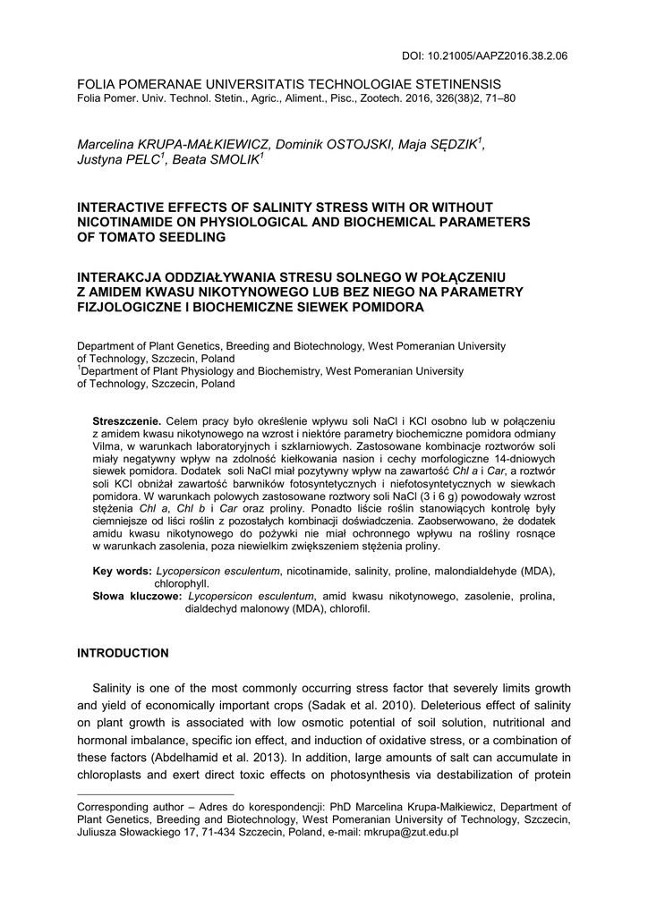 DOI: 10.21005/AAPZ2016.38.2.06 FOLIA POMERANAE UNIVERSITATIS TECHNOLOGIAE STETINENSIS Folia Pomer. Univ. Technol. Stetin., Agric., Aliment., Pisc., Zootech. 2016, 326(38)2, 71–80 Marcelina KRUPA-MAŁKIEWICZ, Dominik OSTOJSKI, Maja SĘDZIK1, Justyna PELC1, Beata SMOLIK11 INTERACTIVE EFFECTS OF SALINITY STRESS WITH OR WITHOUT NICOTINAMIDE ON PHYSIOLOGICAL AND BIOCHEMICAL PARAMETERS OF TOMATO SEEDLING INTERAKCJA ODDZIAŁYWANIA STRESU SOLNEGO W POŁĄCZENIU Z AMIDEM KWASU NIKOTYNOWEGO LUB BEZ NIEGO NA PARAMETRY FIZJOLOGICZNE I BIOCHEMICZNE SIEWEK POMIDORA Department of Plant Genetics, Breeding and Biotechnology, West Pomeranian University of Technology, Szczecin, Poland 1 Department of Plant Physiology and Biochemistry, West Pomeranian University of Technology, Szczecin, Poland Streszczenie. Celem pracy było określenie wpływu soli NaCl i KCl osobno lub w połączeniu z amidem kwasu nikotynowego na wzrost i niektóre parametry biochemiczne pomidora odmiany Vilma, w warunkach laboratoryjnych i szklarniowych. Zastosowane kombinacje roztworów soli miały negatywny wpływ na zdolność kiełkowania nasion i cechy morfologiczne 14-dniowych siewek pomidora. Dodatek soli NaCl miał pozytywny wpływ na zawartość Chl a i Car, a roztwór soli KCl obniżał zawartość barwników fotosyntetycznych i niefotosyntetycznych w siewkach pomidora. W warunkach polowych zastosowane roztwory soli NaCl (3 i 6 g) powodowały wzrost stężenia Chl a, Chl b i Car oraz proliny. Ponadto liście roślin stanowiących kontrolę były ciemniejsze od liści roślin z pozostałych kombinacji doświadczenia. Zaobserwowano, że dodatek amidu kwasu nikotynowego do pożywki nie miał ochronnego wpływu na rośliny rosnące w warunkach zasolenia, poza niewielkim zwiększeniem stężenia proliny. Key words: Lycopersicon esculentum, nicotinamide, salinity, proline, malondialdehyde (MDA), chlorophyll. Słowa kluczowe: Lycopersicon esculentum, amid kwasu nikotynowego, zasolenie, prolina, dialdechyd malonowy (MDA), chlorofil. INTRODUCTION Salinity is one of the most commonly occurring stress factor that severely limits growth and yield of economically important crops (Sadak et al. 2010). Deleterious effect of salinity on plant growth is associated with low osmotic potential of soil solution, nutritional and hormonal imbalance, specific ion effect, and induction of oxidative stress, or a combination of these factors (Abdelhamid et al. 2013). In addition, large amounts of salt can accumulate in chloroplasts and exert direct toxic effects on photosynthesis via destabilization of protein Corresponding author – Adres do korespondencji: PhD Marcelina Krupa-Małkiewicz, Department of Plant Genetics, Breeding and Biotechnology, West Pomeranian University of Technology, Szczecin, Juliusza Słowackiego 17, 71-434 Szczecin, Poland, e-mail: [email protected] 72 M. Krupa-Małkiewicz et al. complexes destroying photosynthetic pigments. A possible survival strategy for plants under saline conditions is to use some compounds that could alleviate the salt stress effect. The use of vitamins as antioxidants mediated salt tolerance as a selection factor as well as a driving force for improving resistance and adaptation to salt stress (Azooz et al. 2013). Vitamins are required in trace amount to maintain normal growth and proper development of all organisms. In addition, vitamins are cofactors of many metabolic reactions (Abdelhamid et al. 2013). Vitamin supplements are known to enhance the plant activities and did not have toxic or mutagenic action (Hassanein et al. 2009; Azooz et al. 2013). Nicotinamide is a water–soluble vitamin and is part of the vitamin B group. It is a stress–associated compound that induces and regulates secondary metabolic accumulation and/or the manifestation of defense metabolism in plants (Azooz et al. 2013). The role of vitamins in modifying the salt stress induced changes in osmoprotectant contents and was also investigated by Bassuony et al. (2008), Sadak et al. (2010), Abdelhamid et al. (2013) and Krupa-Małkiewicz et al. (2015). The major objective of this study was to investigate the effects of nicotinamide on number of physiological aspects of tomato (Lycopersicon esculentum) cultivar Vilma under saline condition. MATERIAL AND METHODS Petri dishes test. Seeds of Lycopersicon esculentum cv. Vilma were surface–sterilized with 70% (v/v) ethanol solution for 30 s and then thoroughly rinsed with sterile water. After the preliminary disinfection, the seeds soaked for 15 minutes in 10% (v/v) solution of sodium hypochlorite (NaOCl), after rinsing three times in sterile water. Next, seeds were placed on Petri dishes lined with filter paper and moistened with 15.0 cm3 of salt solution. To obtain a salinity effect, eight combinations of two salt solutions (NaCl and KCl) were used: 100 mM NaCl, 100 mM NaCl + 1 mM nicotinamide, 200 mM NaCl, 200 mM NaCl + 1 mM nicotinamide, 100 mM KCl, 100 mM KCl + 1 mM nicotinamide, 200 mM KCl, 200 mM KCl + 1 mM nicotinamide, with a pH of 6.0. Sterile water was used as the control. 30 seeds were used per treatment, including control. The experiments were repeated 3 times. The Petri dishes with the seeds were stored in a growth chamber at a constant temperature of 25ºC in white light (40 µmol · m–2 · s–1) for 16 h and 8 h dark per a day. After 14 days, plants were removed and washed with deionized distilled water. Biometric measurements were performed, in which the following parameters were determined: the number of germinating seeds, root and shoot length (cm) and chlorophylls a and b (Chl a, Chl b) and carotenoid (Car) concentrations (mg · g–1fw) in tomato seedlings. Greenhouse test. Seeds of cultivar Vilma were disinfected with 10% solution of sodium hypochlorite (NaOCl) for 15 minutes. Then, were washed three times with sterile water and seeded in pots (diameter 10 cm, high 15 cm). Pots were moved to a heated greenhouse and placed on cultivation tables. After the develo