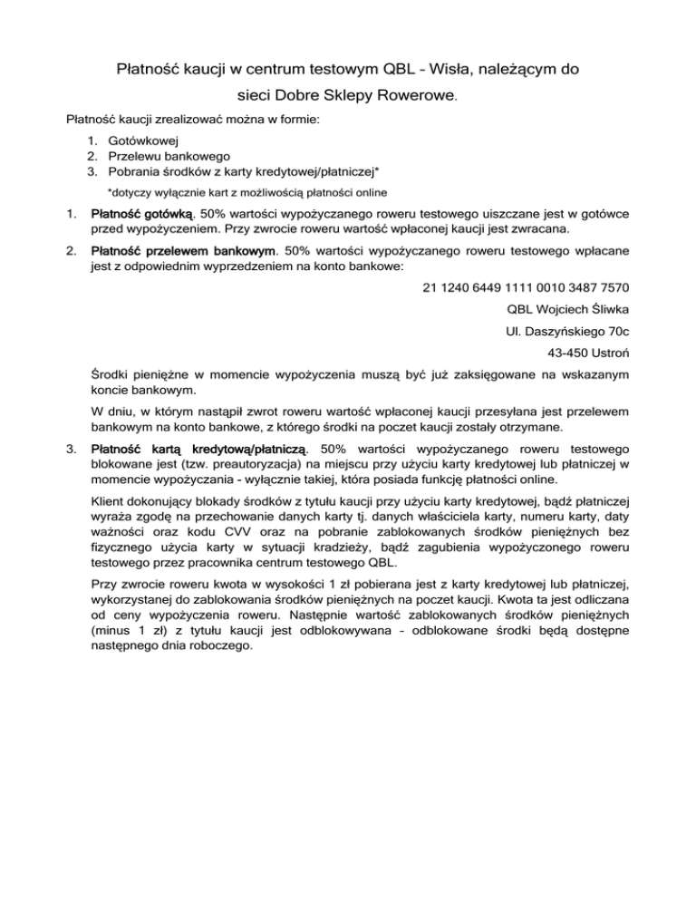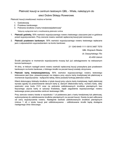 Płatność kaucji w centrum testowym QBL – Wisła, należącym do sieci Dobre Sklepy Rowerowe. Płatność kaucji zrealizować można w formie: 1. Gotówkowej 2. Przelewu bankowego 3. Pobrania środków z karty kredytowej/płatniczej* *dotyczy wyłącznie kart z możliwością płatności online 1. Płatność gotówką. 50% wartości wypożyczanego roweru testowego uiszczane jest w gotówce przed wypożyczeniem. Przy zwrocie roweru wartość wpłaconej kaucji jest zwracana. 2. Płatność przelewem bankowym. 50% wartości wypożyczanego roweru testowego wpłacane jest z odpowiednim wyprzedzeniem na konto bankowe: 21 1240 6449 1111 0010 3487 7570 QBL Wojciech Śliwka Ul. Daszyńskiego 70c 43-450 Ustroń Środki pieniężne w momencie wypożyczenia muszą być już zaksięgowane na wskazanym koncie bankowym. W dniu, w którym nastąpił zwrot roweru wartość wpłaconej kaucji przesyłana jest przelewem bankowym na konto bankowe, z którego środki na poczet kaucji zostały otrzymane. 3. Płatność kartą kredytową/płatniczą. 50% wartości wypożyczanego roweru testowego blokowane jest (tzw. preautoryzacja) na miejscu przy użyciu karty kredytowej lub płatniczej w momencie wypożyczania - wyłącznie takiej, która posiada funkcję płatności online. Klient dokonujący blokady środków z tytułu kaucji przy użyciu karty kredytowej, bądź płatniczej wyraża zgodę na przechowanie danych karty tj. danych właściciela karty, numeru karty, daty ważności oraz kodu CVV oraz na pobranie zablokowanych środków pieniężnych bez fizycznego użycia karty w sytuacji kradzieży, bądź zagubienia wypożyczonego roweru testowego przez pracownika centrum testowego QBL. Przy zwrocie roweru kwota w wysokości 1 zł pobierana jest z karty kredytowej lub płatniczej, wykorzystanej do zablokowania środków pieniężnych na poczet kaucji. Kwota ta jest odliczana od ceny wypożyczenia roweru. Następnie wartość zablokowanych środków pieniężnych (minus 1 zł) z tytułu kaucji jest odblokowywana – odblokowane środki będą dostępne następnego dnia roboczego.