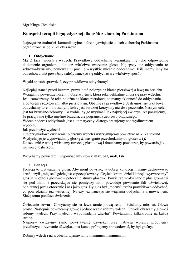 Mgr Kinga Ciesielska Konspekt terapii logopedycznej dla osób z chorobą Parkinsona Najczęstsze trudności komunikacyjne, które pojawiają się u osób z chorobą Parkinsona ograniczone są do kilku obszarów: 1. Oddychanie Ma 2 fazy: wdech i wydech. Prawidłowe oddychanie warunkuje nie tyko odpowiednie dotlenienie organizmu, ale też właściwe tworzenie głosu. Najlepszy tor oddychania to żebrowo-brzuszny, ponieważ tu pracują wszystkie mięśnie oddechowe. Jeśli mamy inny tor oddechowy, niż powyższy należy nauczyć się oddychać we właściwy sposób. W jaki sposób sprawdzić, czy prawidłowo oddychamy? Najlepiej stanąć przed lustrem, prawą dłoń położyć na klatce piersiowej a lewą na brzuchu. Wciągamy powietrze nosem i obserwujemy, która ręka delikatnie unosi się przy wdechu. Jeśli zauważamy, że ręka położna na klatce piersiowej to mamy skłonność do oddychania albo torem szczytowym, albo piersiowym. Oba nie są prawidłowe. Jeśli unosi się ręka lewa, oddychamy torem brzusznym, który jest bardziej korzystny niż dwa pozostałe. Naszym celem jest tor brzuszno-żebrowy. Co zrobić, by go uzyskać? Jak najwięcej ćwiczyć. Aż poczujemy, że pracują nie tylko mięśnie brzucha, ale pogranicza żebrowo-brzusznego. Wdech podczas oddychania jest automatyczny, dlatego pracujemy nad wydłużeniem wydechu. Jak przedłużyć wydech? Oto przykładowe ćwiczenia: bierzemy wdech i wstrzymujemy powietrze na kilka sekund. Wydychając je wypowiadamy głoskę h, następnie przechodzimy do głosek s i f. Do szklanki z wodą wkładamy rureczkę plastikową i dmuchamy powietrze, by powstało jak najwięcej bąbelków. Wdychamy powietrze i wypowiadamy słowa: mat, pat, mak, tak. 2. Fonacja Fonacja to wytwarzanie głosu. Aby mógł powstać, w dobrej kondycji musimy zachowywać krtań, czyli „miejsce” gdzie jest zapoczątkowany. Częścią krtani, dzięki której „wytwarzamy” głos są więzadła głosowe – potocznie struny głosowe. Powietrze wydychane z płuc gromadzi się pod nimi, i przeciskając się pomiędzy nimi powoduje powstanie fali dźwiękowej, odbieranej przez otoczenie i nas jako głos. By głos był „mocny” trzeba prawidłowo oddychać, co powiedziano już wcześniej. Należy też nauczyć się wiązania oddychania z mówieniem. Służą temu poniższe ćwiczenia: Ćwiczenie sowa: Chwytamy się za lewe ramię prawą ręką – ściskamy mięsień. Głowa prosto. Następnie odwracamy głowę i jednocześnie robimy wdech. Powoli obracamy głowę i robimy wydech. Przy wydechu wypowiadamy „hu-hu”. Powtarzamy kilkakrotnie na każdą stronę. Najpierw ćwiczymy samo powstawanie dźwięku, przy nabyciu wprawy próbujemy przedłużyć utrzymanie dźwięku, a na końcu próbujemy spowodować, by był głośny. Robimy wdech i na wydechu wymawiamy mmmmmmmmmmm. Liczymy na przemian głośno i cicho: 1, 2, 3, 4, 5, 6 itd. tak długo, jak damy radę. Najgłośniej, jak potrafimy mówimy: Hej, cześć, dzień dobry itp. 3. Artykulacja Jest powiązana z wytwarzaniem głosu i odnosi się do poziomu jego zrozumiałości. Odpowiadają za nią narządy nasady, czyli to co znajduje się powyżej krtani. Są to jamy: gardłowa, ustna, nosowa, jamy zatok przynosowych. Ponadto język, wargi, żuchwa, podniebienie miękkie. Od ich „kondycji” zależy prawidłowa wymowa i barwa głosu. Jeśli w tym obszarze są jakieś trudności, mamy możliwość poprawienia zrozumiałości wymowy. Służą temu poniższe ćwiczenia: Ustawiamy górną wargę na dolnej i odwrotnie. Układamy usta, jak byśmy chcieli kogoś pocałować. Uśmiechamy się szeroko, następnie przechodzimy do ustawienia ust , jakbyśmy kogoś całowali. Wystawiamy język. Marszczymy brwi - jak przy złości. Unosimy brwi, jak przy zdziwieniu. Ruszamy żuchwą na boki (delikatnie). Masujemy dłońmi policzki. Wymawiamy słowa np.: kolacja, model, fantazja, mocny, abonament, lokomotywa, telewizor. Wymawiamy zdania np.: Dziś jest ładna pogoda. Bardzo Cię lubię. Cieszę się, że Cię widzę. Wszystkie ćwiczenia powtarzamy kilkakrotnie 4. Prozodia mowy Prozodia to linia melodyczna mowy, inaczej mówiąc jest właściwym akcentowaniem wyrazów w zdaniu, prawidłowym intonowaniem całych zdań, mówieniem w odpowiednim rytmie. Jeśli mamy w tym obszarze jakieś trudności, osoby z naszego otoczenia mogą mieć trudności ze zrozumieniem intencji, jakie przekazujemy mówiąc. Na co dzień nie zastanawiamy się nad tym, ale nie tylko treść naszej wypowiedzi ma znaczenia dla osób z którymi rozmawiamy, ale także sposób jej wypowiadania. Ćwiczenia poprawiające prozodię: Wymawiamy zdania o różnej intonacji: Dzień dobry, przyszedłem wcześniej (oznajmiamy), Przepraszam, czemu wczoraj nie przyszedłeś?(pytamy), Proszę, podaj ten kubek!(rozkazujemy). Czytając, tak modulujemy głosem, by wydobyć intencje zawarte w tekście. Bibliografia: Jauer-Niworowska O. Dyzartia nabyta. Diagnoza logopedyczna i terapia osób dorosłych. Wyd. Akademii Pedagogiki Specjalnej. Warszawa 2009. Lewicka T., Rodzeń A. Ćwiczenia rehabilitacyjno-logopedyczne dla osób z chorobą Parkinsona. Warszawa 2006.