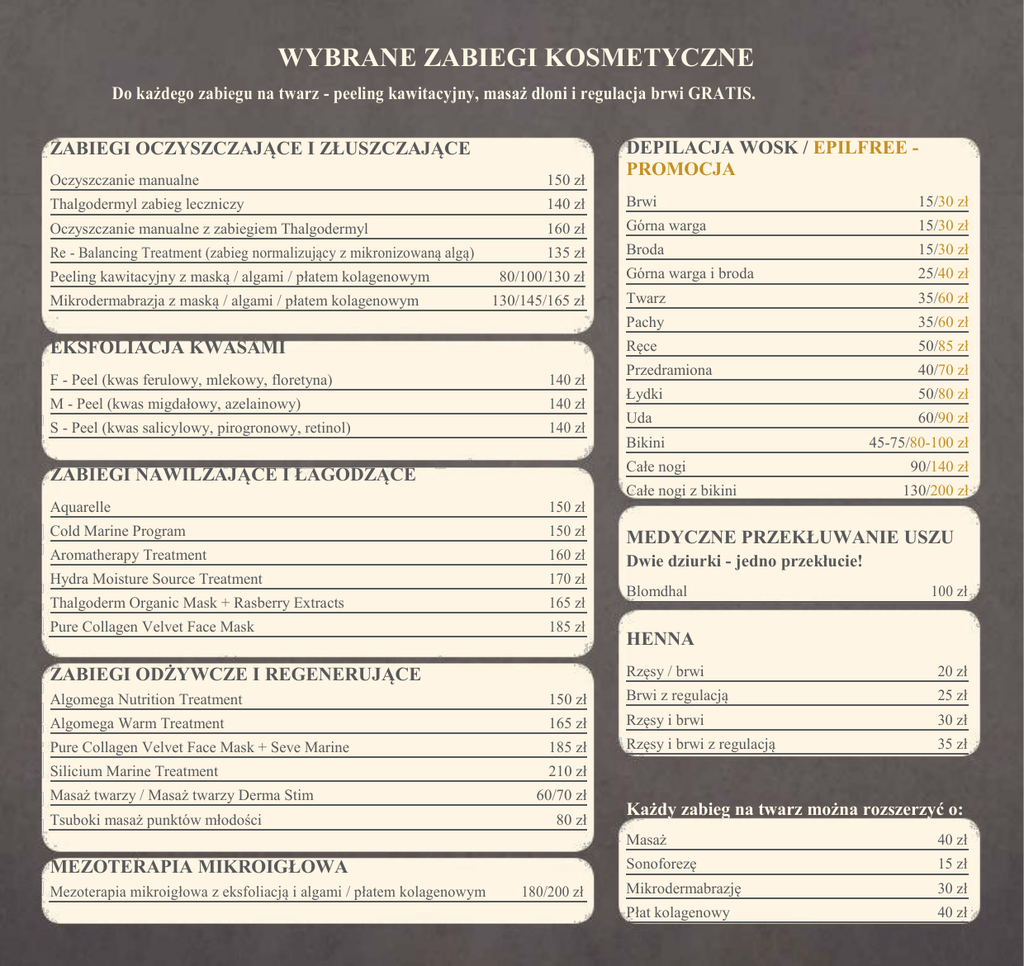 WYBRANE ZABIEGI KOSMETYCZNE Do każdego zabiegu na twarz - peeling kawitacyjny, masaż dłoni i regulacja brwi GRATIS. ZABIEGI OCZYSZCZAJĄCE I ZŁUSZCZAJĄCE DEPILACJA WOSK / EPILFREE PROMOCJA Oczyszczanie manualne 150 zł Thalgodermyl zabieg leczniczy 140 zł Brwi 15/30 zł Oczyszczanie manualne z zabiegiem Thalgodermyl 160 zł Górna warga 15/30 zł 135 zł Broda 15/30 zł Górna warga i broda 25/40 zł Twarz 35/60 zł Pachy 35/60 zł Ręce 50/85 zł Przedramiona 40/70 zł Łydki 50/80 zł Uda 60/90 zł Re - Balancing Treatment (zabieg normalizujący z mikronizowaną algą) Peeling kawitacyjny z maską / algami / płatem kolagenowym Mikrodermabrazja z maską / algami / płatem kolagenowym 80/100/130 zł 130/145/165 zł EKSFOLIACJA KWASAMI F - Peel (kwas ferulowy, mlekowy, floretyna) 140 zł M - Peel (kwas migdałowy, azelainowy) 140 zł S - Peel (kwas salicylowy, pirogronowy, retinol) 140 zł Bikini Całe nogi ZABIEGI NAWILŻAJĄCE I ŁAGODZĄCE Aquarelle 150 zł Cold Marine Program 150 zł Aromatherapy Treatment 160 zł Hydra Moisture Source Treatment 170 zł Thalgoderm Organic Mask + Rasberry Extracts 165 zł Pure Collagen Velvet Face Mask 185 zł Całe nogi z bikini 45-75/80-100 zł 90/140 zł 130/200 zł MEDYCZNE PRZEKŁUWANIE USZU Dwie dziurki - jedno przekłucie! Blomdhal 100 zł HENNA ZABIEGI ODŻYWCZE I REGENERUJĄCE Rzęsy / brwi 20 zł Algomega Nutrition Treatment 150 zł Brwi z regulacją 25 zł Algomega Warm Treatment 165 zł Rzęsy i brwi 30 zł Pure Collagen Velvet Face Mask + Seve Marine 185 zł Rzęsy i brwi z regulacją 35 zł Silicium Marine Treatment 210 zł Masaż twarzy / Masaż twarzy Derma Stim Tsuboki masaż punktów młodości 60/70 zł 80 zł Każdy zabieg na twarz można rozszerzyć o: Masaż 40 zł MEZOTERAPIA MIKROIGŁOWA Sonoforezę 15 zł Mezoterapia mikroigłowa z eksfoliacją i algami / płatem kolagenowym Mikrodermabrazję 30 zł Płat kolagenowy 40 zł 180/200 zł