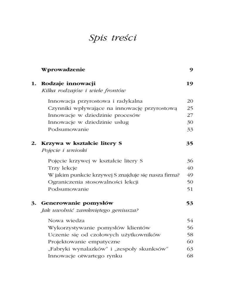 Spis treści Wprowadzenie 1. Rodzaje innowacji Kilka rodzajów i wiele frontów Innowacja przyrostowa i radykalna Czynniki wpływające na innowację przyrostową Innowacje w dziedzinie procesów Innowacje w dziedzinie usług Podsumowanie 2. Krzywa w kształcie litery S Pojęcie i wnioski Pojęcie krzywej w kształcie litery S Trzy lekcje W jakim punkcie krzywej S znajduje się nasza firma? Ograniczenia stosowalności lekcji Podsumowanie 3. Generowanie pomysłów Jak uwolnić zamkniętego geniusza? Nowa wiedza Wykorzystywanie pomysłów klientów Uczenie się od czołowych użytkowników Projektowanie empatyczne „Fabryki wynalazków” i „zespoły skunksów” Innowacje otwartego rynku 9 19 20 25 27 30 33 35 36 40 49 50 51 53 54 56 58 60 63 68 6 Spis treści Rola przygotowania umysłowego W jaki sposób kierownictwo może zachęcać do generowania pomysłów Dwie techniki generowania pomysłów Podsumowanie 4. Rozpoznawanie szans Nie pozwólmy, by się nam wymknęły Metoda rozpoznawania szans Wstępna ocena przydatności dla firmy Podsumowanie 5. Wprowadzenie innowacji na rynek Czy się uda? Lejek pomysłów Systemy faz i bramek Przestroga w sprawie systemu faz i bramek Zagadnienia finansowe Szersze wykorzystanie innowacji za pomocą platform Podsumowanie 6. Kreatywność i kreatywne grupy Dwa klucze do innowacji Mity na temat kreatywności Trzy komponenty kreatywności jednostki Cechy kreatywnych grup Jak radzić sobie z konfliktami w grupie Presja czasu a kreatywność Sześć sposobów na zwiększenie własnej kreatywności Podsumowanie 69 71 78 82 85 88 91 94 97 98 101 104 105 114 116 119 120 122 125 135 137 140 141 Spis treści 7 7. Zwiększanie kreatywności Wzbogacanie organizacji i miejsca pracy 145 Wzbogacanie organizacji Wzbogacanie fizycznego miejsca pracy Podsumowanie 146 159 165 8. Zadania liderów Menedżerowie wiele mogą 167 Kształtowanie kultury sprzyjającej innowacji Wyznaczanie strategicznego kierunku działania Zaangażowanie w innowację Umysł otwarty, ale krytyczny Doskonalenie procesu przejścia od pomysłu do komercyjnego produktu Myślenie portfelowe Wybór odpowiednich ludzi Tworzenie organizacji „oburęcznej” Podsumowanie 168 173 174 177 Dodatek A: Wartość pieniądza w czasie 187 Dodatek B: Przydatne narzędzia 207 Przypisy 217 Słowniczek 221 Lektura uzupełniająca 225 Indeks 231 O konsultancie przedmiotu 239 O autorze 240 178 179 182 183 185 Główne tematy poruszane w tym rozdziale • Innowacja przyrostowa i radykalna • Czynniki sprzyjające innowacji przyrostowej • Innowacja w procesach i usługach Z naczenie słowa „innowacja” jest ujawniane przez jego łaciński rdzeń nova − co znaczy „nowa”. Przez innowację rozumie się zwykle wprowadzanie czegoś nowego, jakiejś nowej rzeczy czy metody. Profesor MIT Ed Roberts zdefiniował kiedyś innowację jako wynalazek i jego wykorzystanie. A oto bardziej dopracowana definicja: Innowacja jest to ucieleśnienie, kombinacja lub synteza wiedzy w postaci oryginalnych, ważnych i cenionych nowych produktów, procesów lub usług. Bez względu na to, jak zdefiniujemy innowację, występuje ona w różnych postaciach. W rozdziale niniejszym zapoznamy się z kilkoma rodzajami innowacji, aby przekonać się, w jaki sposób mogą one pomóc naszej firmie lub rzucić jej wyzwanie. Innowacja przyrostowa i radykalna Badacze innowacji wskazują na ogół na dwa odmienne rodzaje innowacji: innowację przyrostową i radykalną. Przyjmuje się zwykle, że innowacja przyrostowa polega na nowym wykorzystaniu znanych już form czy technologii. Stanowi ona udoskonalenie czegoś, co już istnieje, albo jest Rodzaje innowacji 21 jakąś rekonfiguracją istniejących form czy technologii przeprowadzoną w taki sposób, by służyły nowym celom. W tym też sensie jest to innowacja na krańcach znanych już obszarów. I tak na przykład procesor Pentium IV firmy Intel stanowi innowację przyrostową w stosunku do swego bezpośredniego poprzednika Pentium III, ponieważ oba urządzenia opierają się na tej samej zasadniczo technologii. Pentium IV ma po prostu udoskonalony projekt, dzięki czemu jego sprawność jest wyższa. To samo można powiedzieć o urządzeniach nawigacyjnych opartych na technologii satelitarnej (GPS), jakie instaluje się w wielu luksusowych samochodach: są to nie tyle innowacje, ile zastosowania znanej już technologii GPS w nowym obszarze. Innowacja radykalna jest natomiast czymś całkiem nowym, stanowi odejście od znanych wcześniej technologii czy metod. Często nazywa się ją również innowacją przełomową czy innowacją nieciągłą. Stosunkowo niedawno profesor Clayton Christensen z Harvardu użył terminu technologia burząca, określając nim innowację techniczną potencjalnie zakłócającą cały dotychczasowy model działalności gospodarczej danej firmy czy nawet branży. Innowacje takie niemal zawsze mają charakter radykalny. Technologie burzące wypierają zastaną technologię i przyśpieszają schyłek firm opierających na niej swój model działalności. W wielu wypadkach technologie burzące tworzą nowe rynki. Rynki te są początkowo niewielkie, lecz niekiedy rozrastają się do znacznych rozmiarów. Przykładem innowacji radykalnej jest opracowana w firmie Bell Labs technologia tranzystorowa: zniszczyła ona dominujących wówczas na rynku graczy, którzy byli głęboko zaangażowani w technologię próżniowych lamp elektronowych. To samo można powiedzieć o silniku odrzutowym w latach 40., kiedy lotnictwo było zdominowane przez samoloty śmigłowe. Radykalną innowacją była również 22 Zarządzanie kreatywnością i innowacją opracowana przez IBM z końcem lat 90. technologia chipów krzemowo-germanowych. Pod względem mocy przełączeniowej czterokrotnie przewyższały one konwencjonalne chipy krzemowe i mogły działać przy znacznie mniejszej mocy, dzięki czemu idealnie nadawały się do zastosowań w nowych generacjach telefonów komórkowyc