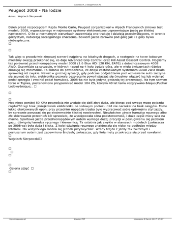 AutoRok.PL / DesignForum.PL Peugeot 3008 - Na lodzie Autor: Wojciech Sierpowski Dzień przed rozpoczęciem Rajdu Monte Carlo, Peugeot zorganizował w Alpach Francuskich zimowy test modelu 3008, wyposażonego w najnowsze systemy elektroniczne usprawniające jazdę po śliskiej nawierzchni. O ile w normalnych warunkach zapewniają one trakcję i działają przeciwślizgowo, w terenie górzystym, nabierają szczególnego znaczenia, bowiem jazda zarówno pod górę jak i z góry bywa niebezpieczna. Tak więc w prawdziwie zimowej scenerii najpierw na lokalnych drogach, a następnie na torze lodowym mieliśmy okazję przekonać się, co daje Advanced Grip Controll oraz Hill Assist Descent Control. Mogliśmy też porównać przednionapędowy model 3008 (1.6 Blue HDi 120 KM, EAT6) z dotychczasowym 4008 AWD. Oczywiście są sytuacje, w których napęd na 4 koła będzie górą, ale w wielu ćwiczeniach różnice okazują się minimalne. To skłania do powiedzenia, że dzięki zastosowanym systemom układ 2WD działa sprawniej niż zwykle. Nawet w groźnej sytuacji, gdy podczas podjeżdżania pod wzniesienie auto zaczyna się zsuwać do tyłu, elektronika pozwala bezpiecznie powoli staczać się (musimy włączyć luz lub wcisnąć pedał sprzęgła i zwolnić pedał hamulca). 3008-ka nie była jedyną gwiazdą tej prezentacji. Na tym samym torze w Tignes, postanowiono przypomnieć model 104 ZS, którym 40 lat temu rozgrywano ‘Puchar Lodowy’. Moc nieco poniżej 80 KMz pewnością nie wydaje się dziś zbyt duża, ale biorąc pod uwagę masę pojazdu rzędu750 kgi brak jakiejkolwiek elektroniki, na lodowym podłożu nikt nie narzekał na brak osiągów. Mimo lekko okolcowanych opon, przy przednim napędzie trzeba było wypracować sobie optymalny styl jazdy, by sprawnie poruszać się po ekstremalnie śliskiej nawierzchni. Niewłaściwe użycie hamulca ręcznego albo złe skierowanie przednich kół sprawiało, że występowała silna podsterowność, i duża część mocy szła na marne. Sportowa jazda przednionapędowym autem wymaga dużej precyzji w posługiwaniu się pedałem gazu, dźwignią hamulca ręcznego i kierownicą. Ta ostatnia jak zwykle w starszych modelach (zwłaszcza po 3008-ce) była duża i śliska. Z kolei dźwignia ręcznego znajdowała się nisko na podłodze między fotelami. Do wszystkiego można się jednak przyzwyczaić. Wtedy frajda z jazdy tak zwrotnym i posłusznym autem jest zapewniona – zwłaszcza, gdy linię mety przekracza się przed rywalami. Wojciech Sierpowski Galeria zdjęć http://mas.auto.pl Kreator PDF Utworzono 2 March, 2017, 15:07