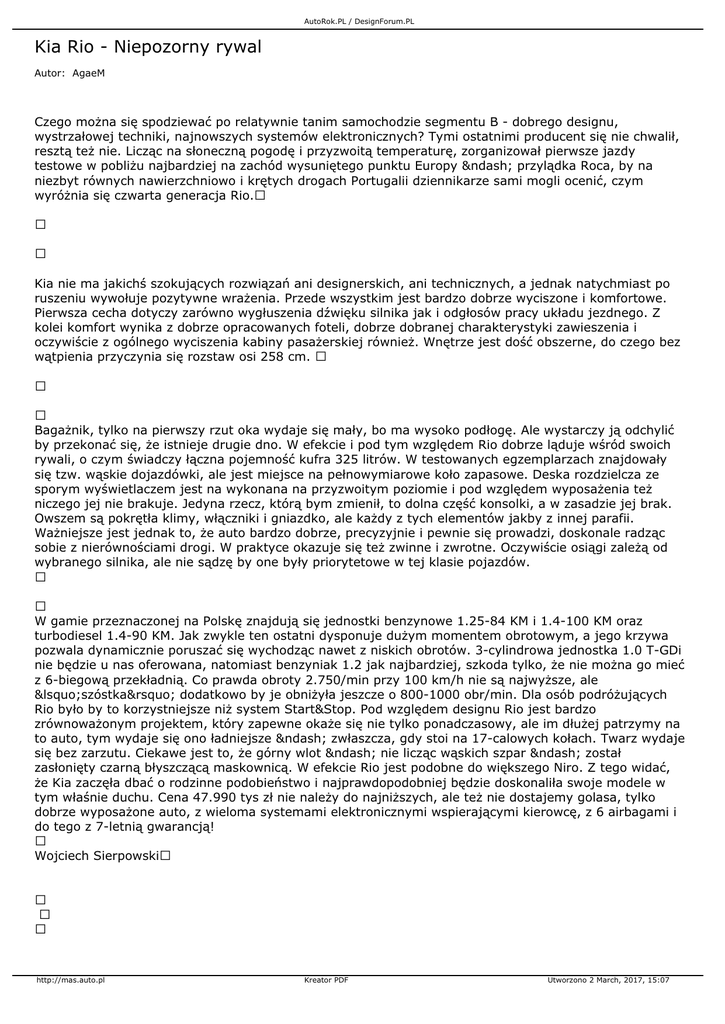 AutoRok.PL / DesignForum.PL Kia Rio - Niepozorny rywal Autor: AgaeM Czego można się spodziewać po relatywnie tanim samochodzie segmentu B - dobrego designu, wystrzałowej techniki, najnowszych systemów elektronicznych? Tymi ostatnimi producent się nie chwalił, resztą też nie. Licząc na słoneczną pogodę i przyzwoitą temperaturę, zorganizował pierwsze jazdy testowe w pobliżu najbardziej na zachód wysuniętego punktu Europy – przylądka Roca, by na niezbyt równych nawierzchniowo i krętych drogach Portugalii dziennikarze sami mogli ocenić, czym wyróżnia się czwarta generacja Rio. Kia nie ma jakichś szokujących rozwiązań ani designerskich, ani technicznych, a jednak natychmiast po ruszeniu wywołuje pozytywne wrażenia. Przede wszystkim jest bardzo dobrze wyciszone i komfortowe. Pierwsza cecha dotyczy zarówno wygłuszenia dźwięku silnika jak i odgłosów pracy układu jezdnego. Z kolei komfort wynika z dobrze opracowanych foteli, dobrze dobranej charakterystyki zawieszenia i oczywiście z ogólnego wyciszenia kabiny pasażerskiej również. Wnętrze jest dość obszerne, do czego bez wątpienia przyczynia się rozstaw osi 258 cm. Bagażnik, tylko na pierwszy rzut oka wydaje się mały, bo ma wysoko podłogę. Ale wystarczy ją odchylić by przekonać się, że istnieje drugie dno. W efekcie i pod tym względem Rio dobrze ląduje wśród swoich rywali, o czym świadczy łączna pojemność kufra 325 litrów. W testowanych egzemplarzach znajdowały się tzw. wąskie dojazdówki, ale jest miejsce na pełnowymiarowe koło zapasowe. Deska rozdzielcza ze sporym wyświetlaczem jest na wykonana na przyzwoitym poziomie i pod względem wyposażenia też niczego jej nie brakuje. Jedyna rzecz, którą bym zmienił, to dolna część konsolki, a w zasadzie jej brak. Owszem są pokrętła klimy, włączniki i gniazdko, ale każdy z tych elementów jakby z innej parafii. Ważniejsze jest jednak to, że auto bardzo dobrze, precyzyjnie i pewnie się prowadzi, doskonale radząc sobie z nierównościami drogi. W praktyce okazuje się też zwinne i zwrotne. Oczywiście osiągi zależą od wybranego silnika, ale nie sądzę by one były priorytetowe w tej klasie pojazdów. W gamie przeznaczonej na Polskę znajdują się jednostki benzynowe 1.25-84 KM i 1.4-100 KM oraz turbodiesel 1.4-90 KM. Jak zwykle ten ostatni dysponuje dużym momentem obrotowym, a jego krzywa pozwala dynamicznie poruszać się wychodząc nawet z niskich obrotów. 3-cylindrowa jednostka 1.0 T-GDi nie będzie u nas oferowana, natomiast benzyniak 1.2 jak najbardziej, szkoda tylko, że nie można go mieć z 6-biegową przekładnią. Co prawda obroty 2.750/min przy 100 km/h nie są najwyższe, ale ‘szóstka’ dodatkowo by je obniżyła jeszcze o 800-1000 obr/min. Dla osób podróżujących Rio było by to korzystniejsze niż system Start&Stop. Pod względem designu Rio jest bardzo zrównoważonym projektem, który zapewne okaże się nie tylko ponadczasowy, ale im dłużej patrzymy na to auto, tym wydaje się ono ładniejsze – zwłaszcza, gdy stoi na 17-calowych kołach. Twarz wydaje się bez zarzutu. Ciekawe jest to, że górny wlot – nie licząc wąskich szpar – został zasłonięty czarną błyszczącą maskownicą. W efekcie Rio jest podobne do większego Niro. Z tego widać, że Kia zaczęła dbać o rodzinne podobieństwo i najprawdopodobniej będzie doskonaliła swoje modele w tym właśnie duchu. Cena 47.990 tys zł nie należy do najniższych, ale też nie dostajemy golasa, tylko dobrze wyposażone auto, z wieloma systemami elektronicznymi wspierającymi kierowcę, z 6 airbagami i do tego z 7-letnią gwarancją! Wojciech Sierpowski http://mas.auto.pl Kreator PDF Utworzono 2 March, 2017, 15:07 AutoRok.PL / DesignForum.PL Galeria zdjęć http://mas.auto.pl Kreator PDF Utworzono 2 March, 2017, 15:07
