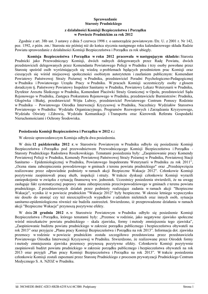 Sprawozdanie Starosty Prudnickiego z działalności Komisji Bezpieczeństwa i Porządku w Powiecie Prudnickim za rok 2012 Zgodnie z art. 38b ust. 3 ustawy z dnia 5 czerwca 1998 r. o samorządzie powiatowym /Dz. U. z 2001 r. Nr 142, poz. 1592, z późn. zm./ Starosta nie później niż do końca stycznia następnego roku kalendarzowego składa Radzie Powiatu sprawozdanie z działalności Komisji Bezpieczeństwa i Porządku za rok ubiegły. Komisja Bezpieczeństwa i Porządku w roku 2012 pracowała w następującym składzie: Starosta Prudnicki jako Przewodniczący Komisji, dwóch radnych delegowanych przez Radę Powiatu, dwóch przedstawicieli delegowanych przez Komendanta Powiatowego Policji w Prudniku i trzy osoby powołane przez Starostę spośród osób wyróżniających się wiedzą o problemach będących przedmiotem prac Komisji oraz cieszących się wśród miejscowej społeczności osobistym autorytetem i zaufaniem publicznym: Komendant Powiatowy Państwowej Straży Pożarnej w Prudniku, przedstawiciel Poradni Psychologiczno-Pedagogicznej w Prudniku i Powiatowego Urzędu Pracy w Prudniku. W pracach Komisji uczestniczyły osoby z głosem doradczym tj. Państwowy Powiatowy Inspektor Sanitarny w Prudniku, Powiatowy Lekarz Weterynarii w Prudniku, Dyrektor Aresztu Śledczego w Prudniku, Komendant Placówki Straży Granicznej w Opolu, przedstawiciel Sądu Rejonowego w Prudniku, Zastępca Prokuratora Rejonowego w Prudniku, przedstawiciele Burmistrzów: Prudnika, Głogówka i Białej, przedstawiciel Wójta Lubrzy, przedstawiciel Powiatowego Centrum Pomocy Rodzinie w Prudniku – Powiatowego Ośrodka Interwencji Kryzysowej w Prudniku, Naczelnicy Wydziałów Starostwa Powiatowego w Prudniku: Wydziału Organizacyjnego, Programów Rozwojowych i Zarządzania Kryzysowego, Wydziału Oświaty i Zdrowia, Wydziału Komunikacji i Transportu oraz Kierownik Referatu Gospodarki Nieruchomościami i Ochrony Środowiska. Posiedzenia Komisji Bezpieczeństwa i Porządku w 2012 r.: W okresie sprawozdawczym Komisja odbyła dwa posiedzenia. W dniu 12 października 2012 r. w Starostwie Powiatowym w Prudniku odbyło się posiedzenie Komisji Bezpieczeństwa i Porządku pod przewodnictwem Przewodniczącego Komisji Bezpieczeństwa i Porządku Starosty Prudnickiego Radosława Roszkowskiego. Tematami posiedzenia były: „Zaopiniowanie pracy Komendy Powiatowej Policji w Prudniku, Komendy Powiatowej Państwowej Straży Pożarnej w Prudniku, Powiatowej Stacji Sanitarno - Epidemiologicznej w Prudniku, Powiatowego Inspektoratu Weterynarii w Prudniku za rok 2011”, „Ocena stanu zabezpieczenia powodziowego w gminach z terenu powiatu prudnickiego" oraz „Przedsięwzięcia realizowane przez odpowiednie podmioty w ramach akcji Bezpieczne Wakacje 2012". Członkowie Komisji pozytywnie zaopiniowali pracę służb, inspekcji i straży. W trakcie dyskusji członkowie Komisji wyrazili zaniepokojenie w związku z sytuacją finansową ww. jednostek. Uczestnicy posiedzenia stwierdzili, że na uwagę zasługuje fakt systematycznej poprawy stanu zabezpieczenia przeciwpowodziowego w gminach z terenu powiatu prudnickiego. Z przedstawionych działań przez podmioty realizujące zadania w ramach akcji "Bezpieczne Wakacje", wynika iż w powiecie prudnickim "Wakacje 2012" były bezpieczne. W okresie letniego wypoczynku nie doszło do utonięć czy też nieszczęśliwych wypadków z udziałem nieletnich oraz innych osób, sytuacja sanitarno-epidemiologiczna również nie budziła zastrzeżeń. Stwierdzono, iż przeprowadzone działania w ramach akcji "Bezpieczne Wakacje" przynoszą pozytywne efekty. W dniu 28 grudnia 2012 r. w Starostwie Powiatowym w Prudniku odbyło się posiedzenie Komisji Bezpieczeństwa i Porządku, którego tematami były: „Przemoc w rodzinie, jako negatywne zjawisko społeczne wśród mieszkańców powiatu prudnickiego – skala zjawiska, formy i metody zmniejszenia tego zjawiska”, „Zaopiniowanie budżetu powiatu prudnickiego w zakresie porządku publicznego i bezpieczeństwa obywateli na rok 2013” oraz przyjęcie „Planu pracy Komisji Bezpieczeństwa i Porządku na rok 2013”. Informacja dot. zjawiska przemocy w rodzinie w powiecie prudnickim została szczegółowo przedstawiona przez przedstawiciela Powiatowego Ośrodka Interwencji Kryzysowej w Prudniku. Stwierdzono, że realizowane przez Ośrodek formy i metody zmniejszenia zjawiska przemocy przynoszą pozytywne efekty. Członkowie Komisji pozytywnie zaopiniowali budżet powiatu prudnickiego w zakresie porządku publicznego i bezpieczeństwa obywateli na rok 2013 oraz przyjęli „Plan pracy Komisji Bezpieczeństwa i Porządku na rok 2013”. W trakcie posiedzenia członkowie Komisji zostali zapoznani przez Starostę Prudnickiego z procesem prywatyzacji Prudnickiego Centrum Medycznego S. A. NZOZ w Prudniku. ————————————————————————————————————————————————————————— Id: 30C04EDE-B6EC-42E3-8B2B-625FAA14C3B0. Podpisany Strona 1 Inne działania Komisji Bezpieczeństwa i Porządku: - opublikowany w 2008 r. w ramach działalności Komisji Bezpieczeństwa i Porządku Informator Powiatowy „Szukaj Pomocy” dotyczący lokalnej oferty pomocy w zakresie problemów alkoholowych, narkotykowych oraz przemocy wrodzinie i wykluczenia społecznego dostępny na stronie internetowej Starostwa Powiatowego w Prudniku (www.powiatprudnicki.pl) został zaktualizowany w maju 2012 r. Uchwalony przez Radę Powiatu w Prudniku w dniu 28 stycznia 2011 r. „Powiatowy Program Zapobiegania Przestępczości oraz Ochrony Bezpieczeństwa Obywateli i Porządku Publicznego na lata 20112013” zawiera następujące priorytety: - wzrost poczucia bezpieczeństwa wśród mieszkańców w miejscach publicznych i w miejscu zamieszkania, - wzrost bezpieczeństwa w szkole, - przeciwdziałanie przemocy, - ograniczanie zjawiska narkomanii i alkoholizmu, - wzrost bezpieczeństwa w ruchu d