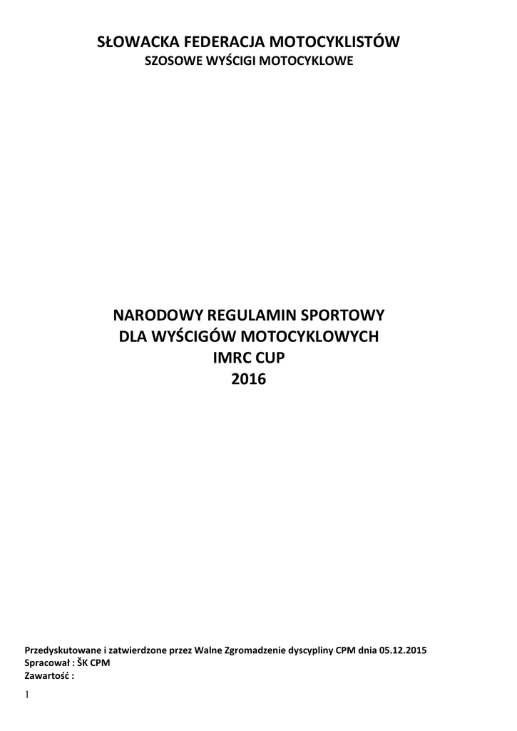 SŁOWACKA FEDERACJA MOTOCYKLISTÓW SZOSOWE WYŚCIGI MOTOCYKLOWE NARODOWY REGULAMIN SPORTOWY DLA WYŚCIGÓW MOTOCYKLOWYCH IMRC CUP 2016 Przedyskutowane i zatwierdzone przez Walne Zgromadzenie dyscypliny CPM dnia 05.12.2015 Spracował : ŠK CPM Zawartość : 1 Postanowienia ogólne ................................................................................................................................ 3 Zawodnicy ................................................................................................................................................. 3 Tor wyścigowy ........................................................................................................................................... 4 Podstawowe przepisy techniczne ............................................................................................................ 4 Delegaci ..................................................................................................................................................... 4 Zgłoszenia ................................................................................................................................................. 5 Wpisowe ................................................................................................................................................... 5 Kontrola techniczna i administracyjna ...................................................................................................... 5 Treningi .................................................................................................................................................... 6 Wyścigi ..................................................................................................................................................... 6 Ocena ....................................................................................................................................................... 6 Nagrody .................................................................................................................................................... 6 Ocena serii MM SR ................................................................................................................................... 6 Protesty i odwołania ................................................................................................................................. 7 Inne sankcje .............................................................................................................................................. 7 Postanowienia końcowe ........................................................................................................................... 7 Ważność ................................................................................................................................................... 7 2 1. Postanowienia ogólne a. Słowacka Federacja Motocyklowa – Sportowa komisja szosowych wyścigów motocyklowych ogłasza w sezonie sportowym 2016, Słowacki Puchar szosowych wyścigów motocyklowych (SP CPM) w ramach serii IMRC-CUP z osobnym systemem klasyfikacji narodowej krajów biorących udział w wyścigach, w grupach: -Grupa do 600ccm + Junior do 21lat (odbędzie się w przypadku, jeżeli do dnia 31.03 będzie w niej wydanych minimalnie 5 licencji SMF) -Grupa nad 600ccm b. Seria IMRC-CUP odbędzie się według postanowień FIM/FIM Europe / AA Rules / i niniejszego Narodowego Regulaminu Sportowego (NŠP) c. Seria IMRC Cup składa się z czterech serii dwudniowych wyścigów, przy czym kwalifikacja jest możliwa już po trzech odbytych seriach. Harmonogram wyścigów zostanie umieszczony w kalendarzu CPM dla sezonu sportowego 2016. d. Częścią serii mogą być również wyścigi innych grup, które muszą zyskać pozwolenie Sportowej Komisji CPM oraz muszą być umieszczone w Specjalnych postanowieniach serii. e. Organizator ma obowiązek opracować Postanowienia specjalne imprezy, którą organizuje. Minimalnie 30 dni przed terminem imprezy jest zobowiązany wysłać je dyrektorowi SMF dla CMP w celu utrzymania zgody oraz do sekretariatu SMF w celu uzyskania klauzuli zatwierdzającej. Po otrzymaniu zgody, sekretariat SMF opublikuje Postanowienia Specjalne wraz z harmonogramem na oficjalnej stronie internetowej SMF oraz doręczy osobom odpowiedzialnym za wyścigi. f. Zgłoszenia na wyścigi są wysyłane organizatorowi do zamknięcia terminu zgłoszeń. Organizator jest zobowiązany zgłoszenia utrzymywać w porządku. W dniu wyścigów przed rozpoczęciem administracyjnego przeglądu jest zobowiązany przekazać listę zgłoszonych zawodników z wyznaczoną datą otrzymania, dyrektorowi wyścigów. g. Postanowienia specjalne wyścigów muszą posiadać : Nazwę wyścigów, datę oraz miejsce konania - Dokładną nazwę, adres, numer telefonu, fax oraz/lub E-mail organizatora - Imiona i nazwiska delegowanych oraz pozostałych osób odpowiedzialnych za wyścigi - Miejsce posiedzenia Jury/Komisji sportowej - Czasowy harmonogram wyścigów wraz z administracyjnym i technicznym przeglądem - Czas trwania wyścigów w każdej (w minutach, okręgach lub metrach) - Miejsce przekazania nagród oraz listę nagród h. Organizatorzy są zobowiązani zaakceptować wszystkie licencje SMF jako wolne wejściówki na organizowane przez nich wyścigi. Również mają obowiązek wydać zawodnikom oraz ich zespołom wyraźnie oznaczone wejściówki, z oznaczeniem miejsc, gdzie uprawniają posiadacza do wejścia. 2. Zawodnicy 2.1. W serii wyścigów IMRC-CUP z możliwością klasyfikacji, mogą wziąć udział: - zawodnicy – posiadacze całorocznej licencji „B“ Szosowych wyścigów motocyklowych Słowackiej federacji motocyklowej - zagraniczni zawodnicy, posiadacze międzynarodowej licencji swojego kraju, (dalej FMN) z pozwoleniem na start narodowej federacji oraz z aktualnym ubezpieczeniem zabezpieczającym finansowanie leczenia za granicam