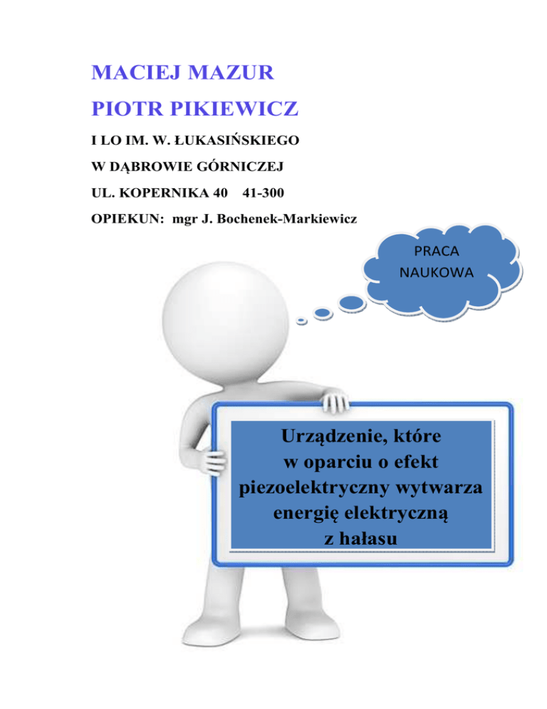 MACIEJ MAZUR PIOTR PIKIEWICZ I LO IM. W. ŁUKASIŃSKIEGO W DĄBROWIE GÓRNICZEJ UL. KOPERNIKA 40 41-300 OPIEKUN: mgr J. Bochenek-Markiewicz PRACA NAUKOWA Urządzenie, które w oparciu o efekt piezoelektryczny wytwarza energię elektryczną z hałasu 1 SPIS TREŚCI I. CZĘŚĆ TEORETYCZNA……………………………………..……...……………4 Rozdział 1. Wprowadzenie……………………………….……………………………5 1.1 Wstęp…………………………………………………………………………….5 Rozdział 2. Piezoelektryk i zjawisko piezoelektryczne………………………………6 2.1 Ogólna charakterystyka piezoelektryków……………...…………………………6 2.2 Przedstawienie zależności między naprężeniem i odkształceniem……………….7 2.3 Wyjaśnienie zjawiska piezoelektrycznego………………………………………..8 2.4 Wielkości opisujące piezoelektryk………………..……………………………..10 Rozdział 3. Pojęcie dźwięku i hałasu…………………………………………………13 3.1 Źródło energii dla naszego urządzenia……………………………...………….13 Rozdział 4. Piezo-przetworniki i superkondensator…………………………..…….14 4.1 Piezo-przetworniki…………………………………...…………………………14 4.2 Superkondensator……………………………………………………………….15 II. CZĘŚĆ BADAWCZA…………………………………………………………….16 Rozdział 1. Przetwornik mechanoelektryczny……………………………………...17 1.1 Wykorzystanie przetwornika mechanoelektrycznego……………………….....17 Rozdział 2. Opis techniczny urządzenia……………………………………………..18 2.1 Piezoelektryki…………………………………………………………………...18 2.2 Przekształcenia sygnału zmiennego na sygnał stały……………………………19 2.3 Magazyn energii………………………………………………………………...21 2 Rozdział 3. Identyfikacja źródła hałasu i dobranie parametrów urządzenia odbiorczego…………………………………………………………………………….22 3.1 Identyfikacja źródła hałasu…………………...……………………………...…22 3.2 Dobranie parametrów urządzenia odbiorczego…………………...…………....23 Rozdział 4. Wykonanie urządzenia wykorzystującego energię z hałasu i wyniki pomiarów………………………………………………………………………………25 4.1 Wykonanie urządzenia………………………………………………………….25 4.2 Wyliczenia czasu ładowania superkondensatora.................................................29 4.3 Historia naszej pracy……………………………………………………………30 III. PODSUMOWANIE I WNIOSKI……………………………………………..…33 ZAŁĄCZNIK NR 1 - Tabela zbiorcza wyników w programie Excel………......….36 ZAŁĄCZNIK NR 2 - Kilka słów technika…………….……………………...……..37 BIBLIOGRAFIA……………………………………………………………………...38 ŹRÓDŁA INTERNETOWE…………………………………………………………38 SPIS RYSUNKÓW…………………………………………………………………...39 3 I. CZĘŚĆ TEORETYCZNA 4 Rozdział 1. Wprowadzenie 1.1 Wstęp W dobie bezsprzecznego, bezkompromisowego rozwoju naszej cywilizacji i jednoczesnej walki o przetrwanie przyrody, połączenie fizyki i ekologii, zmierzające do polepszenia jakości stanu środowiska i podniesienia komfortu ludzkiego życia – jest rzeczą priorytetową w obecnych czasach. Dzięki takiej walce, człowiek dąży do zmniejszenia eksploatacji środowiska, lepszego z nim współistnienia, a także o zachowanie go w jak najmniej zmienionym stanie dla przyszłych pokoleń. Wraz ze wzrostem ludzkiej populacji, a także wszechobecnej komputeryzacji, istnieje coraz większe zapotrzebowanie na energię. Ludzkość nadal pozyskuje ją w większej części z zasobów naturalnych, w sposób tradycyjny, choćby wykorzystując do tego elektrownie węglowe, które pomimo coraz nowszej technologii nadal w dużym stopniu niszczą środowisko naturalne. Innymi sposobami na pozyskiwanie tej energii są choćby elektrownie jądrowe, które także pociągają za sobą eksploatację natury (kopalnie odkrywkowe), ponadto wymagają składowania odpadów radioaktywnych. Coraz częściej sięgamy po inne rodzaje energii – energię odnawialną, czyli świetlną, wiatrową, bio – masę i wodną. Nawet te, uważane za ekologiczne źródła energii, mogą nieść niekorzystne skutki dla środowiska. O ile energia świetlna, wiatrowa jest bezpieczna, tak bio-masa czy energia wodna już nie zawsze. Doskonałym przykładem jest ,,Zapora Trzech Przełomów”, zatrzymująca życiodajny muł rzeki Jangcy, co powoduje osuszanie się i brak żyzności pobliskich ziem – madów. Do kwestii energetycznej trzeba więc podejść nieco inaczej. Należy wymyślić sposoby pozyskiwania energii, nieszkodzące środowisku i odciążające główne elektrownie. W naszym projekcie proponujemy rozparcelowanie sieci energetycznej na ogromną liczbę małych układów elektrycznych, zdolnych pozyskać energię z tego, czego nam nie zbywa, co więcej z tego co nam przeszkadza – hałasu. Powyższe argumenty zainspirowały nas do opracowania tego tematu, dlatego też stworzyliśmy ekologiczne urządzenie, które w oparciu o efekt piezoelektryczny tworzy energię właśnie z hałasu. Dzięki niemu nieco odciążylibyśmy zwykłe elektrownie elektryczne, 5 co dałoby wymierne korzyści dla środowiska, a w dalszej perspektywie polepszyłoby jakość ludzkiego życia