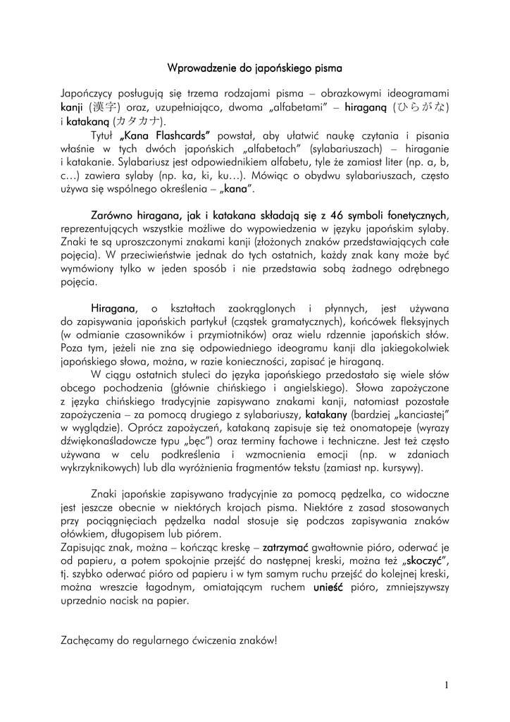 Wprowadzenie do japońskiego pisma Japończycy posługują się trzema rodzajami pisma – obrazkowymi ideogramami kanji ( 漢 字 ) oraz, uzupełniająco, dwoma „alfabetami” – hiraganą ( ひ ら が な ) i katakaną (カタカナ). Tytuł „Kana Flashcards” powstał, aby ułatwić naukę czytania i pisania właśnie w tych dwóch japońskich „alfabetach” (sylabariuszach) – hiraganie i katakanie. Sylabariusz jest odpowiednikiem alfabetu, tyle że zamiast liter (np. a, b, c…) zawiera sylaby (np. ka, ki, ku…). Mówiąc o obydwu sylabariuszach, często używa się wspólnego określenia – „kana kana”. kana Zarówno hiragana, jak i katakana składają się z 46 symboli fonetycznych, fonetycznych reprezentujących wszystkie możliwe do wypowiedzenia w języku japońskim sylaby. Znaki te są uproszczonymi znakami kanji (złożonych znaków przedstawiających całe pojęcia). W przeciwieństwie jednak do tych ostatnich, każdy znak kany może być wymówiony tylko w jeden sposób i nie przedstawia sobą żadnego odrębnego pojęcia. Hiragana, Hiragana o kształtach zaokrąglonych i płynnych, jest używana do zapisywania japońskich partykuł (cząstek gramatycznych), końcówek fleksyjnych (w odmianie czasowników i przymiotników) oraz wielu rdzennie japońskich słów. Poza tym, jeżeli nie zna się odpowiedniego ideogramu kanji dla jakiegokolwiek japońskiego słowa, można, w razie konieczności, zapisać je hiraganą. W ciągu ostatnich stuleci do języka japońskiego przedostało się wiele słów obcego pochodzenia (głównie chińskiego i angielskiego). Słowa zapożyczone z języka chińskiego tradycyjnie zapisywano znakami kanji, natomiast pozostałe zapożyczenia – za pomocą drugiego z sylabariuszy, katakany (bardziej „kanciastej” w wyglądzie). Oprócz zapożyczeń, katakaną zapisuje się też onomatopeje (wyrazy dźwiękonaśladowcze typu „bęc”) oraz terminy fachowe i techniczne. Jest też często używana w celu podkreślenia i wzmocnienia emocji (np. w zdaniach wykrzyknikowych) lub dla wyróżnienia fragmentów tekstu (zamiast np. kursywy). Znaki japońskie zapisywano tradycyjnie za pomocą pędzelka, co widoczne jest jeszcze obecnie w niektórych krojach pisma. Niektóre z zasad stosowanych przy pociągnięciach pędzelka nadal stosuje się podczas zapisywania znaków ołówkiem, długopisem lub piórem. Zapisując znak, można – kończąc kreskę – zatrzymać zatrzymać gwałtownie pióro, oderwać je od papieru, a potem spokojnie przejść do następnej kreski, można też „skoczyć skoczyć”, skoczyć tj. szybko oderwać pióro od papieru i w tym samym ruchu przejść do kolejnej kreski, można wreszcie łagodnym, omiatającym ruchem unieść pióro, zmniejszywszy uprzednio nacisk na papier. Zachęcamy do regularnego ćwiczenia znaków! 1 Zasady wymowy Język japoński, podobnie do łacińskiego, ma tylko pięć samogłosek, które brzmią krótko i czysto: a i u e o jak jak jak jak jak a i u e o w wyrazie „mama” (Japończycy trochę szerzej otwierają przy tym usta), w wyrazie „kit”, w wyrazie „duch” (z lekko spłaszczonymi wargami, jak do „y”), w wyrazie „mecz”, w wyrazie „nos”. Dwugłoskę „ei ei” ee”). ei wymawia się jak przedłużone „e” („ee ee W języku japońskim istnieją przedłużone samogłoski, które wymawia się dwa razy dłużej niż zwykłe, a które w łacińskiej transkrypcji oznacza się poziomą kreską nad literą (np. ā, ē, ō, ū – wyjątek stanowi przedłużone „i”, które zapisuje się najczęściej jako „iiii”). ii W hiraganie przedłużone samogłoski zapisuje się, dostawiając za samogłoską jeszcze jedną taką samą, np. ā to ああ („aa”). Wyjątkiem jest tu ō, które zazwyczaj przedłuża się, dostawiając za „o” symbol „u” – おう („ou”). Tylko w wyjątkowych przypadkach pojawiają się obok siebie symbole おお („oo”). W katakanie przedłużona samogłoska zaznaczana jest za pomocą poziomej kreski, stawianej za samogłoską (np. „aa” to ア―). Japońskie spółgłoski są wymawiane w większości podobnie jak w języku polskim, należy jednak pamiętać, że zapisywane są w transkrypcji międzynarodowej, dlatego wymawia się: ch j sh v w y jak jak jak jak jak jak ć dź ś w ł j w wyrazie „cisza”, w wyrazie „dzik”, w wyrazie „sito”, w wyrazie „widok”, w wyrazie „ładny”, w wyrazie „jama”. Głoskę „rr” wymawia się bez drgania języka – tylko z jego pojedynczym uderzeniem, dlatego może brzmieć podobnie do „ll”. Spółgłoska „n n”, oprócz tego, że występuje w sylabach (na, ni, nu, ne, no), może także stać samodzielnie – po innej sylabie lub na końcu wyrazu. Wymawia się je wtedy nosowo, jak w wyrazach „bank” czy „Anglia”. Zmienia też stojącą przed nim samogłoskę w samogłoskę wypowiadaną nosowo. Jeżeli po „n” stoi sylaba zaczynająca się na „b”, „m” lub „p”, to „n” wymawia się jak „m” (np. wyraz „enpitsu” wymawia się „empitsu”). Można tez usłyszeć różną wymowę głosek „zz” (jako „z” lub „dz”) oraz „jj” (jako „ź” lub „dź”), gdyż Japończycy ich nie rozróżniają. Głoskę „ff” w sylabie „fu” wypowiada się bez dotykania zębami dolnej wargi, dlatego jest to dźwięk pośredni między „h” a „f”. Zarówno hiragana, jak i katakana używają graficznie pomniejszonego znaku „tsu” (odpowiednio: っ i ッ) do podwajania spółgłosek w sylabach (np. do podwojenia „t” w wyrazie „kitte”). Znaczek ten stawia się przed sylabą, której spółgłoskę się podwaja (czyli wyraz „kitte” w hiraganie wygląda tak: き っ て , a w katakanie – tak: キ ッ テ ). Należy jednak pamiętać, aby podwójnych spółgłosek nie wymawiać podwójnie, jak w polskim wyrazie „lekki”, a jedynie robić krótką pauzę, wstrzymując powietrze przed wypowiedzeniem po