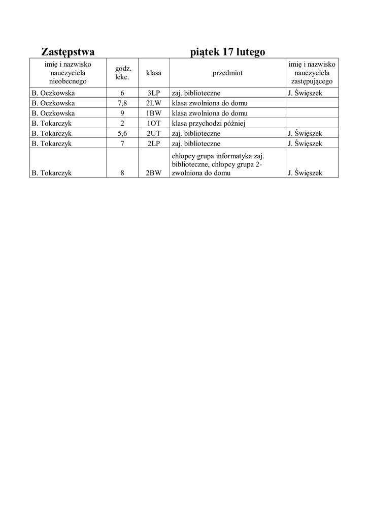 Zastępstwa imię i nazwisko nauczyciela nieobecnego B. Oczkowska B. Oczkowska B. Oczkowska B. Tokarczyk B. Tokarczyk B. Tokarczyk B. Tokarczyk piątek 17 lutego godz. lekc. klasa 6 7,8 9 2 5,6 7 3LP 2LW 1BW 1OT 2UT 2LP zaj. biblioteczne klasa zwolniona do domu klasa zwolniona do domu klasa przychodzi później zaj. biblioteczne zaj. biblioteczne 2BW chłopcy grupa informatyka zaj. biblioteczne, chłopcy grupa 2zwolniona do domu 8 przedmiot imię i nazwisko nauczyciela zastępującego J. Święszek J. Święszek J. Święszek J. Święszek