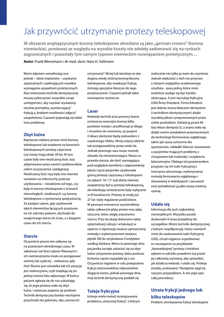 Jak przywrócić utrzymanie protezy teleskopowej W obszarze anglojęzycznym korony teleskopowe określane są jako „german crowns” (korony niemieckie), ponieważ ze względu na wysokie koszty nie zdołały zadomowić się na rynkach zagranicznych i pozostały tym samym typowo niemieckim rozwiązaniem protetycznym… Autor: Frank Wennmann i dr med. dent. Hans H. Sellmann Moim zdaniem umożliwiają one jednak – obok implantów – uzyskanie optymalnych i spełniających wszelkie wymagania uzupełnień protetycznych. Nasi mistrzowie techniki dentystycznej muszą wykorzystać wszystkie swoje umiejętności, aby uzyskać wyważony rezultat pomiędzy „wystarczającą” frykcją a „brakiem możliwości zdjęcia” uzupełnienia. Czasami pojawiają się także inne problemy: Zbyt luźne Najstarsze oddane przeze mnie korony teleskopowe lub osadzone na koronach teleskopowych protezy częściowe czy mosty mają około 30 lat. W tym czasie były one niezliczoną ilość razy zdejmowane przez swoich użytkowników celem oczyszczenia i pielęgnacji. Niezliczoną ilość razy były one również narażone na mikroruchy podczas użytkowania – niezależnie od tego, czy były to korony teleskopowe o ścianach równoległych, stożkowych czy korony teleskopowe z wyrównaną sprężystością. Za każdym razem, gdy użytkownik takich elementów łączących przeżuwa na ich odcinku pokarm, dochodzi do wzajemnego tarcia ich ścian, a z biegiem czasu do ich starcia. Starcie Oczywiście proces ten odbywa się na przestrzeni określonego czasu. W zależności od ilości zębów filarowych i ich rozmieszczenia może on postępować wolniej lub szybciej – zwłaszcza, gdy ilość filarów jest niewielka lub ich pozycja jest niekorzystna, czyli znajdują się po jednej stronie łuku zębowego. W końcu pacjent zgłasza się do nas uskarżając się, że jego proteza stała się zbyt luźna. I wówczas pojawia się problem. Technik dentystyczny bardzo niechętnie przychodzi do gabinetu, aby „wzmocnić utrzymanie”. Mniej lub bardziej na oko dogina wtedy wtórną koronę/korony teleskopowe, aby zwiększyć frykcję (istnieją specjalne kleszcze do tego przeznaczone). Czasami jednak takie rozwiązanie wystarcza. Laser Niekiedy technik przy pomocy lasera umieszcza wewnątrz korony kilka punktów metalu i zeszlifowuje je długo i mozolnie do momentu, aż pacjent (i lekarz dentysta) będą zadowoleni z uzyskanego efektu. Mniej więcej właśnie tak postępowaliśmy przez wiele lat. Jednak pewnego razu nasze metody okazały się niewystarczające. Nasza co prawda starsza, ale dość wymagająca pod względem komfortu i odpowiedniej jakości życia pacjentka użytkowała górną protezę częściową z teleskopami na zębach 16 i 17. Łuk dolny również zaopatrzony był w protezę teleskopową, ale teleskopy umieszczone były wyłącznie w III kwadrancie. Protezy te miały już 27 lat i były regularnie podścielane. W pewnym momencie wymieniliśmy także całkowicie płyty protez oraz zęby sztuczne, które uległy znacznemu starciu. Przy tej okazji dokonano także optymalizacji okluzji i artykulacji w oparciu o rejestrację zwarcia uproszczoną metodą z wykorzystaniem zestawu płytek SM do artykulatora Condylator według Gerbera. Mimo to pewnego dnia pacjentka zaczęła uskarżać się na zbyt luźne utrzymanie protezy, która podczas kichania często wypadała jej z ust. Oczywiście najpierw w celu polepszenia frykcji zastosowaliśmy odpowiednie dogięcie koron, jednak pewnego dnia mój technik dentystyczny poddał się. Tuleja frykcyjna Istnieje wiele metod rozwiązywania problemu „utraconej frykcji”, z którym widocznie nie tylko ja mam do czynienia. Jednak większość z nich nie przynosi z różnych względów oczekiwanego rezultatu - poza jedną, która mnie osobiście wydaje się być bardzo obiecująca. A jest nią tuleja frykcyjna USIG firmy Erkodent. Firma Erkodent jest dobrze znana lekarzom dentystom (i technikom dentystycznym) dzięki wysokiej jakości proponowanych przez siebie produktów. Założył ją przed 40 laty lekarz dentysta (!), a znana stała się dzięki swoim produktom przeznaczonym do technologii formowania wgłębnego, takim jak szyny ochronne dla sportowców, nakładki Silensor stosowanie u pacjentów mających problemy z chrapaniem lub materiały i urządzenia laboratoryjne. Dlatego też postanowiłem przyjrzeć się ich tulei frykcyjnej z tworzywa sztucznego, wykonywanej metodą formowania wgłębnego i stosowanej w teleskopach i zasuwach oraz potraktować ją jako naszą ostatnią szansę. Udało się Informacja dla tych najbardziej niecierpliwych: Wszystko poszło doskonale! A teraz przejdźmy do szczegółów. Mistrz techniki dentystycznej, z którym współpracuję i który namówił mnie do zastosowania tulei frykcyjnej USIG, chciał najpierw wypróbować to rozwiązanie na przykładzie „beznadziejnej” protezy z krótkimi zębami w odcinku przednim tuż przed jej całkowitą wymianą, aby sprawdzić, jak działa ta metoda. I udało się. Proteza została „uratowana”. Następnie zajął się naszym przypadkiem. A oto jego opis całej procedury: Utrata frykcji jednego lub kilku teleskopów Problem zmniejszenia frykcji teleskopów wtórnych powoduje nieprawidłową stabilizację oraz funkcję protezy. W najbardziej optymalnych przypadkach istnieje wystarczająca ilość teleskopów, które są w stanie skompensować utratę odpowiedniego utrzymania protezy – rzeczywistość jest jednak najczęściej inna. Technik dentystyczny ma kilka możliwości przywrócenia frykcji. Można w tym celu pokryć odpowiednie elementy warstwą złota, nałożyć warstwę lakieru, wbudować elementy frykcyjne z tworzywa sztucznego, dogiąć odpowiednio ściany teleskopu przy pomocy specjalnych kleszczy lub umieścić naprzeciw siebie punkty metalu przy pomocy lasera – ale wszystkie te opcje są rozwiązaniami mniej lub bardziej kompromisowymi. 1) Trudna sytuacja wyjściowa