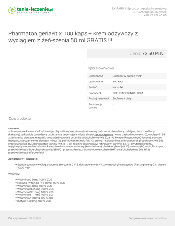 SK-FARM II Sp. z o.o. - Apteka Internetowa ul. Kleeberga 34, Białystok +48 42 279 40 05 Pharmaton geriavit x 100 kaps + krem odżywczy z wyciągiem z żeń-szenia 50 ml GRATIS !!! Cena: 73,50 PLN Opis słownikowy Dostępność Dostępny w aptece w 24h Opakowanie 100 kaps Postać Kapsułki Producent BOEHRINGER INGELHEIM Rodzaj rejestracji Suplement diety Substancja czynna - Opis produktu Składniki sole wapniowe kwasu ortofosforowego, olej roślinny (rzepakowy) rafinowany całkowicie utwardzony, żelatyna, tłuszcz roślinny (kakaowy) całkowicie utwardzony , substancja utrzymująca wilgoć glicerol, lecytyna sojowa , kwas L-askorbinowy (wit. C), wyciąg G115® z żeń-szenia, siarczan żelaza (II), laktoza jednowodna, octan DL-alfa-tokoferylu (wit. E), amid kwasu nikotynowego (niacyna), siarczan manganu, siarczan cynku, siarczan miedzi (II), palmitynian retinylu (wit. A), aromat -etylowanilina, chlorowodorek pirydoksyny (wit. B6), ryboflawina (wit. B2), monoazotan tiaminy (wit. B1), olej roślinny (arachidowy) rafinowany, barwnik -E172 , dwutlenek krzemu, trójglicerydy średniołańcuchowe, kwas pteroilomonoglutaminowy (kwas foliowy), cholekalcyferol (wit. D), selenian (IV) sodu, D-biotyna, przeciwutleniacz -butylohydroksyanizol (BHA) , przeciwutleniacz- butylohydroksytoluen (BHT) cyjanokobalamina (wit. B12), przeciwutleniacz-alfa-tokoferol Zawartość w 1 kapsułce: Standaryzowany wyciąg z korzenia żeń-szenia G115, dostosowany do 4% zawartości ginsenozydów (Panax ginseng C.A. Meyer)40,00 mg* Witaminy: Witamina C 60mg 100 % ZDS Niacyna (witamina PP) 18mg 100 % ZDS Witamina E 10mg 100 % ZDS Witamina B6 2,0mg 100 % ZDS Witamina B2 1,6mg 100 % ZDS Witamina B1 1,4mg 100 % ZDS Witamina A 800mg 100 % ZDS Biotyna 150,0mg 100 % ZDS Plik wygenerowano: 02-03-2017 Oprogramowanie sklepu: AptusShop SK-FARM II Sp. z o.o. - Apteka Internetowa ul. Kleeberga 34, Białystok +48 42 279 40 05 Kwas foliowy 100,0mg 50 % ZDS Witamina D 5,0mg 100% ZDS Witamina B12 1,0mg 100% ZDS Składniki mineralne: Żelazo 10.0mg 71,4 % ZDS Mangan 2,5Mg* Miedź 1,0Mg* Selen 50,0mg* ZDS-zalecane dzienne spożycie *-zalecane dzienne spożycie nie zostało ustalone Masa netto 100 kapsułek (zawartość netto: 100x 1,48g) zawartość netto opakowania: 148 g Charakterystyka Pharmaton Geriavit to suplement diety dla kobiet i mężczyzn, z unikalnym wyciągiem G-115 z żeń-szenia oraz starannie dobraną kompozycją witamin i minerałów, który wspomaga organizm w optymalnym wykorzystaniu energii każdego dnia. Przeciwwskazania Nadwrażliwość na którykolwiek ze składników. Nie jest zalecane stosowanie u dzieci w wieku poniżej 12 roku życia. Stosowanie Dorośli: Zalecana porcja dobowa to 1 kapsułka przyjmowana z posiłkiem, najlepiej podczas śniadania. Przechowywanie Przechowywać w suchym miejscu, niedostępnym dla małych dzieci. Producent Boehringer Ingelheim Wołoska 5, Warszawa Informacje dodatkowe Suplementy diety nie mogą być stosowane jako substytut (zamiennik) zróżnicowanej diety ani zdrowego trybu życia. Nie należy przekraczać zalecanej porcji produktu do spożycia w ciągu dnia. Suplementy diety powinny być przechowywane w sposób niedostępny dla małych dzieci. Przed zastosowaniem produktu sugerujemy zapoznanie się z dokładnymi informacjami podanymi na opakowaniu lub załączonej ulotce. Służymy Państwu pomocą pod adresem [email protected]. Plik wygenerowano: 02-03-2017 Powered by TCPDF (www.tcpdf.org) Oprogramowanie sklepu: AptusShop