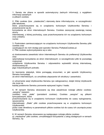 1. Serwis nie zbiera w sposób automatyczny żadnych informacji, z wyjątkiem informacji zawartych w plikach cookies. 2. Pliki cookies (tzw. „ciasteczka”) stanowią dane informatyczne, w szczególności pliki tekstowe, które przechowywane są w urządzeniu końcowym Użytkownika Serwisu i przeznaczone są do korzystania ze stron internetowych Serwisu. Cookies zazwyczaj zawierają nazwę strony internetowej, z której pochodzą, czas przechowywania ich na urządzeniu końcowym oraz unikalny numer. 3. Podmiotem zamieszczającym na urządzeniu końcowym Użytkownika Serwisu pliki cookies oraz uzyskującym do nich dostęp jest operator Serwisu PolitykaCookies.pl. 4. Pliki cookies wykorzystywane są w celu: a) dostosowania zawartości stron internetowych Serwisu do preferencji Użytkownika oraz optymalizacji korzystania ze stron internetowych; w szczególności pliki te pozwalają rozpoznać urządzenie Użytkownika Serwisu i odpowiednio wyświetlić stronę internetową, dostosowaną do jego indywidualnych potrzeb; b) tworzenia statystyk, które pomagają zrozumieć, w jaki sposób Użytkownicy Serwisu korzystają ze stron internetowych, co umożliwia ulepszanie ich struktury i zawartości; c) utrzymanie sesji Użytkownika Serwisu (po zalogowaniu), dzięki której Użytkownik nie musi na każdej podstronie Serwisu ponownie wpisywać loginu i hasła; 5. W ramach Serwisu stosowane są dwa zasadnicze rodzaje plików cookies: „sesyjne” (session cookies) oraz „stałe” (persistent cookies). Cookies „sesyjne” są plikami tymczasowymi, które przechowywane są w urządzeniu końcowym Użytkownika do czasu wylogowania, opuszczenia internetowej). „Stałe” pliki cookies przechowywane są w urządzeniu końcowym Użytkownika przez czas określony w parametrach plików cookies lub do czasu ich usunięcia przez Użytkownika. 6. W ramach Serwisu stosowane są następujące rodzaje plików cookies: a) „niezbędne” pliki cookies, umożliwiające korzystanie z usług dostępnych w ramach Serwisu, np. uwierzytelniające pliki uwierzytelniania w ramach Serwisu; cookies wykorzystywane do usług wymagających b) pliki cookies służące do zapewnienia bezpieczeństwa, np. wykorzystywane do wykrywania nadużyć w zakresie uwierzytelniania w ramach Serwisu; c) „wydajnościowe” pliki cookies, umożliwiające zbieranie informacji o sposobie korzystania ze stron internetowych Serwisu; d)„funkcjonalne” pliki cookies, umożliwiające „zapamiętanie” wybranych przez Użytkownika ustawień i personalizację interfejsu Użytkownika, np. w zakresie wybranego języka lub regionu, z którego pochodzi Użytkownik, rozmiaru czcionki, wyglądu strony internetowej itp.; 7. W wielu przypadkach oprogramowanie służące do przeglądania stron internetowych (przeglądarka internetowa) domyślnie dopuszcza przechowywanie plików cookies w urządzeniu końcowym Użytkownika. Użytkownicy Serwisu mogą dokonać w każdym strony internetowej czasie zmiany ustawień dotyczących plików cookies. Ustawienia te mogą zostać zmienione w szczególności w taki sposób, aby blokować automatyczną obsługę plików cookies w ustawieniach przeglądarki internetowej bądź informować o ich każdorazowym zamieszczeniu w urządzeniu Użytkownika Serwisu. Szczegółowe informacje o możliwości i sposobach obsługi plików cookies dostępne są w ustawieniach oprogramowania (przeglądarki internetowej). 8. Operator Serwisu informuje, że ograniczenia stosowania plików cookies mogą wpłynąć na niektóre funkcjonalności dostępne na stronach internetowych Serwisu. 9. Pliki cookies zamieszczane w urządzeniu końcowym Użytkownika Serwisu i wykorzystywane mogą być również przez współpracujących z operatorem Serwisu reklamodawców oraz partnerów. 10. Więcej informacji na temat plików cookies dostępnych jest pod w sekcji „Pomoc” w menu przeglądarki internetowe Co powinniśmy wiedzieć o „cookies”? Nie służą identyfikacji użytkowników i na ich podstawie w żaden sposób nie jest ustalana czyjakolwiek tożsamość; „cookies” identyfikują dane komputera i przeglądarki używanych do przeglądania stron internetowych – pozwalają np. dowiedzieć się czy dany komputer już odwiedzał stronę; dane pozyskane z „cookies” nie są w żaden sposób łączone z danymi osobowymi użytkowników pozyskanymi np. podczas rejestracji w serwisach; nie są szkodliwe ani dla nas ani dla naszych komputerów, czy smartfonów – nie wpływają na sposób ich działania; nie powodują zmian konfiguracyjnych w urządzeniach końcowych, ani w oprogramowaniu zainstalowanym na tych urządzeniach; domyślne parametry „ciasteczek” pozwalają na odczytanie informacji w nich zawartych jedynie serwerowi, który je utworzył; na podstawie naszych zachowań na odwiedzanych stronach internetowych przekazują do serwerów informacje, dzięki którym wyświetlana strona jest lepiej dopasowana do indywidualnych preferencji. Podstawowe rodzaje ciasteczek „Cookies” sesyjne – są to tymczasowe informacje przechowywane w pamięci przeglądarki do momentu zakończenia sesji przeglądarki, czyli do momentu jej zamknięcia. Te cookies są obowiązkowe, aby niektóre aplikacje lub funkcjonalności działały poprawnie. „Cookies” stałe – dzięki nim korzystanie z często odwiedzanych stron jest łatwiejsze (np. zapewniają optymalną nawigację, zapamiętują wybraną rozdzielczość, układ treści etc.). Te informacje pozostają pamięci przeglądarki przez dłuższy okres. Czas ten zależy od wyboru, którego można dokonać w ustawieniach przeglądarki. Ten rodzaj cookies zezwala na przekazywanie informacji na serwer za każdym razem, gdy odwiedzana jest dana strona. Stałe cookies są również nazywane jako tzw. śledzące „cookie” (ang. tracking cookies). „Cookies” podmiotów zewnętrznych – (ang. third parties cookies) – to informacje pochodzące np. z serwerów reklamowych, serwer