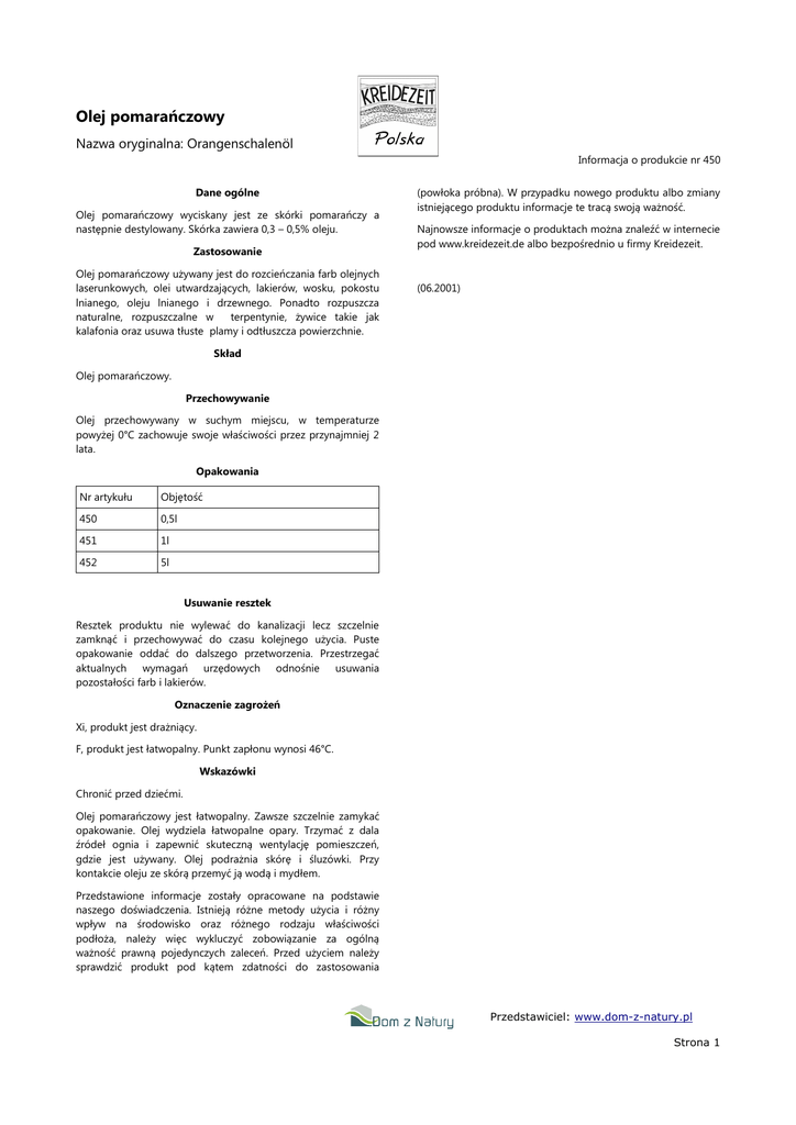 Olej pomarańczowy Nazwa oryginalna: Orangenschalenöl Informacja o produkcie nr 450 Dane ogólne Olej pomarańczowy wyciskany jest ze skórki pomarańczy a następnie destylowany. Skórka zawiera 0,3 – 0,5% oleju. Zastosowanie Olej pomarańczowy używany jest do rozcieńczania farb olejnych laserunkowych, olei utwardzających, lakierów, wosku, pokostu lnianego, oleju lnianego i drzewnego. Ponadto rozpuszcza naturalne, rozpuszczalne w terpentynie, żywice takie jak kalafonia oraz usuwa tłuste plamy i odtłuszcza powierzchnie. (powłoka próbna). W przypadku nowego produktu albo zmiany istniejącego produktu informacje te tracą swoją ważność. Najnowsze informacje o produktach można znaleźć w internecie pod www.kreidezeit.de albo bezpośrednio u firmy Kreidezeit. (06.2001) Skład Olej pomarańczowy. Przechowywanie Olej przechowywany w suchym miejscu, w temperaturze powyżej 0°C zachowuje swoje właściwości przez przynajmniej 2 lata. Opakowania Nr artykułu Objętość 450 0,5l 451 1l 452 5l Usuwanie resztek Resztek produktu nie wylewać do kanalizacji lecz szczelnie zamknąć i przechowywać do czasu kolejnego użycia. Puste opakowanie oddać do dalszego przetworzenia. Przestrzegać aktualnych wymagań urzędowych odnośnie usuwania pozostałości farb i lakierów. Oznaczenie zagrożeń Xi, produkt jest drażniący. F, produkt jest łatwopalny. Punkt zapłonu wynosi 46°C. Wskazówki Chronić przed dziećmi. Olej pomarańczowy jest łatwopalny. Zawsze szczelnie zamykać opakowanie. Olej wydziela łatwopalne opary. Trzymać z dala źródeł ognia i zapewnić skuteczną wentylację pomieszczeń, gdzie jest używany. Olej podrażnia skórę i śluzówki. Przy kontakcie oleju ze skórą przemyć ją wodą i mydłem. Przedstawione informacje zostały opracowane na podstawie naszego doświadczenia. Istnieją różne metody użycia i różny wpływ na środowisko oraz różnego rodzaju właściwości podłoża, należy więc wykluczyć zobowiązanie za ogólną ważność prawną pojedynczych zaleceń. Przed użyciem należy sprawdzić produkt pod kątem zdatności do zastosowania Przedstawiciel: www.dom-z-natury.pl Strona 1