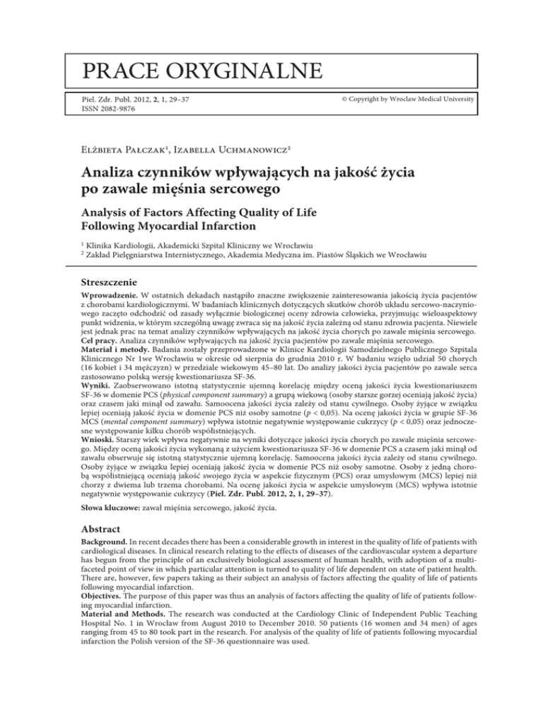 prace oryginalne Piel. Zdr. Publ. 2012, 2, 1, 29–37 ISSN 2082-9876 © Copyright by Wroclaw Medical University Elżbieta Pałczak1, Izabella Uchmanowicz2 Analiza czynników wpływających na jakość życia po zawale mięśnia sercowego Analysis of Factors Affecting Quality of Life Following Myocardial Infarction 1 2 Klinika Kardiologii, Akademicki Szpital Kliniczny we Wrocławiu Zakład Pielęgniarstwa Internistycznego, Akademia Medyczna im. Piastów Śląskich we Wrocławiu Streszczenie Wprowadzenie. W ostatnich dekadach nastąpiło znaczne zwiększenie zainteresowania jakością życia pacjentów z chorobami kardiologicznymi. W badaniach klinicznych dotyczących skutków chorób układu sercowo-naczyniowego zaczęto odchodzić od zasady wyłącznie biologicznej oceny zdrowia człowieka, przyjmując wieloaspektowy punkt widzenia, w którym szczególną uwagę zwraca się na jakość życia zależną od stanu zdrowia pacjenta. Niewiele jest jednak prac na temat analizy czynników wpływających na jakość życia chorych po zawale mięśnia sercowego. Cel pracy. Analiza czynników wpływających na jakość życia pacjentów po zawale mięśnia sercowego. Materiał i metody. Badania zostały przeprowadzone w Klinice Kardiologii Samodzielnego Publicznego Szpitala Klinicznego Nr 1we Wrocławiu w okresie od sierpnia do grudnia 2010 r. W badaniu wzięło udział 50 chorych (16 kobiet i 34 mężczyzn) w przedziale wiekowym 45–80 lat. Do analizy jakości życia pacjentów po zawale serca zastosowano polską wersję kwestionariusza SF-36. Wyniki. Zaobserwowano istotną statystycznie ujemną korelację między oceną jakości życia kwestionariuszem SF-36 w domenie PCS (physical component summary) a grupą wiekową (osoby starsze gorzej oceniają jakość życia) oraz czasem jaki minął od zawału. Samoocena jakości życia zależy od stanu cywilnego. Osoby żyjące w związku lepiej oceniają jakość życia w domenie PCS niż osoby samotne (p < 0,05). Na ocenę jakości życia w grupie SF-36 MCS (mental component summary) wpływa istotnie negatywnie występowanie cukrzycy (p < 0,05) oraz jednoczesne występowanie kilku chorób współistniejących. Wnioski. Starszy wiek wpływa negatywnie na wyniki dotyczące jakości życia chorych po zawale mięśnia sercowego. Między oceną jakości życia wykonaną z użyciem kwestionariusza SF-36 w domenie PCS a czasem jaki minął od zawału obserwuje się istotną statystycznie ujemną korelację. Samoocena jakości życia zależy od stanu cywilnego. Osoby żyjące w związku lepiej oceniają jakość życia w domenie PCS niż osoby samotne. Osoby z jedną chorobą współistniejącą oceniają jakość swojego życia w aspekcie fizycznym (PCS) oraz umysłowym (MCS) lepiej niż chorzy z dwiema lub trzema chorobami. Na ocenę jakości życia w aspekcie umysłowym (MCS) wpływa istotnie negatywnie występowanie cukrzycy (Piel. Zdr. Publ. 2012, 2, 1, 29–37). Słowa kluczowe: zawał mięśnia sercowego, jakość życia. Abstract Background. In recent decades there has been a considerable growth in interest in the quality of life of patients with cardiological diseases. In clinical research relating to the effects of diseases of the cardiovascular system a departure has begun from the principle of an exclusively biological assessment of human health, with adoption of a multifaceted point of view in which particular attention is turned to quality of life dependent on state of patient health. There are, however, few papers taking as their subject an analysis of factors affecting the quality of life of patients following myocardial infarction. Objectives. The purpose of this paper was thus an analysis of factors affecting the quality of life of patients following myocardial infarction. Material and Methods. The research was conducted at the Cardiology Clinic of Independent Public Teaching Hospital No. 1 in Wrocław from August 2010 to December 2010. 50 patients (16 women and 34 men) of ages ranging from 45 to 80 took part in the research. For analysis of the quality of life of patients following myocardial infarction the Polish version of the SF-36 questionnaire was used. 30 E. Pałczak, I. Uchmanowicz Results. A statistically significant negative correlation was observed between the quality of life assessment of the SF-36 questionnaire in the physical component summary (PCS) and age group (older individuals assess quality of life as being lower) and time having elapsed since the infarction. Self-assessment of quality of life depends on marital status. Individuals in a relationship assess quality of life as being higher in the PCS than those who are single (p < 0.05). Assessment of quality of life in the SF-36 mental component summary (MCS) is affected negatively to a significant degree by the occurrence of diabetes (p < 0.05) and the simultaneous occurrence of several coexisting diseases. Conclusions. Higher age had a negative effect on the results for quality of life of patients following myocardial infarction. Between the quality of life assessment of the SF-36 questionnaire in the PCS and time having elapsed since the infarction a statistically significant negative correlation is observed. Self-assessment of quality of life depends on marital status. Individuals in a relationship assess quality of life as being higher in the PCS than those who are single. Individuals with one coexisting disease assess the quality of their life physically (PCS) and mentally (MCS) as being higher than patients with two or three diseases. Assessment of quality of life mentally (MCS) is affected negatively to a significant degree by the occurrence of diabetes (Piel. Zdr. Publ. 2012, 2, 1, 29–37). Key words: Acute Coronary Syndrome, quality of life. Głównym celem interwencji medycznej w chorobach układu krążenia jest podnoszenie jakości życia chorych przez eliminację lub zmniejszenie wpływu choroby. Przy wyborze badania jakości życia należy określić czy o