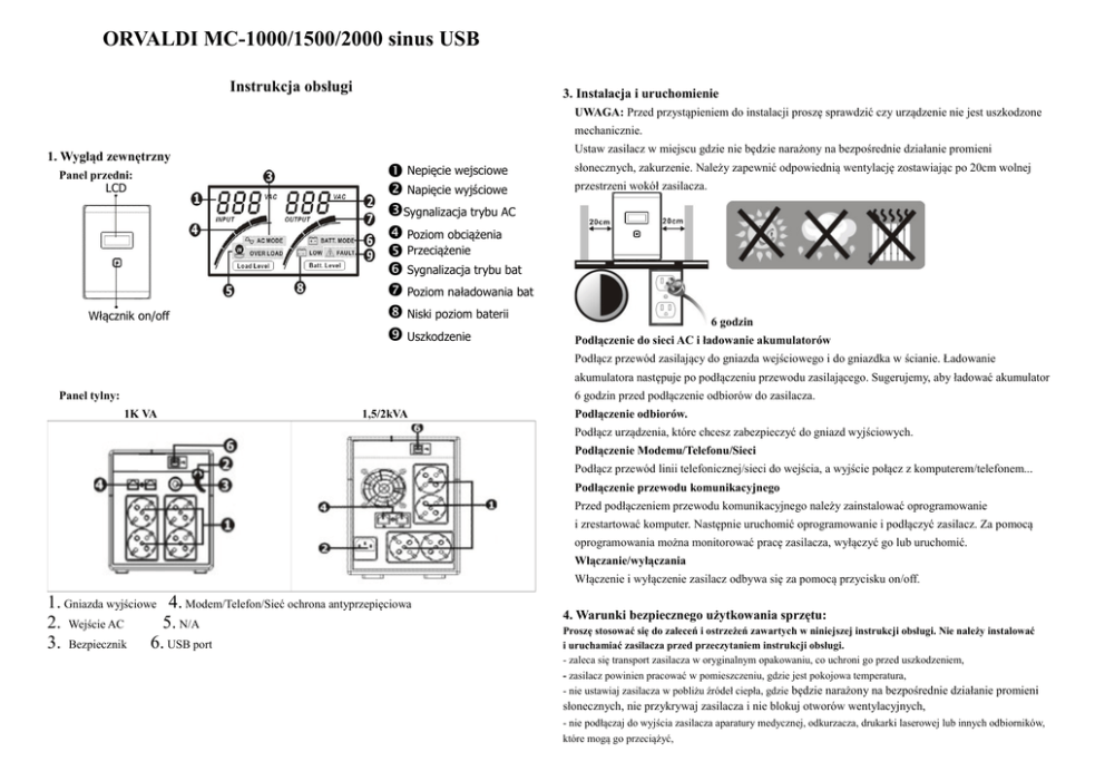 ORVALDI MC-1000/1500/2000 sinus USB Instrukcja obsługi 3. Instalacja i uruchomienie UWAGA: Przed przystąpieniem do instalacji proszę sprawdzić czy urządzenie nie jest uszkodzone mechanicznie. 1. Wygląd zewnętrzny Panel przedni: LCD Włącznik on/off Ustaw zasilacz w miejscu gdzie nie będzie narażony na bezpośrednie działanie promieni ➊ Nepięcie wejsciowe ➋ Napięcie wyjściowe ➌Sygnalizacja trybu AC ➍ Poziom obciążenia ➎ Przeciążenie ➏ Sygnalizacja trybu bat ➐ Poziom naładowania bat ➑ Niski poziom baterii ➒ Uszkodzenie słonecznych, zakurzenie. Należy zapewnić odpowiednią wentylację zostawiając po 20cm wolnej przestrzeni wokół zasilacza. 6 godzin Podłączenie do sieci AC i ładowanie akumulatorów Podłącz przewód zasilający do gniazda wejściowego i do gniazdka w ścianie. Ładowanie akumulatora następuje po podłączeniu przewodu zasilającego. Sugerujemy, aby ładować akumulator 6 godzin przed podłączenie odbiorów do zasilacza. Panel tylny: 1K VA 1,5/2kVA Podłączenie odbiorów. Podłącz urządzenia, które chcesz zabezpieczyć do gniazd wyjściowych. Podłączenie Modemu/Telefonu/Sieci Podłącz przewód linii telefonicznej/sieci do wejścia, a wyjście połącz z komputerem/telefonem... Podłączenie przewodu komunikacyjnego Przed podłączeniem przewodu komunikacyjnego należy zainstalować oprogramowanie i zrestartować komputer. Następnie uruchomić oprogramowanie i podłączyć zasilacz. Za pomocą oprogramowania można monitorować pracę zasilacza, wyłączyć go lub uruchomić. Włączanie/wyłączania Włączenie i wyłączenie zasilacz odbywa się za pomocą przycisku on/off. 1. Gniazda wyjściowe 4. Modem/Telefon/Sieć ochrona antyprzepięciowa 2. Wejście AC 5. N/A 3. Bezpiecznik 6. USB port 4. Warunki bezpiecznego użytkowania sprzętu: Proszę stosować się do zaleceń i ostrzeżeń zawartych w niniejszej instrukcji obsługi. Nie należy instalować i uruchamiać zasilacza przed przeczytaniem instrukcji obsługi. - zaleca się transport zasilacza w oryginalnym opakowaniu, co uchroni go przed uszkodzeniem, - zasilacz powinien pracować w pomieszczeniu, gdzie jest pokojowa temperatura, - nie ustawiaj zasilacza w pobliżu źródeł ciepła, gdzie będzie narażony na bezpośrednie działanie promieni słonecznych, nie przykrywaj zasilacza i nie blokuj otworów wentylacyjnych, - nie podłączaj do wyjścia zasilacza aparatury medycznej, odkurzacza, drukarki laserowej lub innych odbiorników, które mogą go przeciążyć, - nie łącz wejścia zasilacza z jego wyjściem, - po przetransportowaniu zasilacza z chłodnego otoczenia do cieplejszego odczekaj min 4 godziny, aby nie nastąpiło zjawisko skraplania się pary wodnej w urządzeniu, - przewody poprowadź tak aby nikt po nich nie chodził ani się o nie nie potykał, - przewód zasilający powinien być podłączony do gniazda z uziemieniem, - chroń zasilacz przed zlaniem, Nie należy umieszczać napojów lub innych naczyń zawierających ciecze lub w pobliżu urządzenia. - W razie nagłego wypadku, należy nacisnąć przycisk OFF i odłączyć przewód zasilający od zasilacza sieciowego aby prawidłowo wyłączyć UPS. - nie podłączaj listwy antyprzepięciowej do wyjścia UPS-a, - pomimo odłączenia UPS-a od zasilania nadal może wystąpić ryzyko porażenia prądem. Przed przystąpieniem do prac serwisowych należy odłączyć akumulator znajdujący się we wnętrzu zasilacza, - serwisowanie akumulatorów powinno być przeprowadzane lub nadzorowane przez personel posiadający odpowiednią wiedzę o akumulatorach i wymaganych środkach ostrożności. - w razie potrzeby wymień akumulatory na takiego samego typu i pojemności, - chroń wzrok pracując przy akumulatorach, - nie należy demontować urządzenia przed kontaktem z autoryzowanym centrum serwisowym, gdy wymagana jest obsługa lub naprawa. - aby zmniejszyć ryzyko obrażeń ciała zaleca się stosować wyłącznie akumulatory zaufanych producentów. NIE używać starych lub przeterminowanych baterii. - nie należy wrzucać akumulatorów do ognia, mogą wybuchnąć. Nie należy otwierać ani uszkadzać baterii lub akumulatorów. Uwolniony elektrolit jest szkodliwy dla skóry i oczu. - odłącz zasilacz przed czyszczeniem i nie używaj środków płynnych, - akumulator może stwarzać ryzyko porażenia prądem i wysokiego prądu zwarcia. Następujące środki ostrożności należy zachować przed wymianą baterii: 1) zdjąć metalowe przedmioty takie jak zegarek czy obrączka, 2) używać izolowanych narzędzi, 3) użyć gumowych rękawic lub butów, 4) nie kładź narządzi na akumulatorach, 5) wyłącz źródło ładowania akumulatorów przed przystąpieniem do wymiany, 5. Oprogramowanie do pobrania i instalacji (w modelu z portem komunikacyjnym) Wykonaj poniższe czynności, aby pobrać i zainstalować oprogramowanie monitorujące: 1. Odwiedź stronę http://www.power-software-download.com 2. Kliknij ikonę programu ViewPower a następnie wybierz żądany system operacyjny, aby pobrać oprogramowanie. 3. Postępuj zgodnie z instrukcjami wyświetlanymi na ekranie, aby zainstalować oprogramowanie. 4. Gdy komputer uruchomi się ponownie, oprogramowanie do monitorowania pojawi się jako ikona wtyczki w zasobniku systemowym, obok zegara. 6. Rozwiązywanie problemów Problem Powód Rozwiązanie Wyświetlacz LCD jest Zasilanie nie jest prawidłowo Sprawdź przewód zasilający. nieaktywny pomimo podłączone. podłączonej sieci zasilającej. Zasilanie jest podłączone doPodłącz przewód zasilający do gniazda wyjścia UPS-a. wejściowego UPS-a. Czas pracy bateryjnej uległ Akumulatory nie są w pełni Naładuj akumulatory przez min 6 godzin i skróceniu. naładowane. sprawdź ich pojemność. Jeżeli problem się powtarza skontaktuj się z dostawcą. Ikona ostrzeżenia świeci się lub słychać ciągłą sygnalizację dźwiękową. Ikona niski poziom naładowania akumulatora świeci się. Akumulatory 
