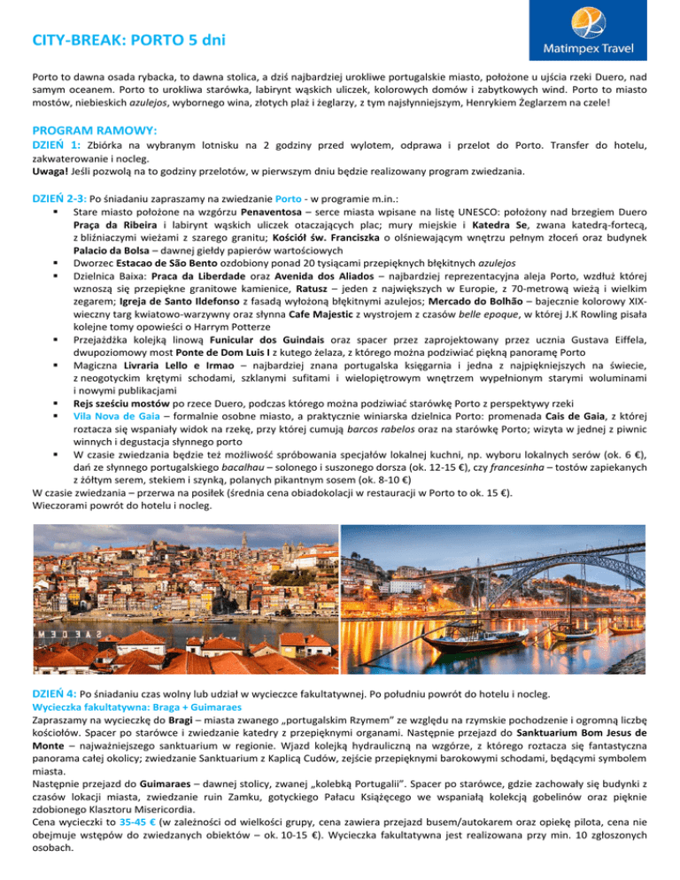 CITY-BREAK: PORTO 5 dni Porto to dawna osada rybacka, to dawna stolica, a dziś najbardziej urokliwe portugalskie miasto, położone u ujścia rzeki Duero, nad samym oceanem. Porto to urokliwa starówka, labirynt wąskich uliczek, kolorowych domów i zabytkowych wind. Porto to miasto mostów, niebieskich azulejos, wybornego wina, złotych plaż i żeglarzy, z tym najsłynniejszym, Henrykiem Żeglarzem na czele! PROGRAM RAMOWY: DZIEŃ 1: Zbiórka na wybranym lotnisku na 2 godziny przed wylotem, odprawa i przelot do Porto. Transfer do hotelu, zakwaterowanie i nocleg. Uwaga! Jeśli pozwolą na to godziny przelotów, w pierwszym dniu będzie realizowany program zwiedzania. DZIEŃ 2-3: Po śniadaniu zapraszamy na zwiedzanie Porto - w programie m.in.: Stare miasto położone na wzgórzu Penaventosa – serce miasta wpisane na listę UNESCO: położony nad brzegiem Duero Praça da Ribeira i labirynt wąskich uliczek otaczających plac; mury miejskie i Katedra Se, zwana katedrą-fortecą, z bliźniaczymi wieżami z szarego granitu; Kościół św. Franciszka o olśniewającym wnętrzu pełnym złoceń oraz budynek Palacio da Bolsa – dawnej giełdy papierów wartościowych Dworzec Estacao de São Bento ozdobiony ponad 20 tysiącami przepięknych błękitnych azulejos Dzielnica Baixa: Praca da Liberdade oraz Avenida dos Aliados – najbardziej reprezentacyjna aleja Porto, wzdłuż której wznoszą się przepiękne granitowe kamienice, Ratusz – jeden z największych w Europie, z 70-metrową wieżą i wielkim zegarem; Igreja de Santo Ildefonso z fasadą wyłożoną błękitnymi azulejos; Mercado do Bolhão – bajecznie kolorowy XIXwieczny targ kwiatowo-warzywny oraz słynna Cafe Majestic z wystrojem z czasów belle epoque, w której J.K Rowling pisała kolejne tomy opowieści o Harrym Potterze Przejażdżka kolejką linową Funicular dos Guindais oraz spacer przez zaprojektowany przez ucznia Gustava Eiffela, dwupoziomowy most Ponte de Dom Luis I z kutego żelaza, z którego można podziwiać piękną panoramę Porto Magiczna Livraria Lello e Irmao – najbardziej znana portugalska księgarnia i jedna z najpiękniejszych na świecie, z neogotyckim krętymi schodami, szklanymi sufitami i wielopiętrowym wnętrzem wypełnionym starymi woluminami i nowymi publikacjami Rejs sześciu mostów po rzece Duero, podczas którego można podziwiać starówkę Porto z perspektywy rzeki Vila Nova de Gaia – formalnie osobne miasto, a praktycznie winiarska dzielnica Porto: promenada Cais de Gaia, z której roztacza się wspaniały widok na rzekę, przy której cumują barcos rabelos oraz na starówkę Porto; wizyta w jednej z piwnic winnych i degustacja słynnego porto W czasie zwiedzania będzie też możliwość spróbowania specjałów lokalnej kuchni, np. wyboru lokalnych serów (ok. 6 €), dań ze słynnego portugalskiego bacalhau – solonego i suszonego dorsza (ok. 12-15 €), czy francesinha – tostów zapiekanych z żółtym serem, stekiem i szynką, polanych pikantnym sosem (ok. 8-10 €) W czasie zwiedzania – przerwa na posiłek (średnia cena obiadokolacji w restauracji w Porto to ok. 15 €). Wieczorami powrót do hotelu i nocleg. DZIEŃ 4: Po śniadaniu czas wolny lub udział w wycieczce fakultatywnej. Po południu powrót do hotelu i nocleg. Wycieczka fakultatywna: Braga + Guimaraes Zapraszamy na wycieczkę do Bragi – miasta zwanego „portugalskim Rzymem” ze względu na rzymskie pochodzenie i ogromną liczbę kościołów. Spacer po starówce i zwiedzanie katedry z przepięknymi organami. Następnie przejazd do Sanktuarium Bom Jesus de Monte – najważniejszego sanktuarium w regionie. Wjazd kolejką hydrauliczną na wzgórze, z którego roztacza się fantastyczna panorama całej okolicy; zwiedzanie Sanktuarium z Kaplicą Cudów, zejście przepięknymi barokowymi schodami, będącymi symbolem miasta. Następnie przejazd do Guimaraes – dawnej stolicy, zwanej „kolebką Portugalii”. Spacer po starówce, gdzie zachowały się budynki z czasów lokacji miasta, zwiedzanie ruin Zamku, gotyckiego Pałacu Książęcego we wspaniałą kolekcją gobelinów oraz pięknie zdobionego Klasztoru Misericordia. Cena wycieczki to 35-45 € (w zależności od wielkości grupy, cena zawiera przejazd busem/autokarem oraz opiekę pilota, cena nie obejmuje wstępów do zwiedzanych obiektów – ok. 10-15 €). Wycieczka fakultatywna jest realizowana przy min. 10 zgłoszonych osobach. DZIEŃ 5: Po śniadaniu wykwaterowanie i złożenie bagażu. Wycieczka zabytkowym tramwajem do Foz do Duoro – dawnej wioski rybackiej, a dziś jednej z najbardziej luksusowych dzielnic miasta, położonych przy samym ujściu rzeki do oceanu. Czas na wypoczynek, a dla chętnych spacer promenadą do latarni morskiej. Po południu powrót do hotelu i odebranie bagażu. Transfer na lotnisko, odprawa i przelot do kraju. HOTELE 3* położone w niewielkim oddaleniu od ścisłego centrum Porto, w pobliżu przystanku komunikacji miejskiej. Wszystkie hotele oferują zakwaterowanie w komfortowych pokojach 2-osobowych (możliwość 1 dostawki) z centralną klimatyzacją, łazienką, TV i telefonem. Wyżywienie: Śniadania kontynentalne PRZYKŁADOWY HOTEL: ŚWIADCZENIA ZAWARTE W CENIE: Przelot na wybranej trasie (wraz z opłatami lotniskowymi) Bagaż podręczny (cena NIE zawiera bagażu głównego, istnieje możliwość dopłaty do dużej walizki) Transfer lotnisko – hotel – lotnisko 4 noclegi w hotelu 3* Pokoje 2-osobowe z łazienkami 4 śniadania Opieka pilota Ubezpieczenie podstawowe Signal Iduna (KL do 10.000 €, NNW do 15.000 zł, CHP i bagaż do 1.000 zł) KOSZTY DODATKOWE: Orientacyjny koszt realizacji programu zwiedzania to 90-110 € (w zależności od wielkości grupy) - kwota ta obejmuje przejazdy komunikacją miejską i podmiejską podczas realizacji programu (w tym przejażdżkę zabytkowym tramwajem i kolejką linową), bilety wstępu do zwiedzanych obiektów wraz z kosztami ich rezerwacji (Kościół św. Franciszk