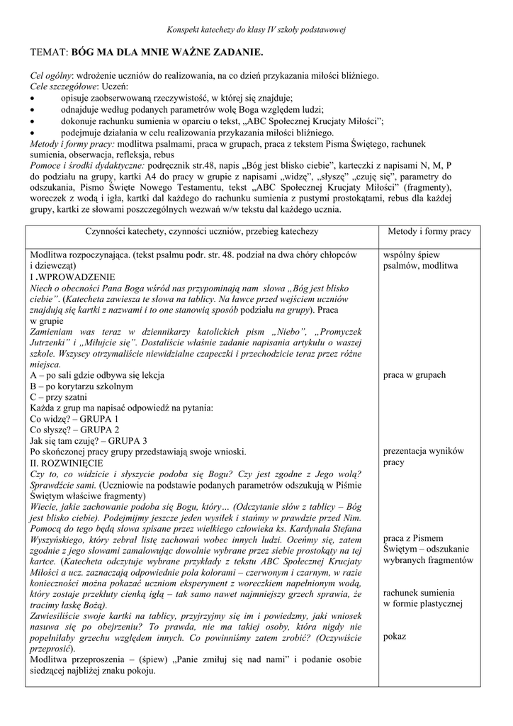 Konspekt katechezy do klasy IV szkoły podstawowej TEMAT: BÓG MA DLA MNIE WAŻNE ZADANIE. Cel ogólny: wdrożenie uczniów do realizowania, na co dzień przykazania miłości bliźniego. Cele szczegółowe: Uczeń: • opisuje zaobserwowaną rzeczywistość, w której się znajduje; • odnajduje według podanych parametrów wolę Boga względem ludzi; • dokonuje rachunku sumienia w oparciu o tekst, „ABC Społecznej Krucjaty Miłości”; • podejmuje działania w celu realizowania przykazania miłości bliźniego. Metody i formy pracy: modlitwa psalmami, praca w grupach, praca z tekstem Pisma Świętego, rachunek sumienia, obserwacja, refleksja, rebus Pomoce i środki dydaktyczne: podręcznik str.48, napis „Bóg jest blisko ciebie”, karteczki z napisami N, M, P do podziału na grupy, kartki A4 do pracy w grupie z napisami „widzę”, „słyszę” „czuję się”, parametry do odszukania, Pismo Święte Nowego Testamentu, tekst „ABC Społecznej Krucjaty Miłości” (fragmenty), woreczek z wodą i igła, kartki dal każdego do rachunku sumienia z pustymi prostokątami, rebus dla każdej grupy, kartki ze słowami poszczególnych wezwań w/w tekstu dal każdego ucznia. Czynności katechety, czynności uczniów, przebieg katechezy Modlitwa rozpoczynająca. (tekst psalmu podr. str. 48. podział na dwa chóry chłopców i dziewcząt) Ι .WPROWADZENIE Niech o obecności Pana Boga wśród nas przypominają nam słowa „Bóg jest blisko ciebie”. (Katecheta zawiesza te słowa na tablicy. Na ławce przed wejściem uczniów znajdują się kartki z nazwami i to one stanowią sposób podziału na grupy). Praca w grupie Zamieniam was teraz w dziennikarzy katolickich pism „Niebo”, „Promyczek Jutrzenki” i „Miłujcie się”. Dostaliście właśnie zadanie napisania artykułu o waszej szkole. Wszyscy otrzymaliście niewidzialne czapeczki i przechodzicie teraz przez różne miejsca. A – po sali gdzie odbywa się lekcja B – po korytarzu szkolnym C – przy szatni Każda z grup ma napisać odpowiedź na pytania: Co widzę? – GRUPA 1 Co słyszę? – GRUPA 2 Jak się tam czuję? – GRUPA 3 Po skończonej pracy grupy przedstawiają swoje wnioski. ΙΙ. ROZWINIĘCIE Czy to, co widzicie i słyszycie podoba się Bogu? Czy jest zgodne z Jego wolą? Sprawdźcie sami. (Uczniowie na podstawie podanych parametrów odszukują w Piśmie Świętym właściwe fragmenty) Wiecie, jakie zachowanie podoba się Bogu, który… (Odczytanie słów z tablicy – Bóg jest blisko ciebie). Podejmijmy jeszcze jeden wysiłek i stańmy w prawdzie przed Nim. Pomocą do tego będą słowa spisane przez wielkiego człowieka ks. Kardynała Stefana Wyszyńskiego, który zebrał listę zachowań wobec innych ludzi. Oceńmy się, zatem zgodnie z jego słowami zamalowując dowolnie wybrane przez siebie prostokąty na tej kartce. (Katecheta odczytuje wybrane przykłady z tekstu ABC Społecznej Krucjaty Miłości a ucz. zaznaczają odpowiednie pola kolorami – czerwonym i czarnym, w razie konieczności można pokazać uczniom eksperyment z woreczkiem napełnionym wodą, który zostaje przekłuty cienką igłą – tak samo nawet najmniejszy grzech sprawia, że tracimy łaskę Bożą). Zawiesiliście swoje kartki na tablicy, przyjrzyjmy się im i powiedzmy, jaki wniosek nasuwa się po obejrzeniu? To prawda, nie ma takiej osoby, która nigdy nie popełniłaby grzechu względem innych. Co powinniśmy zatem zrobić? (Oczywiście przeprosić). Modlitwa przeproszenia – (śpiew) „Panie zmiłuj się nad nami” i podanie osobie siedzącej najbliżej znaku pokoju. Metody i formy pracy wspólny śpiew psalmów, modlitwa praca w grupach prezentacja wyników pracy praca z Pismem Świętym – odszukanie wybranych fragmentów rachunek sumienia w formie plastycznej pokaz ΙΙΙ.PODSUMOWANIE Za kilka chwil pójdziecie na korytarz, do sali lekcyjnej, do szatni. Bóg pozostawia wam jednak ważne zadanie do zrobienia. Spróbujcie je odszyfrować w waszej grupie. (Rebus – chętne grupy podają swoje rozwiązanie) modlitwa przeproszenia rebus Zapis do zeszytu – temat: „Bóg ma dla mnie ważne zadanie”. Wklejenie słów wylosowanych i zaznaczenie realizowania ich w najbliższym tygodniu. Pomocą w dalszej pracy nad sobą, by żyć zgodnie z wolą Bożą niech będą słowa, które każdy z was wylosuje wychodząc z sali. Zwróćcie uwagę na to, nad czym powinniście popracować w tym najbliższym czasie i zaznaczcie swoje sukcesy w wypełnieniu tych słów. Życzę powodzenia. Opr. Małgorzata Kasperowicz Załącznik nr 1 TEKST „ABC SPOŁECZNEJ KRUCJATY MIŁOŚCI” (fragmenty) 1. 2. 3. 4. 5. 6. Szanuj każdego człowieka, bo Chrystus w nim mieszka. Myśl dobrze o wszystkich. Nie myśl źle o nikim. Staraj się nawet w najgorszym znaleźć cos dobrego. Mów życzliwie o drugich. Nie mów źle o bliźnich. Módl się za wszystkich nawet /nieprzyjaciół. Pracuj rzetelnie, bo z owoców twojej pracy korzystają inni, jak ty korzystasz z pracy drugich. 7. Czyń dobrze każdemu jakbyś pragnął, aby tobie czyniono. 8. Nie podnoś głosu. Nie rób przykrości, nie przeklinaj. 9. Przebaczaj wszystko, wszystkim nie chowaj urazy. 10. Zawsze pierwszy wyciągnij rękę do zgody. 11. Napraw krzywdę wyrządzoną słowem. 12. Bądź wrażliwy na drugiego człowieka. 13. Uspokajaj i okazuj dobroć. 14. Upomnij, gdy widzisz zło. (można niektóre wydrukować kolorem i wtedy posłużą do rachunku sumienia) Załącznik nr 2 PARAMETRY: • Mt 5, 44: A Ja wam powiadam: miłujcie waszych nieprzyjaciół i módlcie się za tych, którzy was prześladują. • Mt 25, 40: A Król im odpowie: Zaprawdę powiadam wam –Wszystko, co uczyniliście jednemu z tych moich braci najmniejszych Mnieście uczynili. • Mt 6, 14: Jeśli bowiem przebaczycie ludziom i prze - winienia i wam przebaczy Ojciec wasz niebieski. • Mt 7, 12: Wszystko, więc co byście chcieli, żeby wam ludzie czynili i wy im czyńcie. • Łk 17, 3: Jeśli brat twój