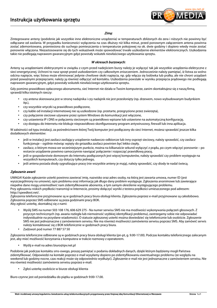 Instrukcja użytkowania sprzętu Zimą: Zintegrowane anteny (podobnie jak wszystkie inne elektroniczne urządzenia) w temperaturach zbliżonych do zera i niższych nie powinny być odłączane od zasilania. W przypadku konieczności wyłączenia na czas dłuższy niż kilka minut, przed ponownym załączeniem antena powinna zostać zdemontowana, przeniesiona do suchego pomieszczenia o temperaturze pokojowej na ok. dwie godziny i dopiero wtedy może zostać ponownie włączona. Niezastosowanie się do tych wskazówek może spowodować trwałe uszkodzenie elementów elektronicznych. Uszkodzenia takie nie podlegają naprawom gwarancyjnym gdyż powstały wskutek niewłaściwego użytkowania sprzętu. W okresach burzowych: Anteny są urządzeniami elektrycznymi w związku z czym przed nadejściem burzy należy je wyłączyć tak jak wszystkie urządzenia elektryczne z sieci energetycznej. Uchroni to nasz sprzęt przed uszkodzeniem czy całkowitym zniszczeniem. Jednocześnie należy pamiętać, iż listwa za wolno odcina napięcie, więc listwa może eliminować jedynie chwilowe skoki napięcia, np. gdy włącza się lodówka lub pralka, ale nie chroni urządzeń przed poważnymi przepięciami, należy ją również odłączyć od kontaktu. Uszkodzenia powstałe w wyniku przepięcia prądowego nie podlegają naprawom gwarancyjnym, gdyż powstały wskutek niewłaściwego użytkowania sprzętu. Gdy pomimo prawidłowo opłaconego abonamentu, sieć Internet nie działa w Twoim komputerze, zanim skontaktujesz się z naszą firmą, sprawdź kilka istotnych rzeczy: • • • • • • czy antena skierowana jest w stronę nadajnika i czy nadajnik nie jest przesłonięty (np. drzewem, nowo wybudowanym budynkiem itp.), czy wszystkie wtyczki są prawidłowo podłączone, czy kable od instalacji internetowej nie są uszkodzone (np. przetarte, przegryzione przez zwierzęta), czy połączenie sieciowe używane przez system Windows do komunikacji jest włączone, czy ustawienia IP i DNS w połączeniu sieciowym są prawidłowo wpisane lub ustawione na automatyczną konfigurację, czy dostępu do Internetu nie blokuje nieprawidłowo skonfigurowany program antywirusowy, firewall lub inna aplikacja. W zależności od typu instalacji, za pośrednictwem której Twój komputer jest podłączony do sieci Internet, możesz sprawdzić jeszcze kilka dodatkowych elementów: • • • • jeśli w instalacji jest zasilacz zasilający urządzenie nadawczo-odbiorcze lub inny osprzęt sieciowy, należy sprawdzić, czy zasilacz funkcjonuje – ogólnie mówiąc wpięty do gniazdka zasilacz powinien być lekko ciepły, zasilacz, o którym mowa we wcześniejszym punkcie, można na kilkanaście sekund wyłączyć z prądu, po czym włączyć ponownie – po restarcie urządzenie powinno samoczynnie nawiązać połączenie i rozpocząć prawidłową pracę, jeśli w gospodarstwie domowym do Internetu podłączonych jest więcej komputerów, należy sprawdzić czy problem występuje na wszystkich komputerach, czy dotyczy tylko jednego, jeśli antena posiada diody sygnalizujące pracę (nie wszystkie anteny je mają), należy sprawdzić, czy diody te nadal świecą. Zgłaszanie awarii UWAGA! Każde zgłoszenie usterki powinno zawierać imię, nazwisko oraz adres osoby, na którą jest zawarta umowa, numer ID (jest wyszczególniony na umowie), opis problemu oraz informację jak długo dany problem występuje. Zgłoszenia anonimowe lub zawierające niepełne dane mogą uniemożliwić nam zidentyfikowanie abonenta, a tym samym określenie występującego problemu. Przy zgłoszeniu niskich prędkości transmisji w Internecie, prosimy dołączyć wyniki z testera prędkości umieszczonego pod adresem: http://speedtest.net/. Zgłoszenia telefoniczne przyjmowane są w godzinach pracy biura obsługi klienta. Zgłoszenia poprzez e-mail przyjmowane są całodobowo. Zgłoszenia poprzez SMS odbierane są poza godzinami pracy BOK. Aby zgłosić usterkę, skontaktuj się z nami: • • Wyślij SMS na numer 503 108 176, 606 629 275 - Na numer serwisu SMS nie ma możliwości wykonywania połączeń głosowych. Z przyczyn technicznych (np. awaria rozległa lub niemożność szybkiej identyfikacji problemu), zastrzegamy sobie nie odpowiadać indywidualnie na przysłane wiadomości. O statusie zgłoszonej usterki można dowiedzieć się telefonicznie lub osobiście. Zgłoszenie SMS nie jest jednoznaczne z zamówieniem serwisu. Nie ma również możliwości zamówienia serwisu poprzez SMS. Aby zamówić serwis należy kontaktować się z BOK telefonicznie w godzinach pracy biura. Zadzwoń pod numer 77 887 57 50 Zgłoszenia telefoniczne odbierane są w godzinach pracy biura obsługi klienta (pn-pt, g. 9.00-17.00). Podczas kontaktu telefonicznego zalecanym jest, aby mieć możliwość korzystania z komputera w trakcie rozmowy z operatorem. • Wyślij e-mail na adres [email protected] Podobnie jak podczas kontaktu sms-owego, proszę pamiętać o podaniu dokładnych danych, dzięki którym będziemy mogli Państwa zidentyfikować. Odpowiedzi na kontakt poprzez e-mail wysyłamy dopiero po zidentyfikowaniu ewentualnego problemu (ze względu na weekend lub godziny nocne, czas reakcji może się odpowiednio wydłużyć). Zgłoszenie e-mail nie jest jednoznaczne z zamówieniem serwisu. Nie ma również możliwości zamówienia serwisu poprzez e-mail. • Zgłoś usterkę osobiście w biurze obsługi klienta Biuro czynne jest od poniedziałku do piątku w godzinach 9:00-17.00. Wzor modelowej umowy/regulaminu świadczenia usług telekomunikacyjnych przygotowany przez Krajową Izbę Komunikacji Ethernetowej w Warszawie Strona 1 z 1