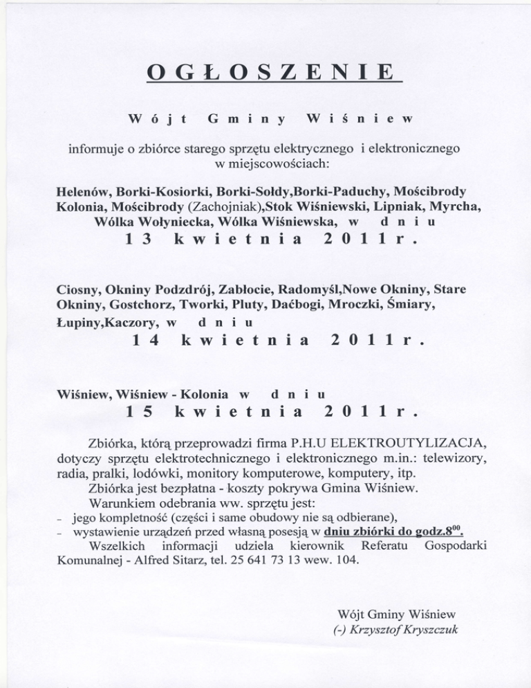 informuje o zbiórce starego sprzętu ele|<Ęcznego i elektronicznego