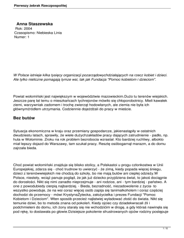 Pierwszy żebrak Rzeczpospolitej Anna Staszewska Rok: 2004 Czasopismo: Niebieska Linia Numer: 1 W Polsce istnieje kilka tysięcy organizacji pozarządowychdziałających na rzecz kobiet i dzieci. Ale tylko nieliczne pomagają tymze wsi, tak jak Fundacja "Pomoc kobietom i dzieciom". Powiat wołomiński jest największym w województwie mazowieckim.Dużo tu terenów wiejskich. Jeszcze parę lat temu o mieszkańcach tychrejonów mówiło się chłoporobotnicy. Mieli kawałek ziemi, warzywniak zadomem i trochę zwierząt hodowlanych, ale ziemia nie była ich głównymźródłem utrzymania. Codziennie dojeżdżali do pracy w mieście. Bez butów Sytuacja ekonomiczna w kraju oraz przemiany gospodarcze, jakienastąpiły w ostatnich dwudziestu latach, sprawiły, że wiele dużychzakładów pracy dających zatrudnienie - padło, np. huta w Wołominie. Zroku na rok problem bezrobocia wzrastał. Kto bardziej ruchliwy, albokto miał lepszy dojazd do Warszawy, tam szukał pracy. Resztę osóbogarnął marazm, a do domu zajrzała bieda. Choć powiat wołomiński znajduje się blisko stolicy, a Polskastoi u progu członkostwa w Unii Europejskiej, zdarza się - choć trudnow to uwierzyć - że zimą, kiedy popada więcej śniegu, dzieci z terenówwiejskich nie chodzą do szkoły, bo nie mają butów ani ciepłej odzieży.W Polsce, niestety, wciąż panuje pogląd, że jak już dziecko przyjdziena świat, to jakoś dociągnie do dorosłości. Nikt się nimi zanadto nieprzejmuje - ani rodzice, ani - tym bardziej - państwo. A one z powodubiedy cierpią najbardziej. - Bieda, bezradność, niezadowolenie z życia- to wszystko powoduje, że na wsi coraz więcej osób zapija się tanimalkoholem i coraz częściej dochodzi do przemocy - mówi KrystynaŻytecka, założycielka i prezes Fundacji "Pomoc Kobietom i Dzieciom". Wten sposób przecież najłatwiej wyładować złość do świata. Nikt się temunie dziwi, bo to metoda znana od pokoleń. Kiedy ojciec czy dziadekwracali źli i podchmieleni do domu, ich żony starały się nie wchodzićim w drogę, a gdy któraś nawinęła się pod rękę, to dostawała po głowie.Dzisiejsze pokolenie sfrustrowanych ojców rodziny postępuje 1/6 Pierwszy żebrak Rzeczpospolitej tak samo. Obrywa się oczywiście i dzieciom. Z takiego "gnoja" niewielejeszcze pożytku, a trzeba go nakarmić, ubrać - tylko kłopot. Dzieciwięc patrzą i uczą się. Dość wcześnie zaczynają pić alkohol, anarkotyki biorą nawet 8-latki. Najsmutniejsze jest to, że do tych ludzi niemal nikt niedociera z pomocą. W Polsce istnieje kilka tysięcy organizacjipozarządowych działających na rzecz dzieci. Ale tylko nielicznepomagają dzieciom z terenów wiejskich. - Nie kwestionuję tego, że organizacje działające w miastachsą potrzebne - mówi Żytecka. Ale prawda jest taka, że wygodnie jestusiąść za biurkiem, odebrać kilka telefonów, poprosić, żeby osobapotrzebująca pomocy do nas przyjechała. I ona pewnie dotrze. Do ludzina wsi trzeba natomiast dotrzeć samemu, a to już duża fatyga i mało ktochce się tak trudzić. Powiem jedno: w Warszawie dzieci nie mdleją zgłodu, a tam tak. Bo na samych kartoflach nie da się długo pociągnąć. Krystyna Żytecka nie boi się fatygi. Fundacja, którą założyłatrzy lata temu razem z mężem i kilkorgiem przyjaciół, jako terenswojego działania wybrała właśnie obszary wiejskie powiatuwołomińskiego. Z wykształcenia pani Krystyna jest technologiem żywienia. Onai jej mąż zawsze starali się pomagać ludziom. To było naturalne, tokwestia wrażliwości na ludzką krzywdę, a także echo ich własnych,życiowych doświadczeń. Pani Krystyna była dzieckiem adoptowanym i - jakmówi doświadczyła w dzieciństwie wiele zła. Kiedy dorosła i stała sięsamodzielna, przyrzekła sobie, że jeśli jakiekolwiek dziecko będziepotrzebowało jej pomocy, ona nigdy tego nie zlekceważy. Postawię na swoim W Fundacji nikt nie pobiera wynagrodzenia, tu pracuje się wyłączniecharytatywnie, a każdy grosz przeliczany jest drobiazgowo na obiady dladzieci, podręczniki szkolne, ubrania. Czasem pojawia się pokusa, abyzatrudnić sekretarkę, ale zaraz przychodzi na myśl, że przecież sąpilniejsze potrzeby. Nie lubią, kiedy ktoś, komu udzielili pomocy,obiecuje, że się odwdzięczy. Mówią wtedy: "Proszę pomóc komuś innemu iprzekazać pałeczkę dalej. Pani ktoś pomógł, to i pani może pomóc.Trzeba się tylko rozejrzeć". 2/6 Pierwszy żebrak Rzeczpospolitej Najbardziej aktywną osobą w Fundacji jest pani Krystyna,codziennie o piątej rano wsiada w swój prywatny samochód i rusza wteren: objeżdża wsie powiatu wołomińskiego. Codziennie też na jejliczniku przybywa minimum 200 kilometrów. Do Warszawy wraca po południulub wieczorem i bywa, że do północy pisze pisma. Biuro Fundacji zostało zorganizowane w kawalerce państwaŻyteckich, oni mieszkają obok. - Na początku kobiety po prostuprzychodziły do mojego samochodu porozmawiać - wspomina KrystynaŻytecka. Traktowały go trochę jak konfesjonał. Musiałam stopniowoprzełamywać ich nieufność, ale teraz zapraszają do swoich domów iwiedzą, że kiedy coś obiecam, to choćby się waliło i paliło, postawięna swoim. Ufają mi. Kiedyś jednej pani konkubent podpalił dom i w środku nocymusiała uciekać z trójką dzieci. Ocalało tylko to, co mieli na sobie.Pomoc społeczna zaproponowała rodzinie 2 tys. złotych na zrobienieremontu. Żytecka wściekła się i natychmiast pojechała do wójta i takdługo go przekonywała, że w końcu znalazł jakieś zastępcze mieszkanie.Potem udało się znaleźć sponsora, który kupił najpotrzebniejszy sprzętdomowy; z ambasady niemieckiej dostała meble, a transportem zajęła siępolicja. Żytecka mówi, że rząd powinien przyznać jej medal jakonajwiększemu żebrakowi Rzeczpospolitej. Jeśli czegoś bardzo potrzeba,ona to na pewno zdobędzie. Pomoc trzeba wychodzić Zaczęło się od pomocy socjalnej - szukała sponsoró