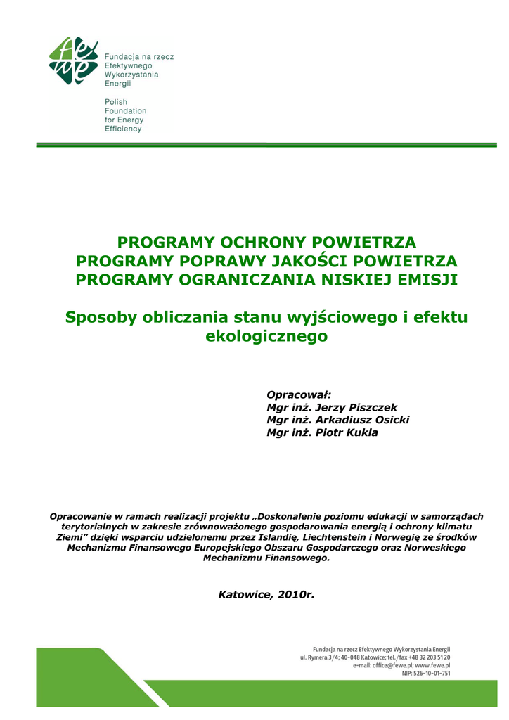 PROGRAMY OCHRONY POWIETRZA PROGRAMY POPRAWY JAKOŚCI POWIETRZA PROGRAMY OGRANICZANIA NISKIEJ EMISJI Sposoby obliczania stanu wyjściowego i efektu ekologicznego Opracował: Mgr inż. Jerzy Piszczek Mgr inż. Arkadiusz Osicki Mgr inż. Piotr Kukla Opracowanie w ramach realizacji projektu „Doskonalenie poziomu edukacji w samorządach terytorialnych w zakresie zrównoważonego gospodarowania energią i ochrony klimatu Ziemi” dzięki wsparciu udzielonemu przez Islandię, Liechtenstein i Norwegię ze środków Mechanizmu Finansowego Europejskiego Obszaru Gospodarczego oraz Norweskiego Mechanizmu Finansowego. Katowice, 2010r. I. RODZAJE EMISJI ZANIECZYSZCZEŃ Emisja zanieczyszczeń atmosferycznych składa się z dwóch grup: zanieczyszczeń stałych lotnych (pyłowych) oraz zanieczyszczeń gazowych (organicznych i nieorganicznych). Główną przyczyną powstawania zanieczyszczeń powietrza jest spalanie paliw, w tym: • w procesach energetycznego spalania paliw kopalnych, • w silnikach spalinowych napędzających pojazdy. Z uwagi na rodzaj źródła, emisję można podzielić na trzy rodzaje, a mianowicie: • emisję punktową (wysoka emisja), • emisję rozproszoną (niska emisja), • emisję komunikacyjną (emisja liniowa). W programach ograniczania niskiej emisji wyznacza się zwykle dla poszczególnych źródeł emisje takich substancji szkodliwych jak: SO2, NO2, CO, pył, B(α)P oraz CO2 wyrażoną w kg danej substancji na rok. Wyznaczono także emisję równoważną, czyli zastępczą. Emisja równoważna jest to wielkość ogólna emisji zanieczyszczeń pochodzących z określonego (ocenianego) źródła zanieczyszczeń, przeliczona na emisję dwutlenku siarki. Oblicza się ją poprzez sumowanie rzeczywistych emisji poszczególnych rodzajów zanieczyszczeń, emitowanych z danego źródła emisji i pomnożonych przez ich współczynniki toksyczności zgodnie ze wzorem: n E r = ∑ Et ⋅ K t t =1 gdzie: Er - emisja równoważna źródeł emisji, t - liczba różnych zanieczyszczeń emitowanych ze źródła emisji, Et - emisja rzeczywista zanieczyszczenia o indeksie t, Kt - współczynnik toksyczności zanieczyszczenia o indeksie t, który to współczynnik wyraża stosunek dopuszczalnej średniorocznej wartości stężenia dwutlenku siarki eSO2 do dopuszczalnej średniorocznej wartości stężenia danego zanieczyszczenia et co można określić wzorem: Kt = eSO2 et Współczynniki toksyczności zanieczyszczeń traktowane są jako stałe, gdyż są ilorazami wielkości określonych w Rozporządzenie MOŚZNiL z dnia 28 kwietnia 1998r w sprawie dopuszczalnych wartości stężeń niektórych substancji zanieczyszczających powietrze. 2 Emisja równoważna uwzględnia to, że do powietrza emitowane są równocześnie różnego rodzaju zanieczyszczenia o różnym stopniu toksyczności. Pozwala to na prowadzenie porównań stopnia uciążliwości poszczególnych źródeł emisji zanieczyszczeń emitujących różne związki. Umożliwia także w prosty, przejrzysty i przekonywujący sposób znaleźć wspólną miarę oceny szkodliwości różnych rodzajów zanieczyszczeń, a także wyliczać efektywność wprowadzanych usprawnień. II. WSKAŹNIKI EMISJI ZANIECZYSZCZEŃ Dla danego źródła ciepła oraz stosowanego w nim paliwa istnieją wskaźnikowe wartości emisji różnych zanieczyszczeń gazowych oraz stałych lotnych. W chwili obecnej w kraju istnieją wskaźniki do obliczeń emisji zanieczyszczeń opracowane przez nieistniejące już Ministerstwo Ochrony Środowiska, Zasobów Naturalnych i Leśnictwa w Materiałach informacyjno-instruktażowych MOŚZNiL 1/96. Materiały te określają metodologię wyznaczania jednostkowych wskaźników emisji dla kilku rodzajów paliw (węgiel, koks, olej opałowy i gaz wysokometanowy) spalanych w różnych typach kotłów. O ile wątpliwości, co do jakości i zasadności stosowania w analizach emisyjnych wskaźników dla paliw ciekłych i gazowych nie ma, to w przypadku wskaźników przyjmowanych dla kotłów węglowych (dla kotłów o małej mocy przyjmowano do tej pory wskaźniki określone jako: „kotły z paleniskami z rusztem stałym i ciągiem naturalnym – płomieniowe i inne”) takie zastrzeżenia już się pojawiają. Obecnie jednym z podstawowych źródeł wiarygodnych informacji na temat technik i sposobów spalania paliw węglowych w Polsce jest Instytut Chemicznej Przeróbki Węgla w Zabrzu. Porównując wskaźniki emisji zanieczyszczeń pochodzące z badań i pomiarów IChPW na rzeczywistych urządzeniach ze wskaźnikami obliczonymi zgodnie z przytoczonymi materiałami MOŚZNiL zauważa się bardzo duże rozbieżności (rys. 1) sięgające czasami kilkuset procent. Wobec tak niewiarygodnie dużych sprzeczności, w niniejszym opracowaniu jako właściwe przyjęto wskaźniki jednostkowej emisji zanieczyszczeń opracowane przez IChPW jako, organu wyspecjalizowanego w tego typu badaniach. Przyjęte do dalszych obliczeń wskaźniki to średnie arytmetyczne wskaźników emisji dla kotłów węglowych komorowych, a także retortowych, zaczerpnięte z opublikowanych pod patronatem Marszałka Województwa Śląskiego przez IChPW materiałów seminaryjnych „Czysta i zielona energia – czyste powietrze w województwie śląskim” (autorzy opracowania: Krystyna Kubica, Jerzy Raińczak). Dla paliw gazowych i ciekłych przyjmuje się zwykle wskaźniki emisji z materiałów MOŚZNiL. Przyjęte do analiz jednostkowe wskaźniki emisji zanieczyszczeń zamieszczono w tabeli 2. 3 100 Wskaźnik j ednostkow ej emisj i zanieczyszczeń [kg/Mg] 100 80 60 48,8 40 20 9,6 1 0 SO2 20 15 11,9 3,1 3,1 NO2 CO pył Rodzaj zanieczyszczenia Maretiały MOŚZNiL 0,7 B(a)P Średnia z analiz IChPW dla kotłów komorowy ch Rysunek 1. Porównanie wskaźników emisji zanieczyszczeń przy spalaniu węgla w kotłach małej mocy obliczonych zgodnie z wytycznymi MOŚZNiL oraz przyjętych jako średnie z analiz IChPW w Zabrzu wyrażone w kg (B(a)P wyrażany w gramach) z