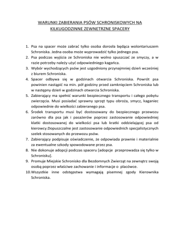 WARUNKI ZABIERANIA PSÓW SCHRONISKOWYCH NA KILKUGODZINNE ZEWNETRZNE SPACERY 1. Psa na spacer może zabrać tylko osoba dorosła będąca wolontariuszem Schroniska. Jedna osoba może wyprowadzić tylko jednego psa. 2. Psa podczas wyjścia ze Schroniska nie wolno spuszczać ze smyczy, a w razie potrzeby należy użyć odpowiedniego kagańca. 3. Wybór wychodzących psów jest uzgodniony przynajmniej dzień wcześniej z biurem Schroniska. 4. Spacer odbywa się w godzinach otwarcia Schroniska. Powrót psa powinien nastąpić na min. pół godziny przed zamknięciem Schroniska lub w następny dzień w godzinach otwarcia Schroniska. 5. Zabierający ma spełnić warunki bezpiecznego transportu i całego pobytu zwierzęcia. Musi posiadać sprawny sprzęt typu obroża, smycz, kaganiec odpowiednie do wielkości zabieranego psa. 6. Środek transportu musi być dostosowany do bezpiecznego przewozu zarówno dla psa jak i pasażerów poprzez zastosowanie odpowiedniej klatki dostosowanej do wielkości psa lub kratki oddzielającej psa od kierowcy.Dopuszczalne jest zastosowanie odpowiednich specjalistycznych szelek stosowanych do przewozu psów. 7. Zabierający podpisuje oświadczenie, że odpowiada prawnie i materialnie za ewentualne szkody spowodowane przez psa. 8. Nie dokonuje adopcji podczas spaceru [adopcje przeprowadza się tylko w Schronisku]. 9. Promuje Miejskie Schronisko dla Bezdomnych Zwierząt na zewnątrz swoją osobą poprzez właściwe zachowanie i informacje o placówce. 10.Wszystkie inne odstępstwa wymagają pisemnej zgody Kierownika Schroniska. OŚWIADCZENIE Oświadczam, ze zabieram psa nr …………………………………………………………… na swoją wyłączną odpowiedzialność własnym środkiem transportu. Środek transportu, którym będę podróżować z psem jest do tego przystosowany. Nie będę miał roszczeń wobec schroniska w przypadku spowodowania przez zwierzę szkód na mojej osobie lub osobie innych pasażerów oraz w mieniu, tj. moim samochodzie. Za szkody wobec osób trzecich spowodowane przez zwierzę lub z jego udziałem odpowiadam osobiście całym majątkiem. Odpowiadam też za szkodę na zwierzęciu. Zgadzam się i będę się stosować do określonych przez Schronisko warunków zabierania psów na zewnętrzne spacery. …………………………………………………………………………………………………………………………. Data i czytelny podpis