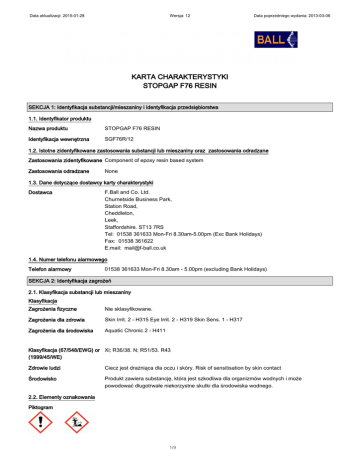 Data aktualizacji: 2015-01-28 Wersja: 12 Data poprzedniego wydania: 2013-03-06 KARTA CHARAKTERYSTYKI STOPGAP F76 RESIN SEKCJA 1: Identyfikacja substancji/mieszaniny i identyfikacja przedsiębiorstwa 1.1. Identyfikator produktu Nazwa produktu STOPGAP F76 RESIN Identyfikacja wewnętrzna SGF76R/12 1.2. Istotne zidentyfikowane zastosowania substancji lub mieszaniny oraz zastosowania odradzane Zastosowania zidentyfikowane Component of epoxy resin based system Zastosowania odradzane None 1.3. Dane dotyczące dostawcy karty charakterystyki Dostawca F.Ball and Co. Ltd. Churnetside Business Park, Station Road, Cheddleton, Leek, Staffordshire. ST13 7RS Tel: 01538 361633 Mon-Fri 8.30am-5.00pm (Exc Bank Holidays) Fax: 01538 361622 E.mail: [email protected] 1.4. Numer telefonu alarmowego Telefon alarmowy 01538 361633 Mon-Fri 8.30am - 5.00pm (excluding Bank Holidays) SEKCJA 2: Identyfikacja zagrożeń 2.1. Klasyfikacja substancji lub mieszaniny Klasyfikacja Zagrożenia fizyczne Nie sklasyfikowane. Zagrożenia dla zdrowia Skin Irrit. 2 - H315 Eye Irrit. 2 - H319 Skin Sens. 1 - H317 Zagrożenia dla środowiska Aquatic Chronic 2 - H411 Klasyfikacja (67/548/EWG) or Xi; R36/38. N; R51/53. R43 (1999/45/WE) Zdrowie ludzi Ciecz jest drażniąca dla oczu i skóry. Risk of sensitisation by skin contact Środowisko Produkt zawiera substancję, która jest szkodliwa dla organizmów wodnych i może powodować długotrwałe niekorzystne skutki dla środowiska wodnego. 2.2. Elementy oznakowania Piktogram 1/9 Data aktualizacji: 2015-01-28 Wersja: 12 Data poprzedniego wydania: 2013-03-06 STOPGAP F76 RESIN Hasło ostrzegawcze Uwaga Zwroty wskazujące rodzaj zagrożenia H315 Działa drażniąco na skórę. H317 Może powodować reakcję alergiczną skóry. H319 Działa drażniąco na oczy. H411 Działa toksycznie na organizmy wodne, powodując długotrwałe skutki. Zwroty wskazujące środki ostrożności P264 Dokładnie umyć zanieczyszczoną skórę po użyciu. P273 Unikać uwolnienia do środowiska. P280 Stosować rękawice ochronne/odzież ochronną/ochronę oczu/ochronę twarzy. P302+P352 W PRZYPADKU KONTAKTU ZE SKÓRĄ: Umyć dużą ilością wody. P305+P351+P338 W PRZYPADKU DOSTANIA SIĘ DO OCZU: Ostrożnie płukać wodą przez kilka minut. Wyjąć soczewki kontaktowe, jeżeli są i można je łatwo usunąć. Nadal płukać. P313 Zasięgnąć porady/zgłosić się pod opiekę lekarza. P501 Zawartość/pojemnik usuwać zgodnie z krajowymi przepisami. Zawiera PRODUKT REAKCJI BISFENOLU A Z EPICHLOROHYDRYNĄ; ŻYWICA EPOKSYDOWA (ŚREDNIA MASA CZĄSTECZKOWA < 700), BISPHENOL TYPE F EPOXY RESIN, POCHODNE MONO[(C12-14-ALKILOKSY)METYLOWE] OKSIRANU, C13/15 ALKYLGLYCIDYL ETHER 2.3. Inne zagrożenia SEKCJA 3: Skład/informacja o składnikach 3.2. Mieszaniny PRODUKT REAKCJI BISFENOLU A Z EPICHLOROHYDRYNĄ; ŻYWICA EPOKSYDOWA (ŚREDNIA MASA CZĄSTECZKOWA < 700) Numer CAS: 25068-38-6 30-60% Numer WE: 500-033-5 Klasyfikacja Skin Irrit. 2 - H315 Eye Irrit. 2 - H319 Skin Sens. 1 - H317 Aquatic Chronic 2 - H411 Numer rejestracji REACH: 012119456619-26 Klasyfikacja (67/548/EWG) or (1999/45/WE) R43 Xi;R36/38 N;R51/53 BISPHENOL TYPE F EPOXY RESIN Numer CAS: 54208-63-8 1-10% Numer WE: 500-033-5 Klasyfikacja Skin Irrit. 2 - H315 Eye Irrit. 2 - H319 Skin Sens. 1 - H317 Aquatic Chronic 2 - H411 Klasyfikacja (67/548/EWG) or (1999/45/WE) Xi;R36/38. N;R51/53. R43. 2/9 Data aktualizacji: 2015-01-28 Wersja: 12 Data poprzedniego wydania: 2013-03-06 STOPGAP F76 RESIN POCHODNE MONO[(C12-14-ALKILOKSY)METYLOWE] OKSIRANU Numer CAS: 68609-97-2 1-10% Numer rejestracji REACH: 012119485289 Klasyfikacja Skin Irrit. 2 - H315 Skin Sens. 1 - H317 Klasyfikacja (67/548/EWG) or (1999/45/WE) R43 Xi;R38 C13/15 ALKYLGLYCIDYL ETHER Numer CAS: 68081-84-5 1-5% Numer WE: 268-358-2 Klasyfikacja Skin Irrit. 2 - H315 Eye Irrit. 2 - H319 Skin Sens. 1 - H317 Aquatic Chronic 2 - H411 Klasyfikacja (67/548/EWG) or (1999/45/WE) Xi;R36/38. N;R51/53. R43. N-METYLO-2-PIROLIDON <1% Numer CAS: 872-50-4 Numer WE: 212-828-1 Klasyfikacja Skin Irrit. 2 - H315 Eye Irrit. 2 - H319 Repr. 1B - H360D STOT SE 3 - H335 Numer rejestracji REACH: 012119472430-46-xxxx Klasyfikacja (67/548/EWG) or (1999/45/WE) Repr. Cat. 2;R61 Xi;R36/37/38 Pełny tekst zwrotów wskazujących rodzaj zagrożenia (zwrotów R) i określeń zagrożeń jest przedstawiony w sekcji 16. Uwagi dotyczące składu Epoxy resin blend. SEKCJA 4: Środki pierwszej pomocy 4.1. Opis środków pierwszej pomocy Informacje ogólne Przenieść osobę poszkodowaną z dala od źródła zanieczyszczenia. Wdychanie Natychmiast przenieść poszkodowanego na świeże powietrze. Zasięgnąć porady medycznej jeśli dyskomfort się utrzymuje. Połknięcie Dokładnie wypłukać usta wodą. Podać duże ilości wody do picia. Nie wywoływać wymiotów. Natychmiast wezwać pomoc medyczną. Kontakt ze skórą Natychmiast zdjąć zanieczyszczoną odzież i umyć skórę wodą z mydłem. Get medical attention if irritation persists after washing. Kontakt z oczami Natychmiast spłukać dużą ilością wody. Kontynuować płukanie przez co najmniej 15 minut i zasięgnąć porady medycznej. 4.2. Najważniejsze ostre i opóźnione objawy oraz skutki narażenia Informacje ogólne Nasilenie opisanych objawów będzie różnić się w zależności od stężenia i czasu narażenia. Wdychanie Może powodować dyskomfort. Połknięcie Może wywoływać złe samopoczucie w przypadku spożycia. 3/9 Data aktualizacji: 2015-01-28 Wersja: 12 Data poprzedniego wydania: 2013-03-06 STOPGAP F76 RESIN Kontakt ze skórą Podrażnienie skóry. Może powodować reakcję alergiczną skóry. Kontakt z oczami Działa drażniąco na oczy. Objawy następujące po nadmiernej ekspozycji mogą być następujące: Zaczerwienienie. Ból. 4.3. Wskazania dotyczące wszelkiej natychmiastowej pomocy lekarskiej i szczególnego postępowania z poszkodowanym Wskazówki dla lekarza Leczyć objawowo. SEKCJA 5: Postępowanie w przypadku pożaru 5.1. Środki gaśnicze Odpowiednie środki g