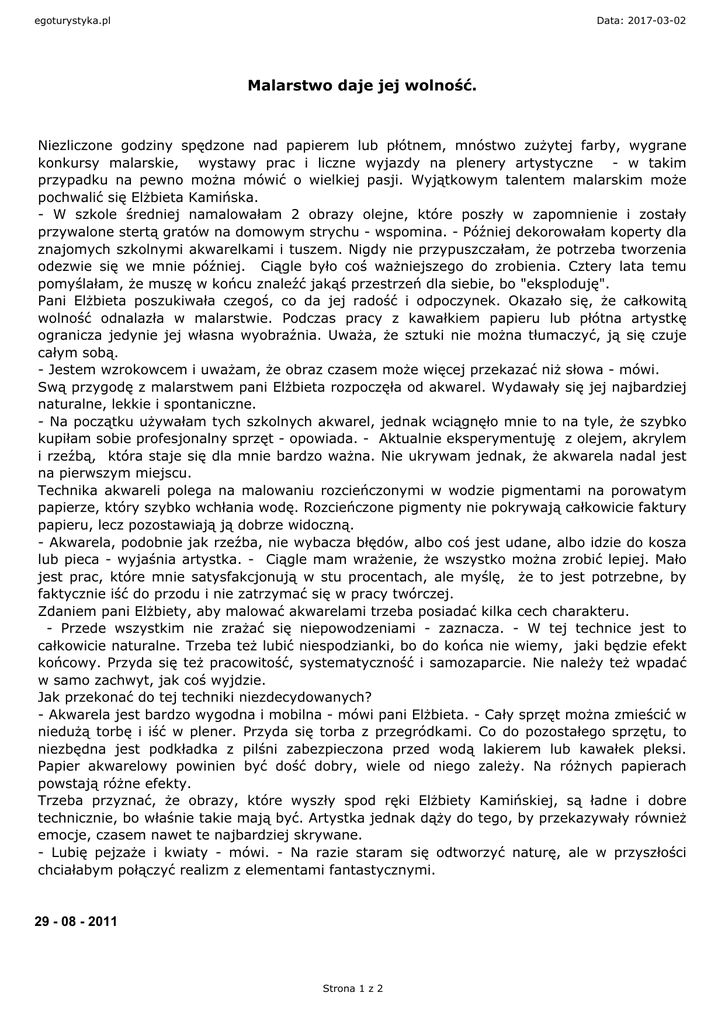 egoturystyka.pl Data: 2017-03-02 Malarstwo daje jej wolność. Niezliczone godziny spędzone nad papierem lub płótnem, mnóstwo zużytej farby, wygrane konkursy malarskie, wystawy prac i liczne wyjazdy na plenery artystyczne - w takim przypadku na pewno można mówić o wielkiej pasji. Wyjątkowym talentem malarskim może pochwalić się Elżbieta Kamińska. - W szkole średniej namalowałam 2 obrazy olejne, które poszły w zapomnienie i zostały przywalone stertą gratów na domowym strychu - wspomina. - Później dekorowałam koperty dla znajomych szkolnymi akwarelkami i tuszem. Nigdy nie przypuszczałam, że potrzeba tworzenia odezwie się we mnie później. Ciągle było coś ważniejszego do zrobienia. Cztery lata temu pomyślałam, że muszę w końcu znaleźć jakąś przestrzeń dla siebie, bo "eksploduję". Pani Elżbieta poszukiwała czegoś, co da jej radość i odpoczynek. Okazało się, że całkowitą wolność odnalazła w malarstwie. Podczas pracy z kawałkiem papieru lub płótna artystkę ogranicza jedynie jej własna wyobraźnia. Uważa, że sztuki nie można tłumaczyć, ją się czuje całym sobą. - Jestem wzrokowcem i uważam, że obraz czasem może więcej przekazać niż słowa - mówi. Swą przygodę z malarstwem pani Elżbieta rozpoczęła od akwarel. Wydawały się jej najbardziej naturalne, lekkie i spontaniczne. - Na początku używałam tych szkolnych akwarel, jednak wciągnęło mnie to na tyle, że szybko kupiłam sobie profesjonalny sprzęt - opowiada. - Aktualnie eksperymentuję z olejem, akrylem i rzeźbą, która staje się dla mnie bardzo ważna. Nie ukrywam jednak, że akwarela nadal jest na pierwszym miejscu. Technika akwareli polega na malowaniu rozcieńczonymi w wodzie pigmentami na porowatym papierze, który szybko wchłania wodę. Rozcieńczone pigmenty nie pokrywają całkowicie faktury papieru, lecz pozostawiają ją dobrze widoczną. - Akwarela, podobnie jak rzeźba, nie wybacza błędów, albo coś jest udane, albo idzie do kosza lub pieca - wyjaśnia artystka. - Ciągle mam wrażenie, że wszystko można zrobić lepiej. Mało jest prac, które mnie satysfakcjonują w stu procentach, ale myślę, że to jest potrzebne, by faktycznie iść do przodu i nie zatrzymać się w pracy twórczej. Zdaniem pani Elżbiety, aby malować akwarelami trzeba posiadać kilka cech charakteru. - Przede wszystkim nie zrażać się niepowodzeniami - zaznacza. - W tej technice jest to całkowicie naturalne. Trzeba też lubić niespodzianki, bo do końca nie wiemy, jaki będzie efekt końcowy. Przyda się też pracowitość, systematyczność i samozaparcie. Nie należy też wpadać w samo zachwyt, jak coś wyjdzie. Jak przekonać do tej techniki niezdecydowanych? - Akwarela jest bardzo wygodna i mobilna - mówi pani Elżbieta. - Cały sprzęt można zmieścić w niedużą torbę i iść w plener. Przyda się torba z przegródkami. Co do pozostałego sprzętu, to niezbędna jest podkładka z pilśni zabezpieczona przed wodą lakierem lub kawałek pleksi. Papier akwarelowy powinien być dość dobry, wiele od niego zależy. Na różnych papierach powstają różne efekty. Trzeba przyznać, że obrazy, które wyszły spod ręki Elżbiety Kamińskiej, są ładne i dobre technicznie, bo właśnie takie mają być. Artystka jednak dąży do tego, by przekazywały również emocje, czasem nawet te najbardziej skrywane. - Lubię pejzaże i kwiaty - mówi. - Na razie staram się odtworzyć naturę, ale w przyszłości chciałabym połączyć realizm z elementami fantastycznymi. 29 - 08 - 2011 Strona 1 z 2 egoturystyka.pl Data: 2017-03-02 Malarstwo daje jej wolność. Administrator egoturystyka.pl Administrator Strona 2 z 2